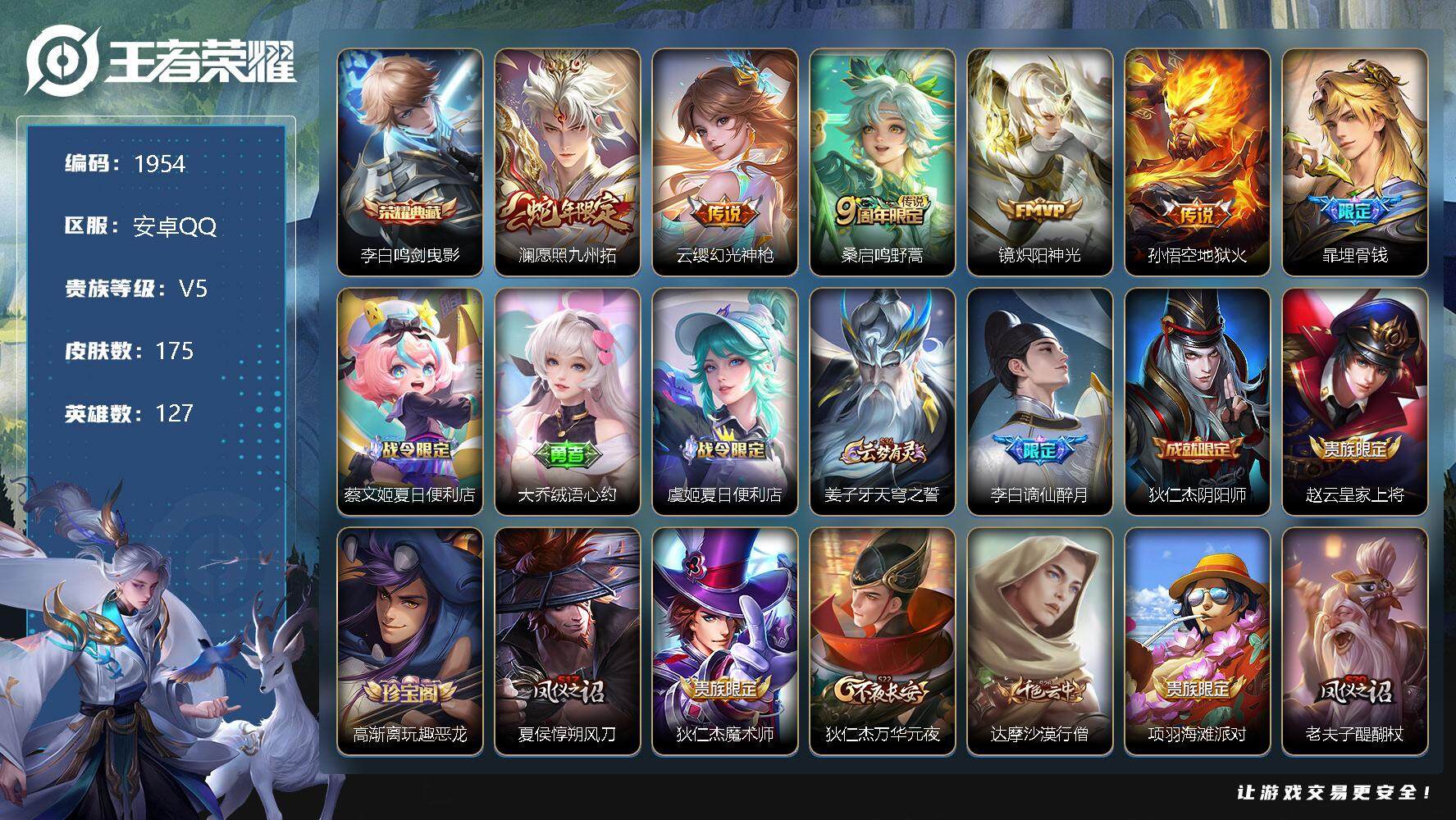 [13082417]安卓Q-V4-永恒钻石III段位-127英雄-175皮肤-1典藏-0珍品无双-0无双-0珍品传说-5传说-36史诗 【荣耀典藏】:李白鸣剑曳影 【传说皮肤】:澜愿照九州拓,云缨幻光神枪,桑启鸣野蒿,镜炽阳神光,孙悟空地狱火 【限定皮肤】:暃埋骨钱,蔡文姬夏日便利店,大乔绒语心约,虞姬夏日便利店,姜子牙天穹之誓,李白谪仙醉月,狄仁杰阴阳师,赵云皇家上将,高渐离玩趣恶龙,夏侯惇朔风刀,狄仁杰魔术师,狄仁杰万华元夜,达摩沙漠行僧,项羽海滩派对,老夫子醍醐杖,程咬金演武夺筹,兰陵王金庭之子,孙悟空大圣娶亲,孙悟空孙行者,牛魔御旌,李元芳云中旅人,钟馗驱傩正仪,鬼谷子原初探秘者,鬼谷子五谷丰年,铠青龙志,苏烈千军破阵,弈星混沌棋,沈梦溪大漠名商,明世隐疑决卦,裴擒虎擒涛扼浪,米莱狄御霄,盾山御銮,猪八戒猪悟能,上官婉儿梁祝,鲁班大师探海日志,桑启海盐诗旅,司空震地狱燃心,阿古朵江河有灵,张良古海寻踪,鬼谷子天穹祈灯,沈梦溪龙舞盛年,鲁班七号蔬乡物语,李元芳蔬乡物语,刘邦剑破天穹,程咬金群星魔术团,镜青焰无极,项羽苍威无极,周瑜熔金海岸 【年限皮肤】:铠青龙志 【赛季限定】:夏侯惇朔风刀,狄仁杰万华元夜,达摩沙漠行僧,老夫子醍醐杖,程咬金演武夺筹,兰陵王金庭之子,张良古海寻踪,牛魔御旌,李元芳云中旅人,钟馗驱傩正仪,鬼谷子原初探秘者,苏烈千军破阵,弈星混沌棋,沈梦溪大漠名商,明世隐疑决卦,裴擒虎擒涛扼浪,米莱狄御霄,盾山御銮,鲁班大师探海日志,桑启海盐诗旅,鬼谷子天穹祈灯,刘邦剑破天穹,姜子牙天穹之誓 【战令限定】:蔡文姬夏日便利店,虞姬夏日便利店,司空震地狱燃心,鲁班七号蔬乡物语,李元芳蔬乡物语,镜青焰无极,项羽苍威无极 【史诗皮肤】:露娜紫霞仙子,赵云皇家上将,甄姬冰雪圆舞曲,狄仁杰魔术师,宫本武藏鬼剑武藏,孙尚香水果甜心,妲己魅力维加斯,墨子金属风暴,李白千年之狐,韩信白龙吟,刘邦德古拉伯爵,夏侯惇乘风破浪,兰陵王暗隐猎兽者,雅典娜冰冠公主,安琪拉心灵骇客,百里守约特工魅影,蔡文姬舞动绿茵,李元芳逐浪之夏,阿轲节奏热浪,铠青龙志,孙悟空大圣娶亲,狄仁杰鹰眼统帅,上官婉儿梁祝,西施诗语江南,孙悟空孙行者,猪八戒猪悟能,鬼谷子五谷丰年,刘禅电玩爆裂旋风,司空震地狱燃心,阿古朵江河有灵,鲁班七号蔬乡物语,镜青焰无极,蔡文姬夏日便利店,暃埋骨钱,李白谪仙醉月,周瑜百相守梦 【其