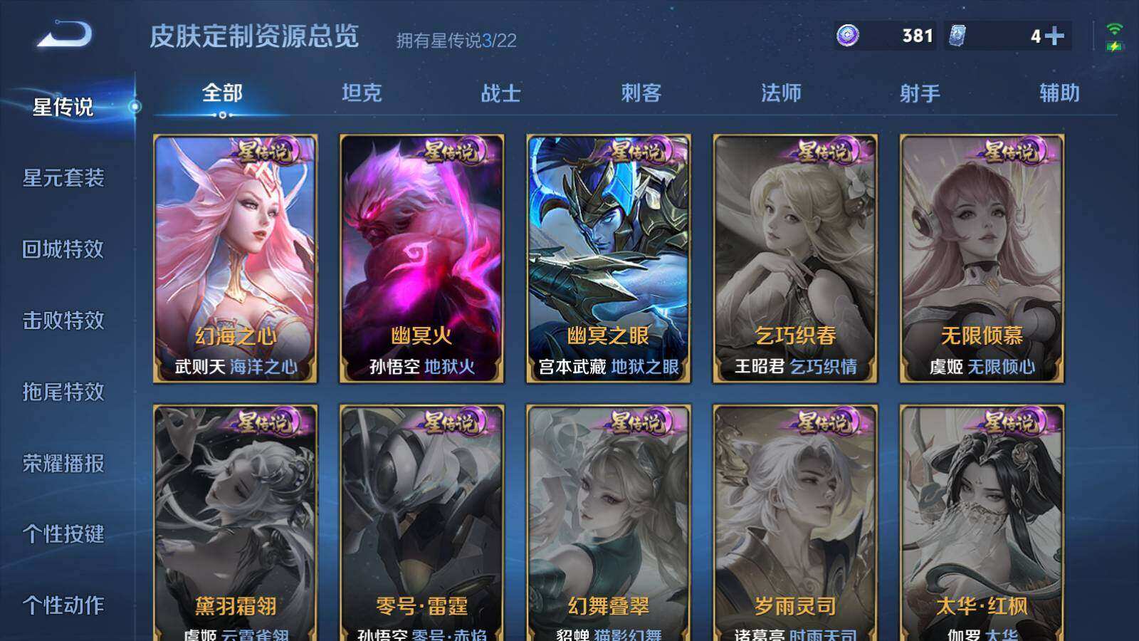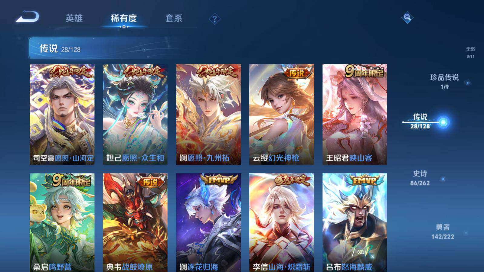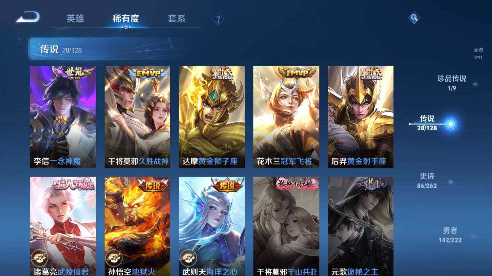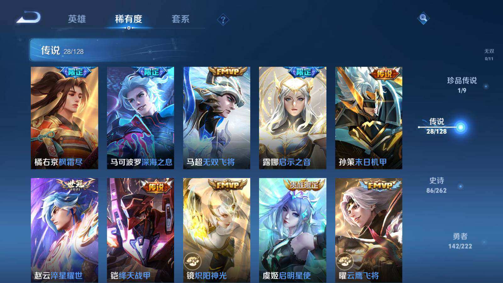 【传说皮肤】:后羿神树通天,司空震愿照山河定,妲己愿照众生和,澜愿照九州拓,云缨幻光神枪,王昭君映山客,桑启鸣野蒿,典韦战鼓燎原,澜逐花归海,李信山海炽霜斩,吕布怒海麟威,橘右京枫霜尽,马可波罗深海之息,马超无双飞将,露娜启示之音,孙策末日机甲,赵云淬星耀世,铠绛天战甲,镜炽阳神光,虞姬启明星使,曜云鹰飞将,李信一念神魔,干将莫邪久胜战神,达摩黄金狮子座,花木兰冠军飞将,后羿黄金射手座,诸葛亮武陵仙君,孙悟空地狱火,武则天海洋之心