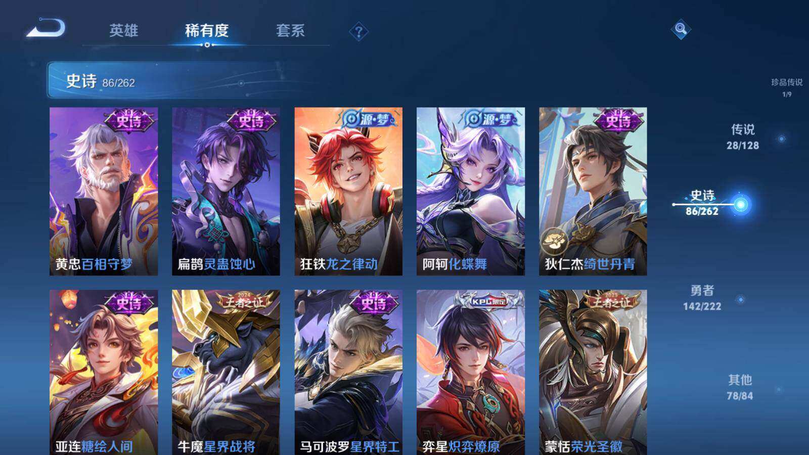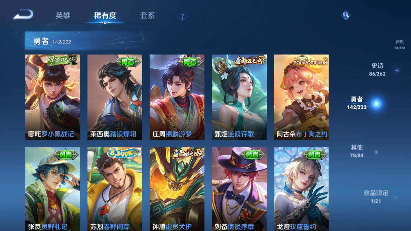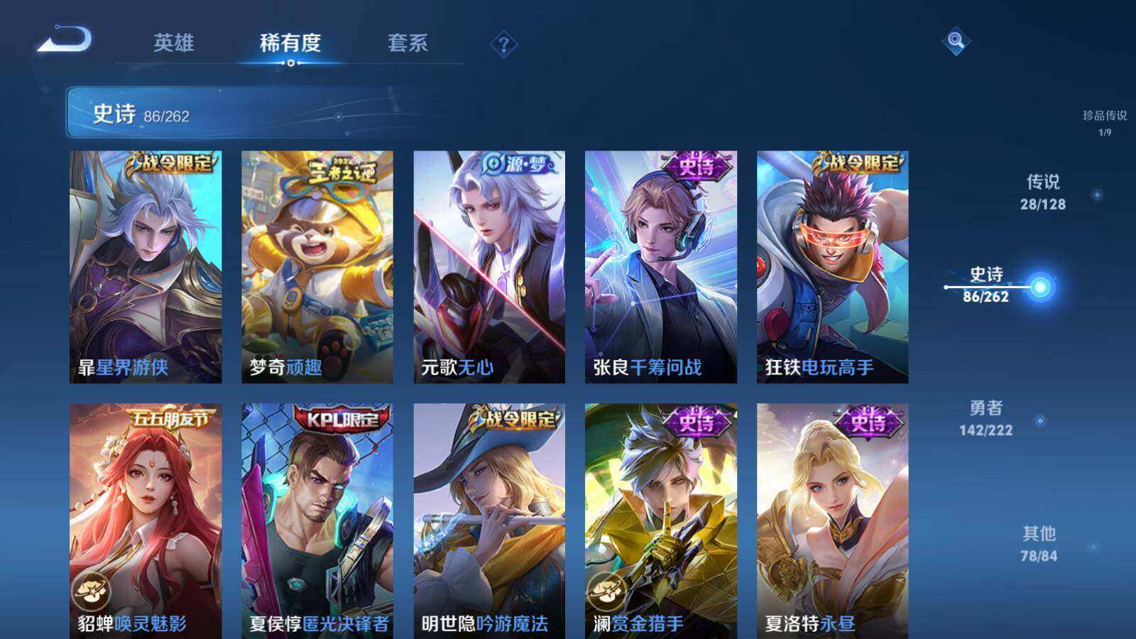 扁鹊炼金王,虞姬凯尔特女王,白起狰,太乙真人饕餮,芈月重明,典韦穷奇,狂铁御狮,米莱狄御霄,牛魔御旌,盾山御銮,夏侯惇朔风刀,明世隐疑决卦,老夫子醍醐杖,鬼谷子原初探秘者,狄仁杰万华元夜,程咬金演武夺筹,钟馗驱傩正仪,苏烈千军破阵,吕布猎兽之王,女娲朔望之晖,钟馗神迹守卫,鲁班七号狮舞东方,沈梦溪星空之诺,李元芳银河之约,马可波罗暗影游猎,蒙犽狂想玩偶喵,元歌云间偶戏,弈星混沌棋,达摩沙漠行僧,兰陵王金庭之子,沈梦溪大漠名商,李元芳云中旅人,桑启海盐诗旅,裴擒虎擒涛扼浪,鲁班大师探海日志