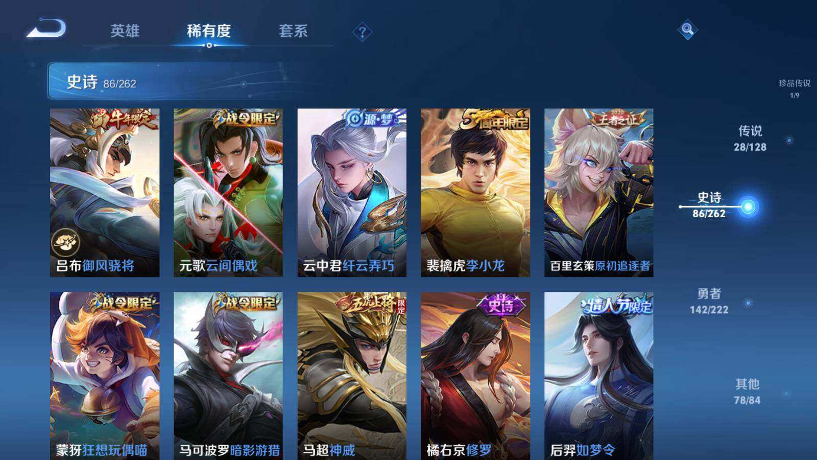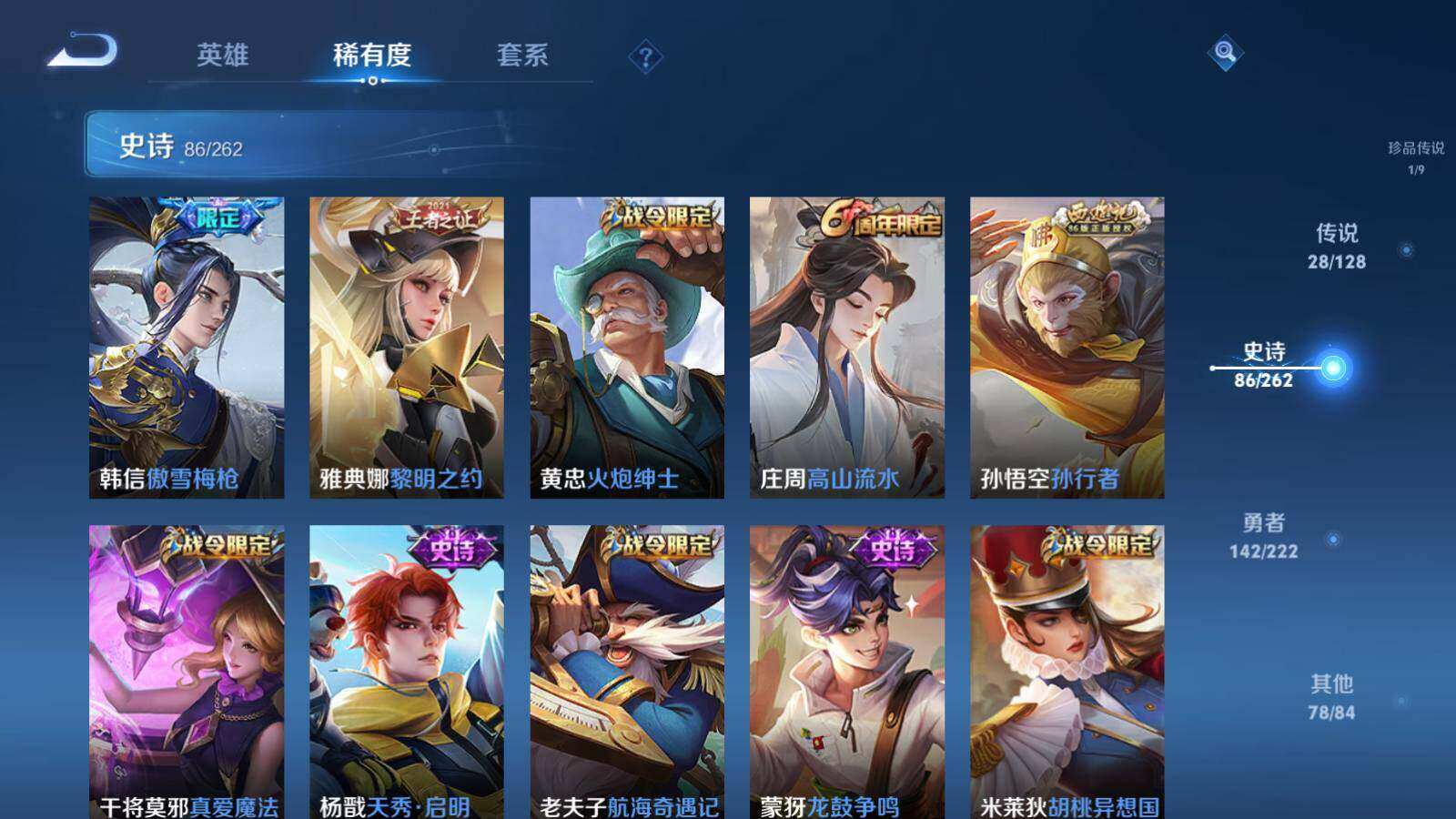 【限定皮肤】:白起狰,姜子牙天穹之誓,狄仁杰阴阳师,虞姬凯尔特女王,赵云皇家上将,墨子神迹守卫,孙尚香蔷薇恋人,鲁班七号狮舞东方,庄周高山流水,高渐离死亡摇滚,扁鹊炼金王,白起夜都怪侠,芈月重明,芈月幻夜卜梦,吕布猎兽之王,吕布御风骁将,周瑜赤莲之焰,元歌云间偶戏,元歌无心,夏侯惇朔风刀,夏侯惇匿光决锋者,典韦穷奇,马可波罗暗影游猎,马可波罗深海之息,狄仁杰魔术师,狄仁杰万华元夜,达摩星际陆战队,达摩沙漠行僧,项羽海滩派对,老夫子醍醐杖,老夫子航海奇遇记,程咬金演武夺筹,露娜启示之音,韩信傲雪梅枪,王昭君午后时光,兰陵王金庭之子,橘右京枫霜尽,亚瑟潮玩骑士王,孙悟空大圣娶亲,孙悟空孙行者,牛魔御旌,后羿如梦令,后羿圣弓游侠,李元芳银河之约,李元芳云中旅人,虞姬启明星使,钟馗神迹守卫,钟馗驱傩正仪,女娲朔望之晖,干将莫邪真爱魔法,雅典娜单词大作战,雅典娜黎明之约,蔡文姬繁星吟游,太乙真人饕餮,太乙真人华丽摇滚,鬼谷子原初探秘者,诸葛亮武陵仙君,黄忠火炮绅士,铠青龙志,苏烈千军破阵,百里玄策原初追逐者,弈星混沌棋,梦奇顽趣,沈梦溪星空之诺,沈梦溪大漠名商,明世隐疑决卦,明世隐吟游魔法,裴擒虎李小龙,裴擒虎擒涛扼浪,狂铁御狮,狂铁电玩高手,米莱狄御霄,米莱狄胡桃异想国,云中君纤云弄巧,李信山海炽霜斩,盾山御銮,猪八戒西部大镖客,上官婉儿梁祝,嫦娥暖冬兔眠,蒙犽狂想玩偶喵,鲁班大师探海日志,桑启海盐诗旅,暃星界游侠,艾琳女武神,蒙恬荣光圣徽,鬼谷子天穹祈灯,沈梦溪龙