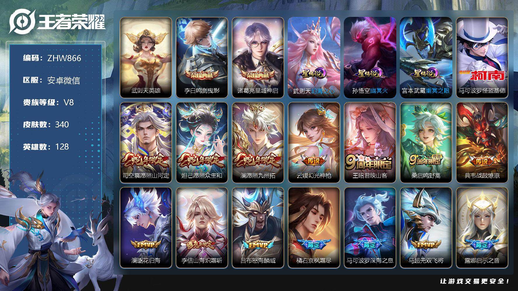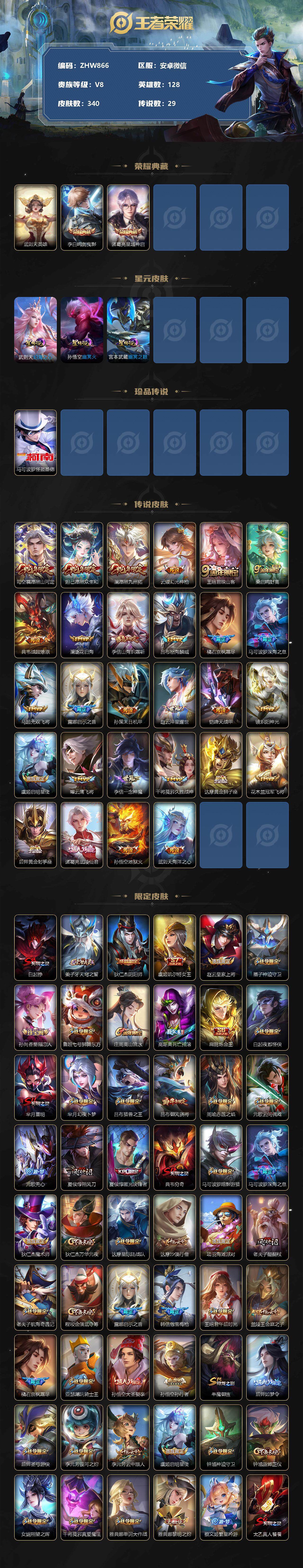 - [12296663]V10 6典藏 1无双 2珍品传说 28传说 126英雄 363皮肤 典藏英雄武则天 可修改实名 优质装备:天鹅之梦(小乔典藏),无限飓风号(高达),杀手不太冷,大秦宣太后,全息碎影(猴子典藏),神鉴启示录,韩信群星魔术团(韩信无双),朽木白哉,黑崎一护,黄金狮子座,黄金射手座,绛天战甲(鸡嘴战神),黄金白羊座,久胜战神,炽阳神光,云霓雀翎,末日机甲-孙尚香(绿蚂蚱),地狱火,仲夏夜之梦(大飞蛾),零号·赤焰,海洋之心,地狱之眼,胖达荣荣,时之恋人-刘备(电焊工),超时空战士-狄仁杰,艾琳觅芳踪 传说皮:云诺千山,幻光神枪 珍宝阁皮:优雅恋人,女武神 限定皮:愿照·山河定(司空震年限),鸣野蒿,白虎志(电光耗子),凤求凰(白切鸡),太华(伽罗年限),时之彼端,魔法小厨娘,神威(电光马子),飞衡(韩信年限),玄嵩(庄周年限),五谷丰年,幽恒(沐浴露),武圣,梁祝,天狼狩猎者,龙胆,烈魂,岱宗(典韦年限),虎魄,天狼征服者,李小龙,永曜之星,如梦令-嫦娥,如梦令-后羿,孙行者,天魔缭乱,神奇女侠 史诗皮:鸭鸭历险记-刘禅,化蝶舞,灵蛊蚀心,龙之律动,雪豹·霜爪,布丁狗之誓,石田雨龙,百相守梦-黄忠,织梦人,遇见神鹿,紫霞仙子,苍穹之光,电玩小子(小书包),白龙吟,黄金分割率,特工魅影,千年之狐,魅语,无限星赏官,冰冠公主,青蛇,偶像歌手,晚萤,暗夜猫娘,龙骑士(小龙虾),末日机甲-吕布,猫狗日记-孙策,猫狗日记-大乔,乱世虎臣,节奏热浪,修罗,女仆咖啡,摇滚巨星,水果甜心,绅士熊喵,天才门将,星夜王子,心灵骇客,功夫厨神,德古拉伯爵,暗隐猎兽者,幽灵船长,鬼剑武藏,心灵战警,舞动绿茵,地狱岩魂,诗语江南,纤云弄巧,繁星吟游(呼啦呼啦),缤纷独角兽,乘风破浪,逐浪之夏,月团寄思,水晶猎龙者,曙光守护者,箭羽风息,金属风暴,原初追逐者,圣诞狂欢,圣诞恋歌,鹰眼统帅,暗夜贵公子,魅力维加斯,黎明之约,未来纪元-赵云