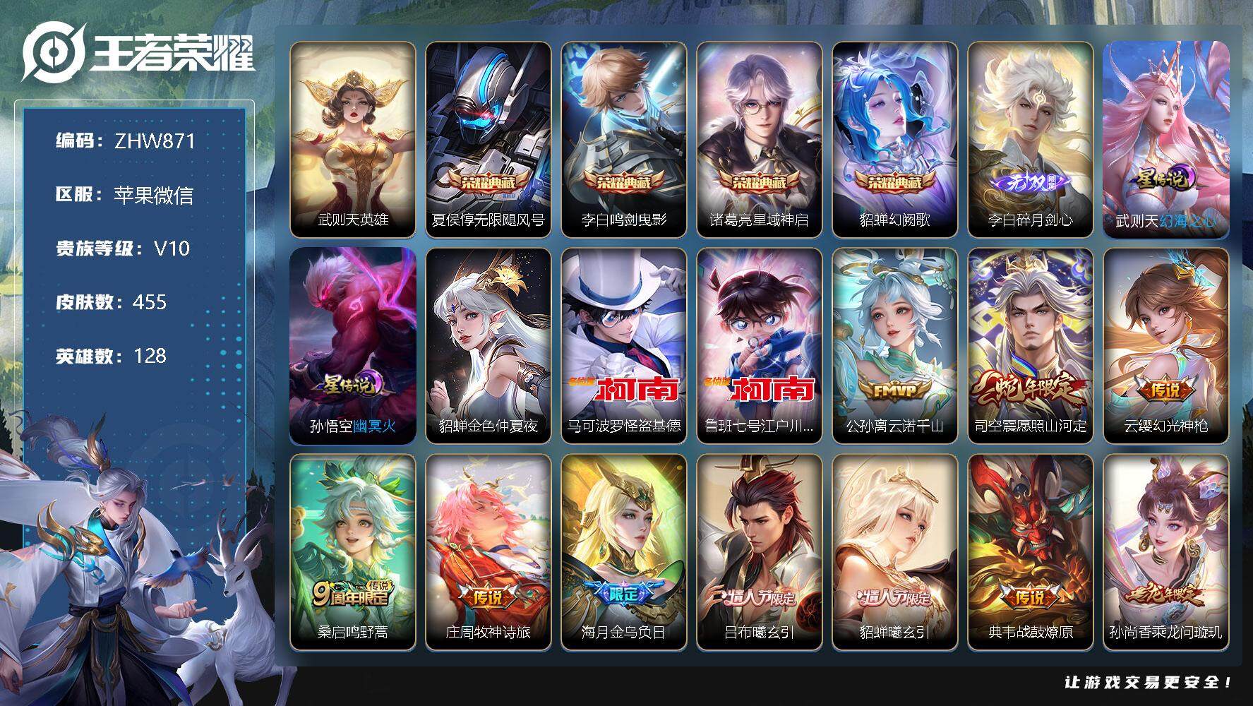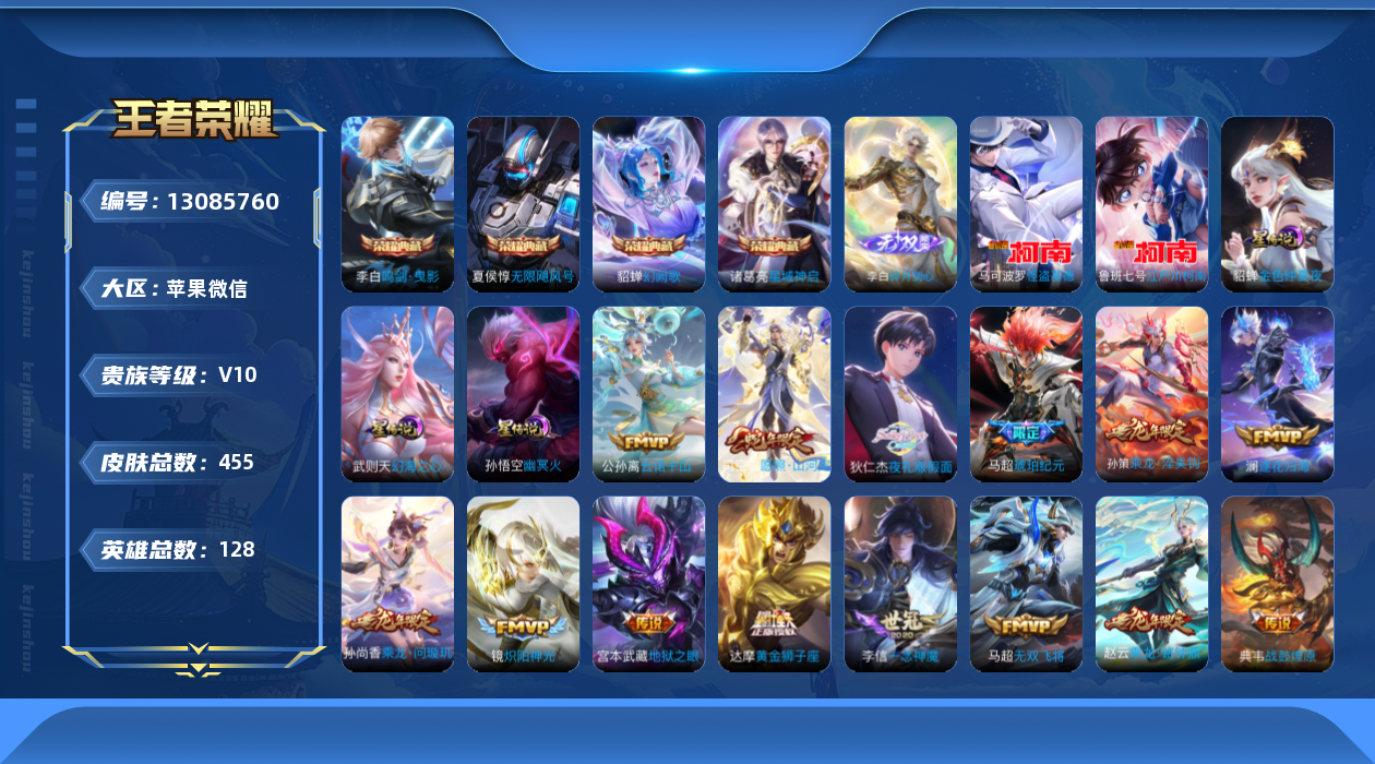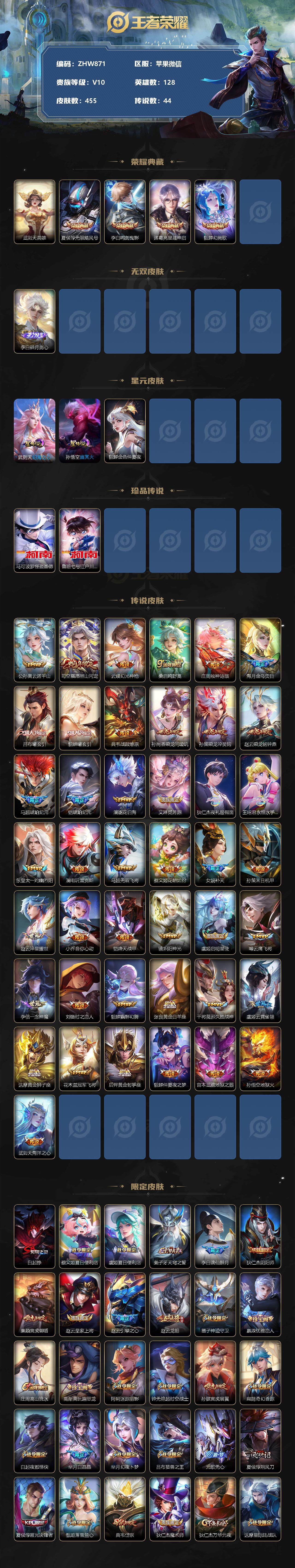 [13085760]苹果WX-V10-最强王者段位-128英雄-455皮肤-4典藏-0珍品无双-1无双-2珍品传说-44传说-147史诗