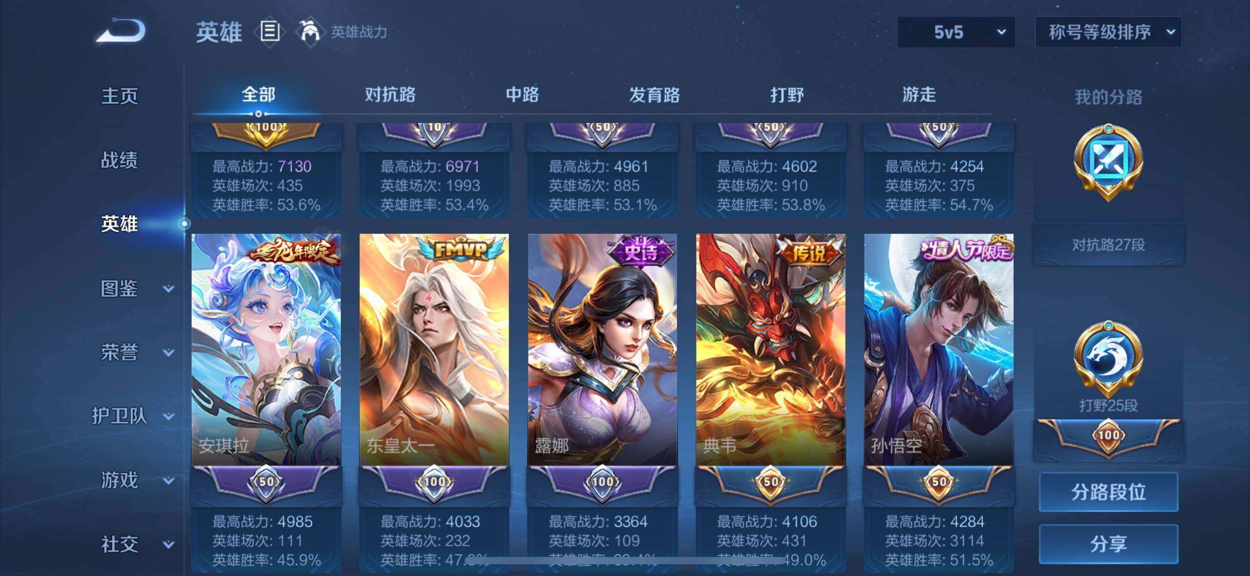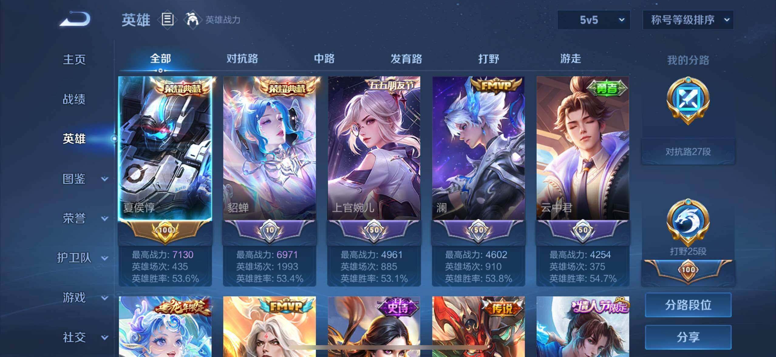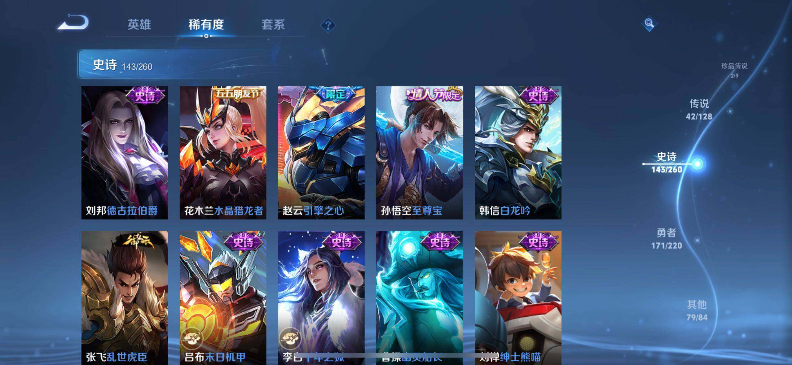 - [12265278]V7 1典藏 5传说 124英雄 162皮肤 可修改实名 优质装备:鸣剑·曳影,地狱火,超时空战士-狄仁杰,鹤羽星尊,玄雷天君 珍宝阁皮:蔷薇恋人 限定皮:五谷丰年,武圣,梁祝,李小龙,猪悟能 史诗皮:化蝶舞,龙之律动,百相守梦-周瑜,茶境仙,百相守梦-黄忠,电玩小子(小书包),黄金分割率,特工魅影,千年之狐,江河有灵,魅语,高渐离燃音魔法,冰冠公主,末日机甲-吕布,节奏热浪,水果甜心,绅士熊喵,天才门将,星夜王子,心灵骇客,功夫厨神,暗隐猎兽者,鬼剑武藏,缤纷独角兽,水晶猎龙者,曙光守护者,金属风暴,圣诞狂欢,圣诞恋歌,鹰眼统帅,暗夜贵公子,魅力维加斯,未来纪元-赵云