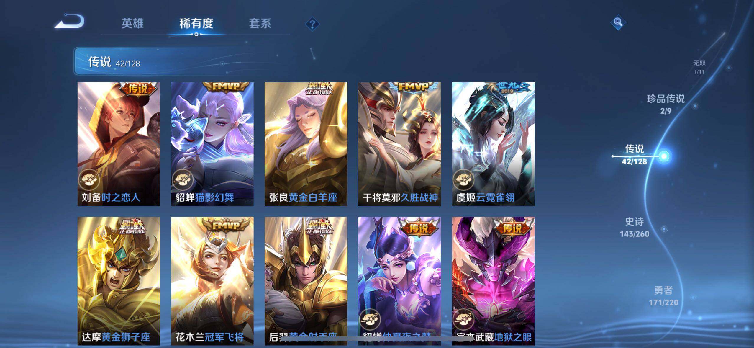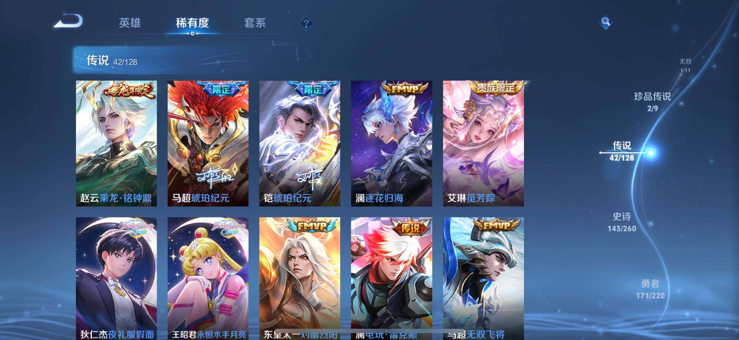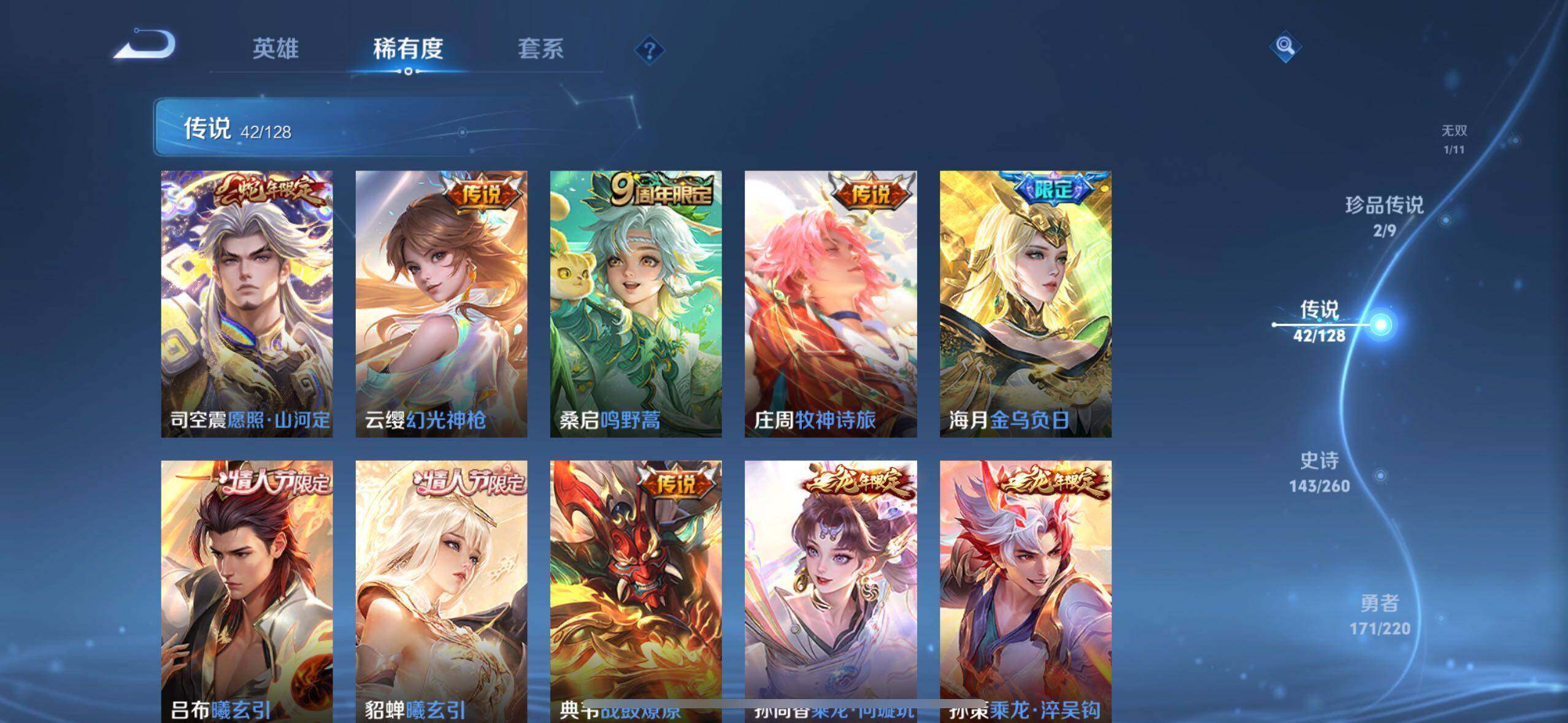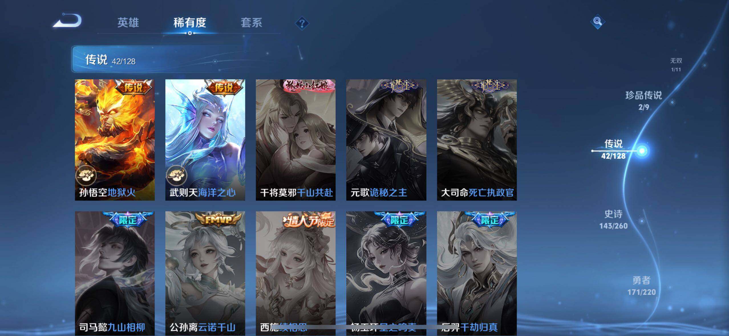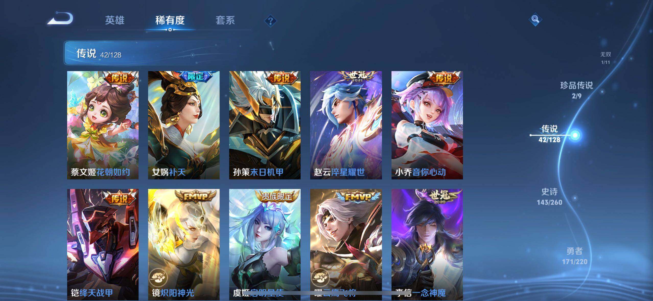 【传说皮肤】:后羿神树通天,公孙离云诺千山,司空震愿照山河定,云缨幻光神枪,桑启鸣野蒿,庄周牧神诗旅,海月金乌负日,吕布曦玄引,貂蝉曦玄引,典韦战鼓燎原,孙尚香乘龙问璇玑,孙策乘龙淬吴钩,赵云乘龙铭钟鼎,马超琥珀纪元,铠琥珀纪元,澜逐花归海,艾琳觅芳踪,狄仁杰夜礼服假面,王昭君永恒水手月亮,东皇太一灼幽烈阳,澜电玩雷克斯,马超无双飞将,蔡文姬花朝如约,女娲补天,孙策末日机甲,赵云淬星耀世,小乔音你心动,铠绛天战甲,镜炽阳神光,虞姬启明星使,曜云鹰飞将,李信一念神魔,刘备时之恋人,貂蝉猫影幻舞,张良黄金白羊座,干将莫邪久胜战神,虞姬云霓雀翎,达摩黄金狮子座,花木兰冠军飞将,后羿黄金射手座,貂蝉仲夏夜之梦,宫本武藏地狱之眼,孙悟空地狱火,武则天海洋之心