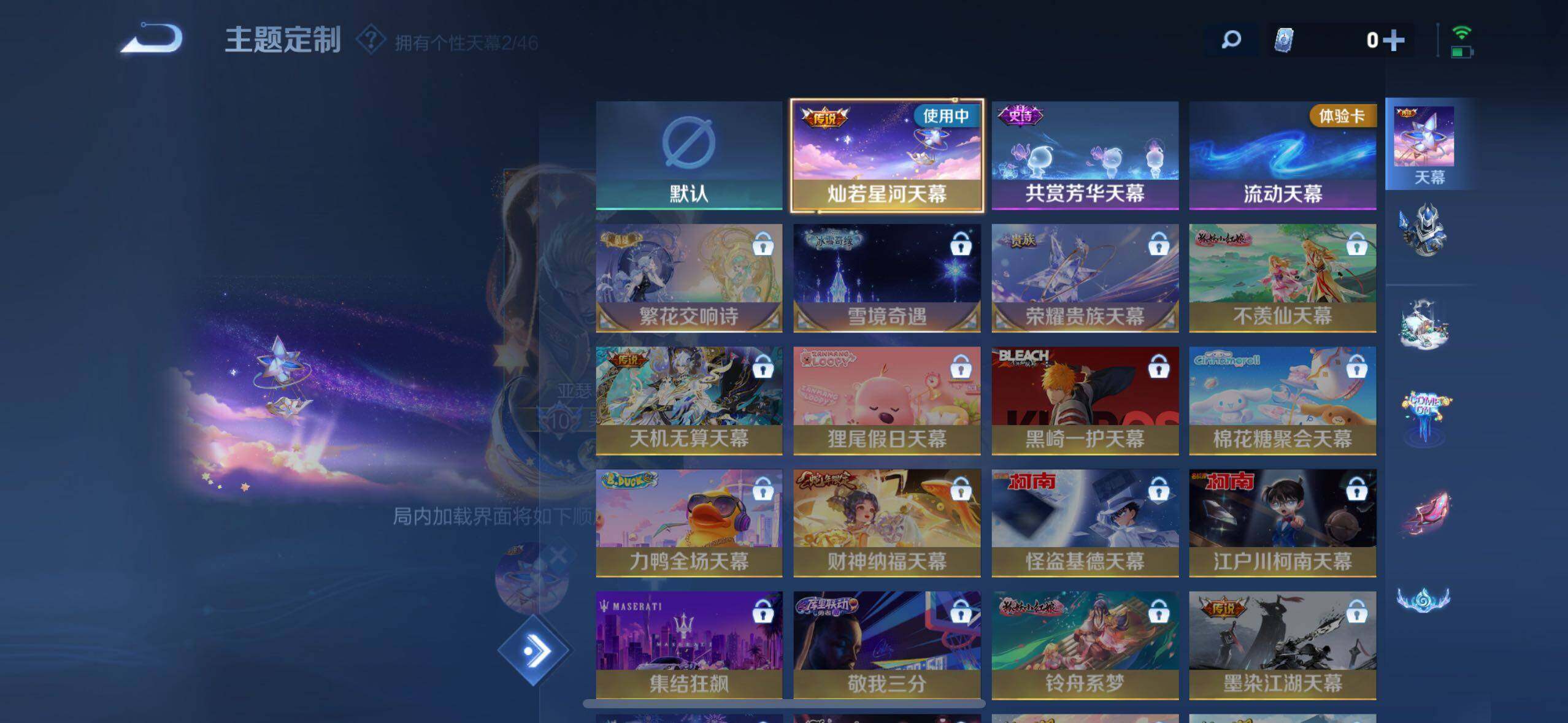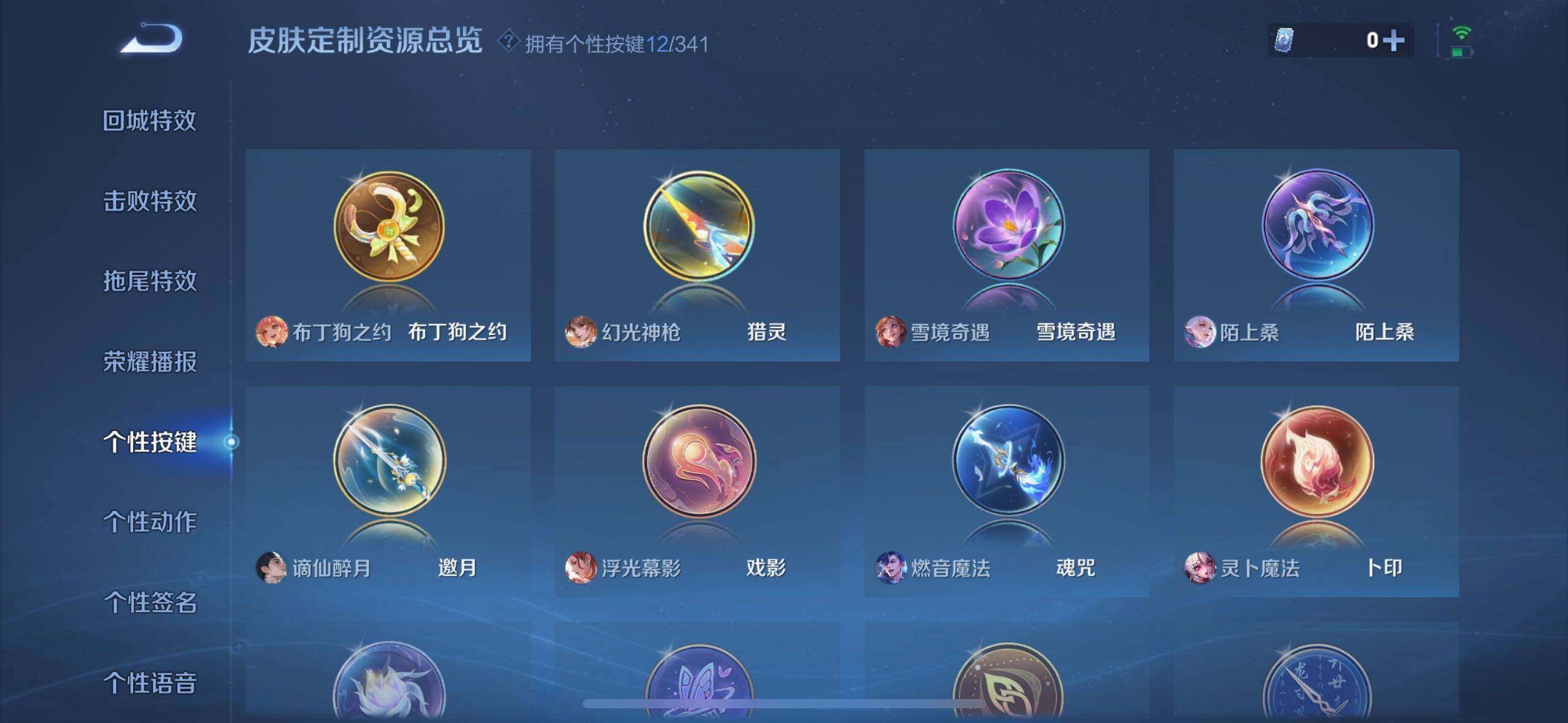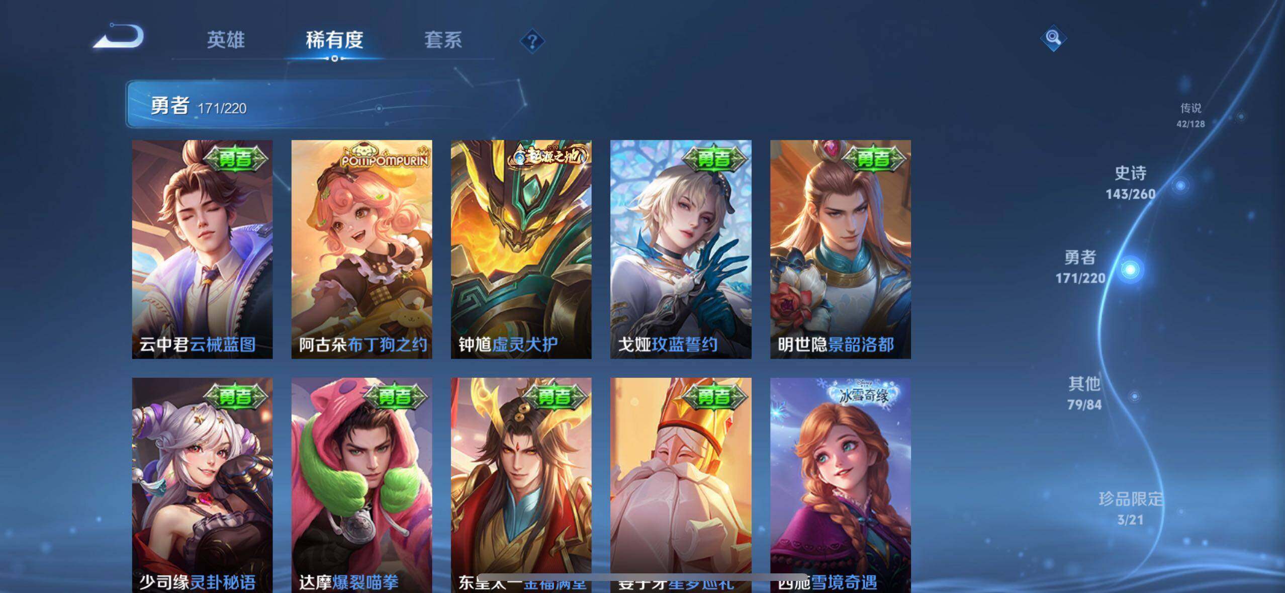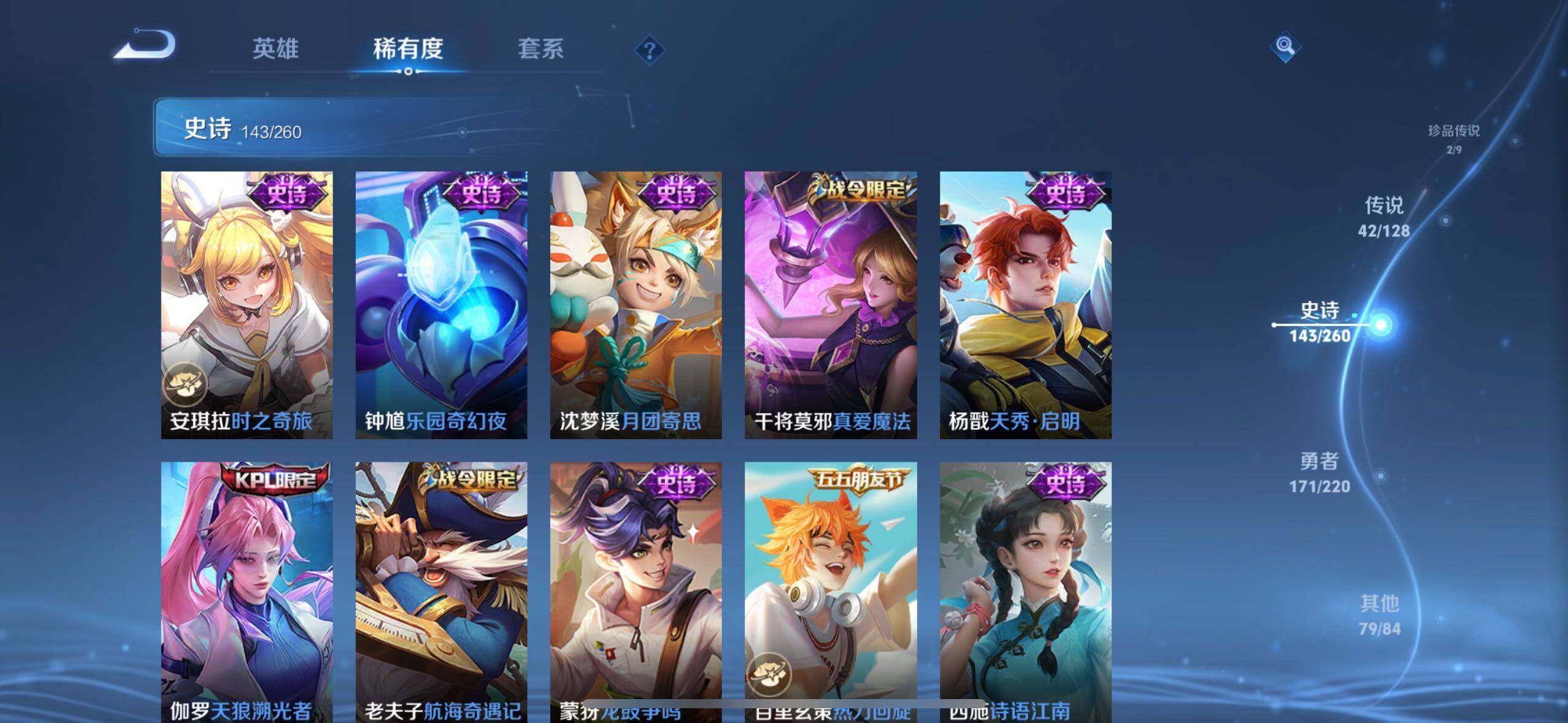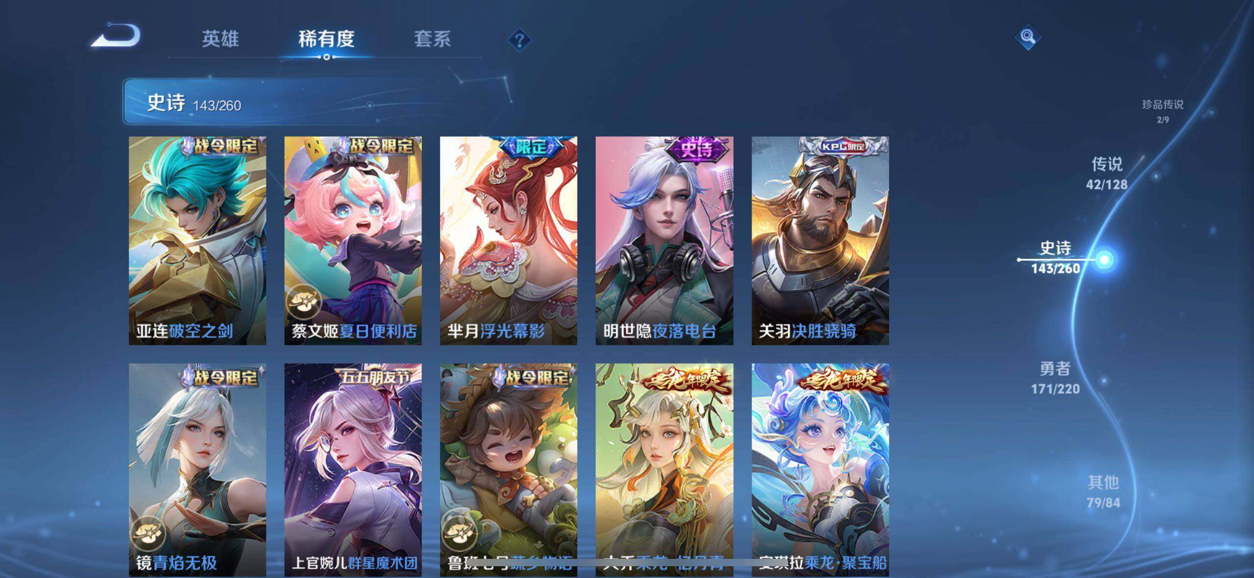 小乔青蛇,大乔白蛇,瑶遇见神鹿,娜可露露晚萤,伽罗箭羽风息,李元芳逐浪之夏,不知火舞魅语,公孙离无限星赏官,大乔猫狗日记,孙策猫狗日记,阿轲节奏热浪,露娜紫霞仙子,诸葛亮黄金分割率,王昭君偶像歌手,韩信白龙吟,项羽苍穹之光,孙尚香时之恋人,阿轲暗夜猫娘,雅典娜冰冠公主,吕布末日机甲,鲁班七号电玩小子,蒙犽龙鼓争鸣,橘右京修罗,墨子龙骑士,嬴政摇滚巨星,刘禅绅士熊喵,刘禅天才门将,白起星夜王子,安琪拉心灵骇客,安琪拉时之奇旅,程咬金功夫厨神,刘邦德古拉伯爵,兰陵王暗隐猎兽者,曹操幽灵船长,宫本武藏鬼剑武藏,司马懿暗渊魔法,亚瑟心灵战警,钟馗乐园奇幻夜,杨戬天秀·启明,蔡文姬舞动绿茵,廉颇地狱岩魂,西施诗语江南,小乔缤纷独角兽,夏侯惇乘风破浪,花木兰水晶猎龙者,铠曙光守护者,百里玄策热力回旋,墨子金属风暴,百里玄策原初追逐者,吕布圣诞狂欢,貂蝉圣诞恋歌,百里守约特工魅影,嬴政暗夜贵公子,嫦娥拒霜思,雅典娜黎明之约,李白千年之狐,哪吒雪上飞焰,夏洛特永昼,澜赏金猎手,艾琳奇遇舞章,貂蝉唤灵魅影,蔡文姬电玩·兔顽号,莱西奥末日机甲,李元芳匿光侦查者,姜子牙闲日渔趣,蒙犽百解令,周瑜雪夜绮愿,高渐离燃音魔法,伽罗琥珀纪元,大乔乘龙·忆丹青,安琪拉乘龙·聚宝船,上官婉儿群星魔术团,关羽决胜骁骑,明世隐夜落电台,李白谪仙醉月,赵怀真器灵·浮梦炉
