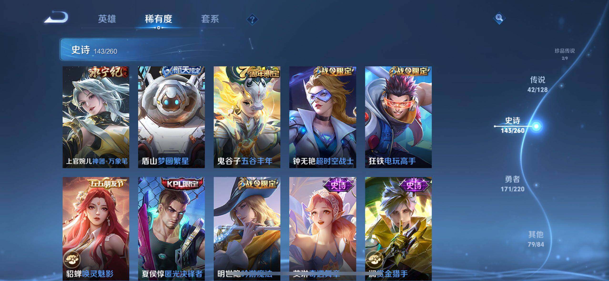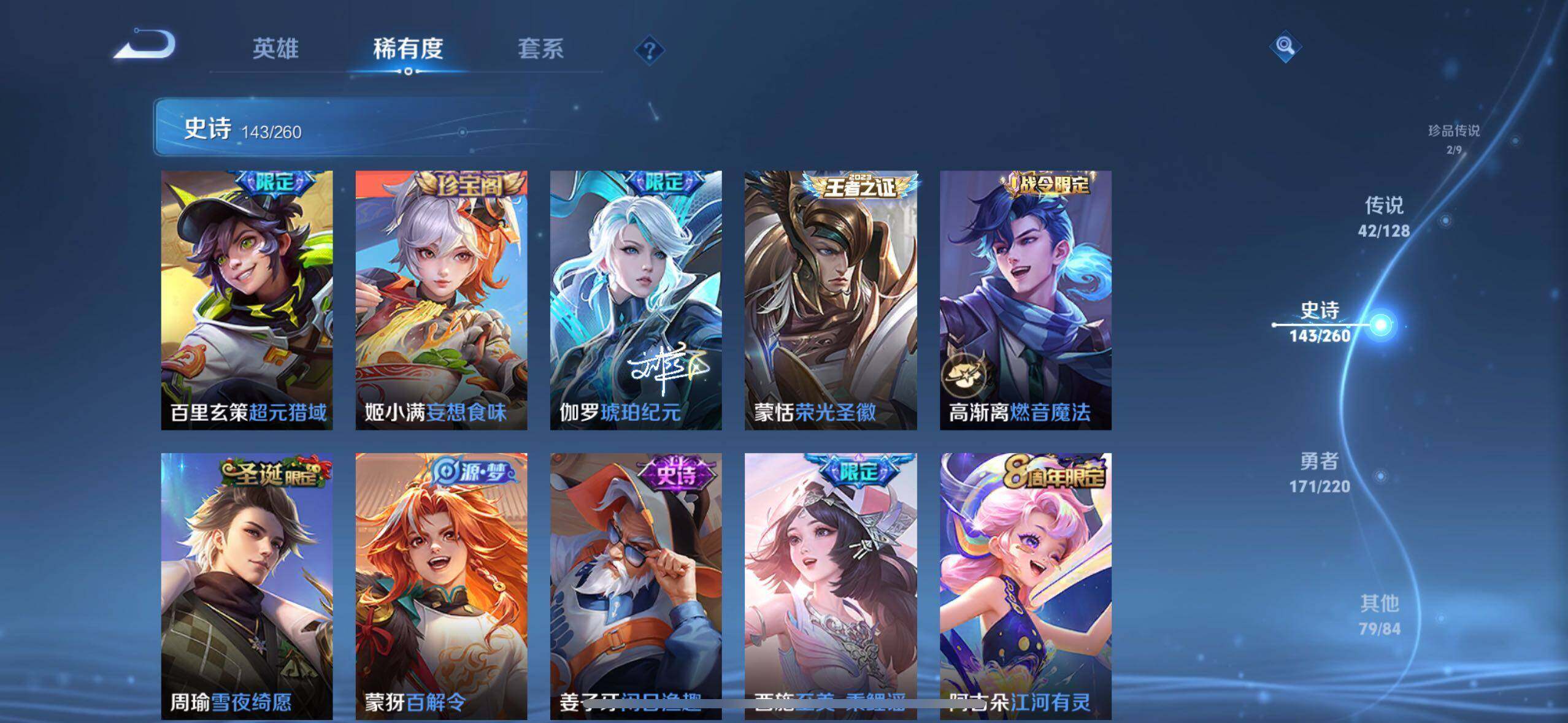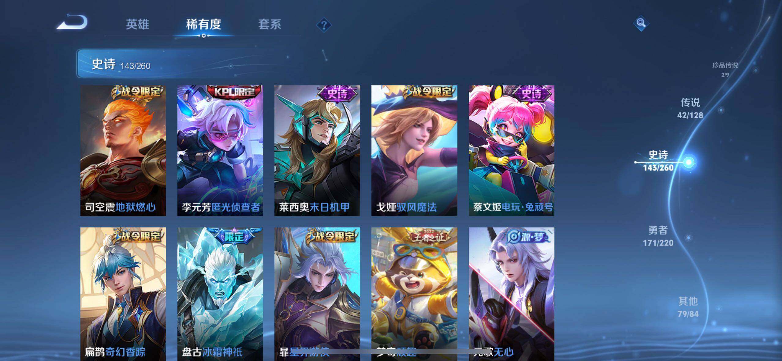 【限定皮肤】:白起狰,蔡文姬夏日便利店,虞姬夏日便利店,姜子牙天穹之誓,李白谪仙醉月,狄仁杰阴阳师,廉颇寅虎御盾,赵云皇家上将,赵云引擎之心,赵云龙胆,墨子神迹守卫,嬴政优雅恋人,庄周高山流水,高渐离玩趣恶龙,阿轲迷踪丽影,钟无艳超时空战士,孙膑寅虎展翼,扁鹊奇幻香踪,白起夜都怪侠,芈月白晶晶,芈月幻夜卜梦,吕布猎兽之王,元歌无心,夏侯惇朔风刀,夏侯惇匿光决锋者,甄姬落雪兰心,典韦岱宗,狄仁杰魔术师,狄仁杰万华元夜,达摩星际陆战队,达摩沙漠行僧,项羽海滩派对,老夫子醍醐杖,老夫子航海奇遇记,程咬金演武夺筹,韩信傲雪梅枪,王昭君午后时光,兰陵王金庭之子,孙悟空至尊宝,牛魔奔雷神使,后羿如梦令,后羿圣弓游侠,李元芳银河之约,李元芳匿光侦查者,李元芳云中旅人,虞姬启明星使,钟馗驱傩正仪,杨戬潮玩骑兵,女娲朔望之晖,女娲补天,干将莫邪真爱魔法,雅典娜黎明之约,太乙真人饕餮,鬼谷子原初探秘者,鬼谷子五谷丰年,黄忠火炮绅士,苏烈千军破阵,百里玄策原初追逐者,弈星混沌棋,梦奇顽趣,沈梦溪大漠名商,明世隐疑决卦,明世隐吟游魔法,裴擒虎李小