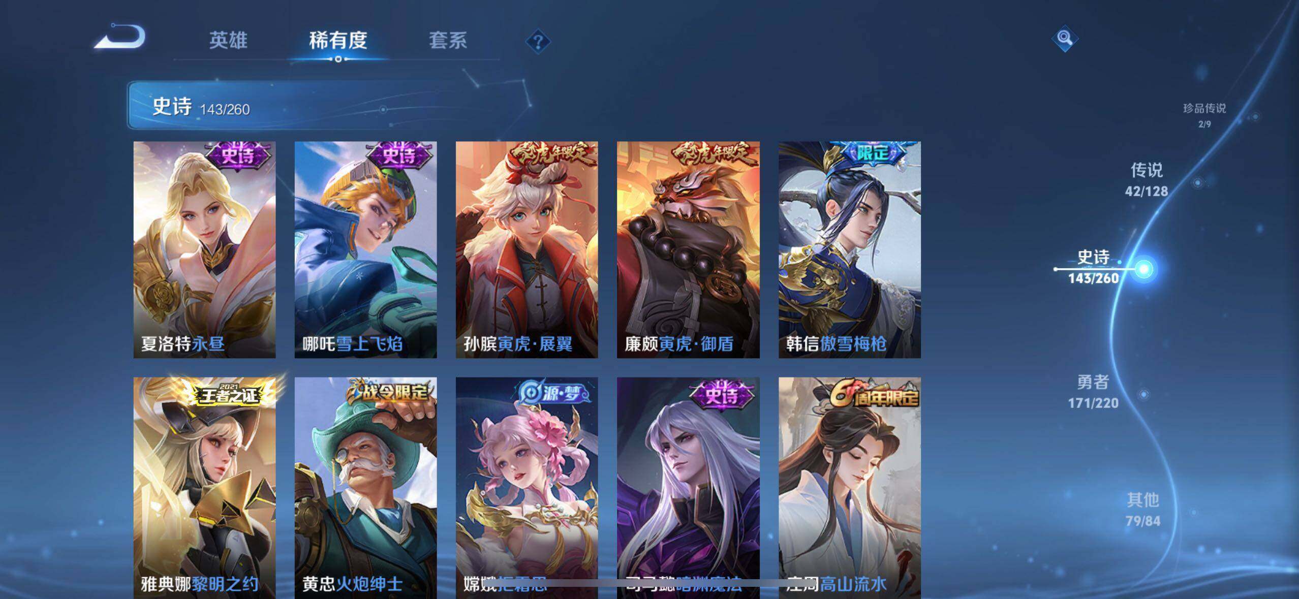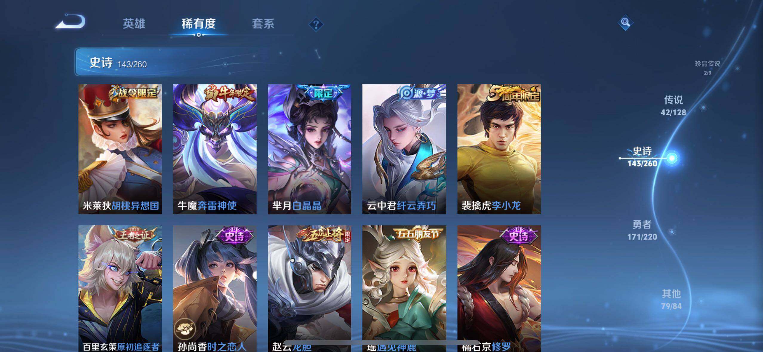 裴擒虎李小龙,上官婉儿梁祝,牛魔奔雷神使,赵云龙胆,典韦岱宗,伽罗天狼溯光者,后羿如梦令,嫦娥如梦令,孙悟空至尊宝,芈月白晶晶,赵云引擎之心,廉颇寅虎·御盾,韩信傲雪梅枪,孙膑寅虎·展翼,女娲补天,夏侯惇匿光决锋者,上官婉儿神器·万象笔,盾山梦圆繁星,盘古冰霜神祇,西施至美·乘鲤谣,桑启鸣野蒿,艾琳陌上桑,司空震愿照·山河定