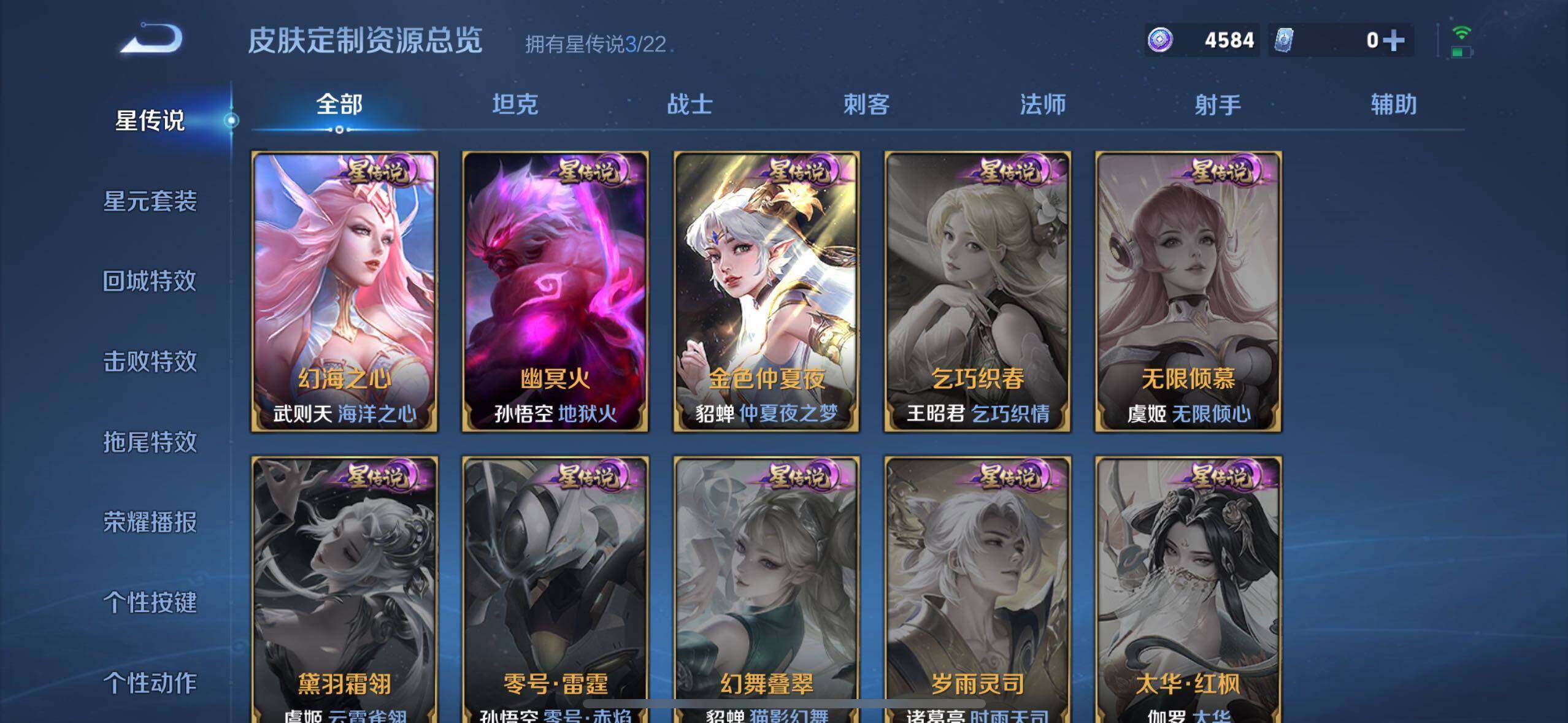 达摩黄金狮子座,张良黄金白羊座,干将莫邪久胜战神,铠绛天战甲,貂蝉猫影幻舞,曜云鹰飞将,镜炽阳神光,虞姬云霓雀翎,李信一念神魔,赵云淬星耀世,小乔音你心动,刘备时之恋人,孙策末日机甲,蔡文姬花朝如约,马超无双飞将,王昭君永恒水手月亮,狄仁杰夜礼服假面,艾琳觅芳踪,澜逐花归海,铠琥珀纪元,马超琥珀纪元,孙策乘龙·淬吴钩,赵云乘龙·铭钟鼎,孙尚香乘龙·问璇玑,典韦战鼓燎原,吕布曦玄引,貂蝉曦玄引,海月金乌负日,庄周牧神诗旅,云缨幻光神枪