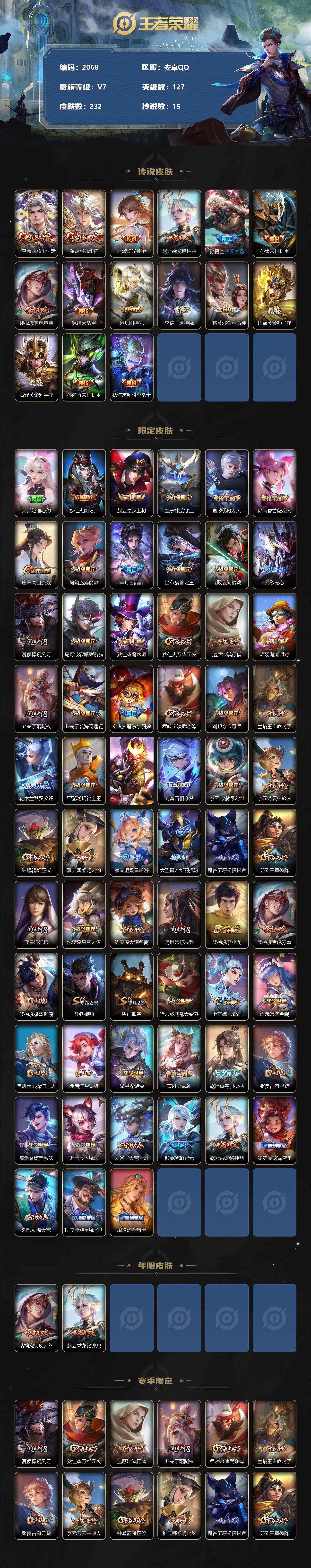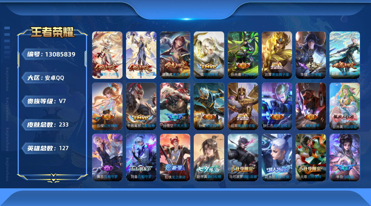 [13085839]安卓Q-V7-至尊星耀II段位-127英雄-232皮肤-0典藏-0珍品无双-0无双-0珍品传说-15传说-56史诗