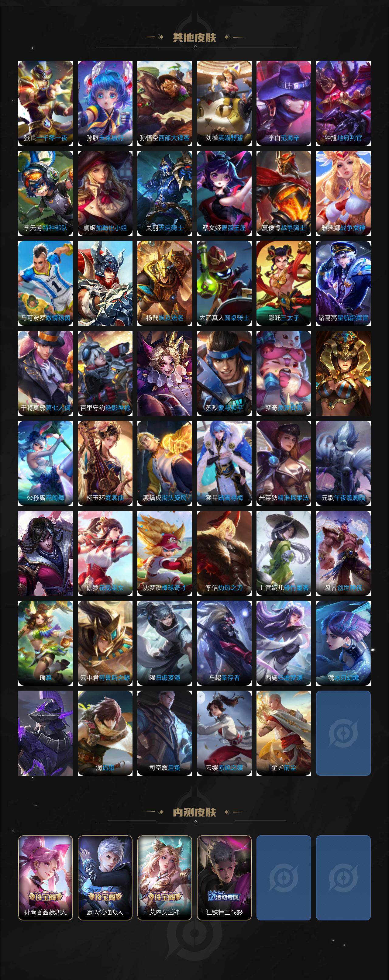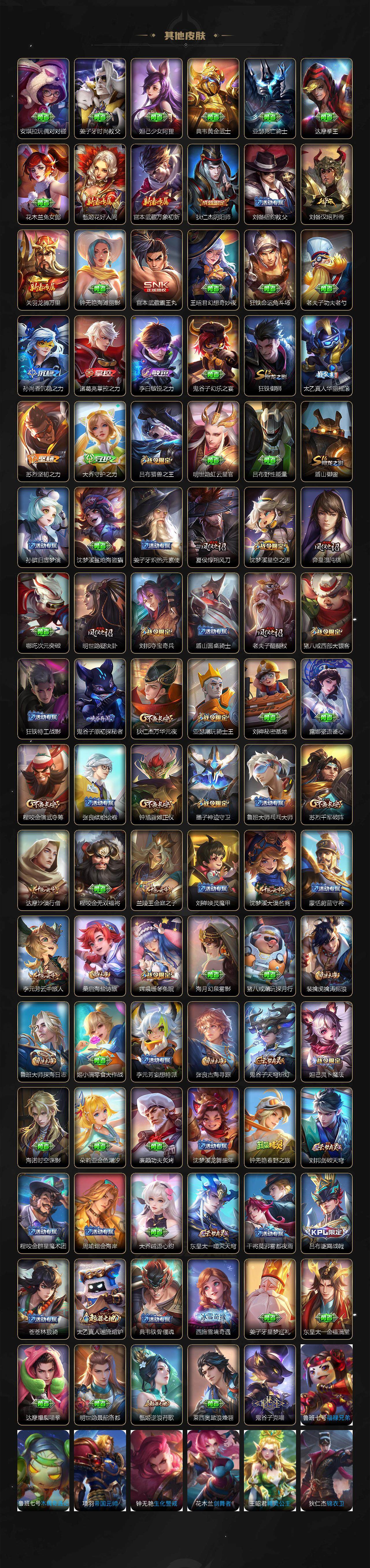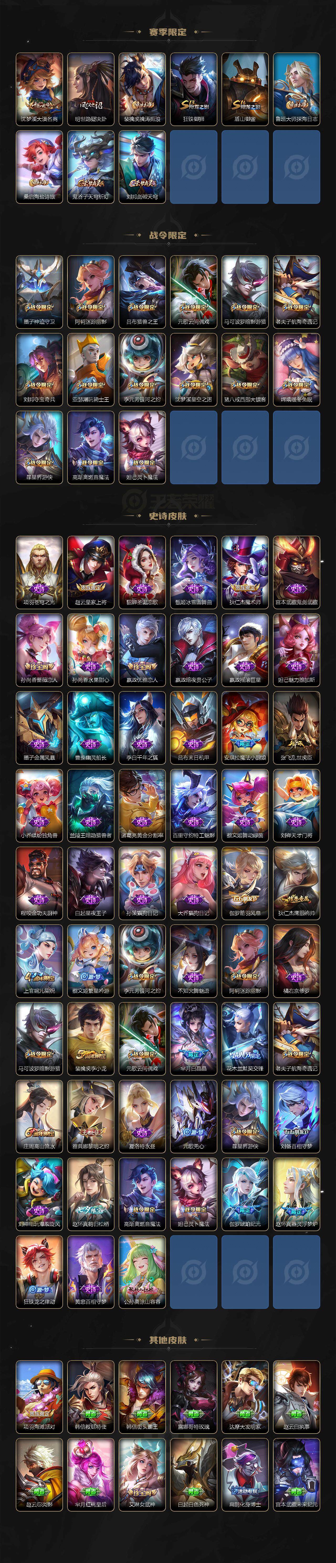【赛季限定】:夏侯惇朔风刀,狄仁杰万华元夜,达摩沙漠行僧,老夫子醍醐杖,程咬金演武夺筹,兰陵王金庭之子,张良古海寻踪,李元芳云中旅人,钟馗驱傩正仪,雅典娜黎明之约,鬼谷子原初探秘者,苏烈千军破阵,弈星混沌棋,沈梦溪大漠名商,明世隐疑决卦,裴擒虎擒涛扼浪,狂铁御狮,盾山御銮,鲁班大师探海日志,桑启海盐诗旅,鬼谷子天穹祈灯,刘邦剑破天穹