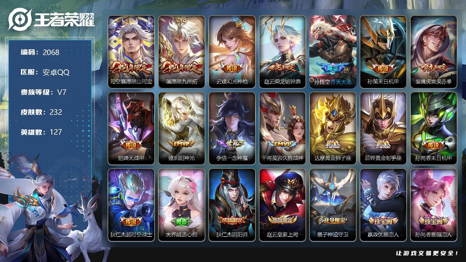 [13085839]安卓Q-V7-至尊星耀II段位-127英雄-232皮肤-0典藏-0珍品无双-0无双-0珍品传说-15传说-56史诗 【传说皮肤】:司空震愿照山河定,澜愿照九州拓,云缨幻光神枪,赵云乘龙铭钟鼎,孙悟空齐天大圣,孙策末日机甲,裴擒虎寅虎赤拳,铠绛天战甲,镜炽阳神光,李信一念神魔,干将莫邪久胜战神,达摩黄金狮子座,后羿黄金射手座,孙尚香末日机甲,狄仁杰超时空战士 【限定皮肤】:大乔绒语心约,狄仁杰阴阳师,赵云皇家上将,墨子神迹守卫,嬴政优雅恋人,孙尚香蔷薇恋人,庄周高山流水,阿轲迷踪丽影,芈月白晶晶,吕布猎兽之王,元歌云间偶戏,元歌无心,夏侯惇朔风刀,马可波罗暗影游猎,狄仁杰魔术师,狄仁杰万华元夜,达摩沙漠行僧,项羽海滩派对,老夫子醍醐杖,老夫子航海奇遇记,安琪拉魔法小厨娘,程咬金演武夺筹,刘邦夺宝奇兵,兰陵王金庭之子,花木兰默契交锋,亚瑟潮玩骑士王,孙悟空齐天大圣,刘备百相守梦,李元芳银河之约,李元芳云中旅人,钟馗驱傩正仪,雅典娜黎明之约,蔡文姬繁星吟游,太乙真人华丽摇滚,鬼谷子原初探秘者,苏烈千军破阵,弈星混沌棋,沈梦溪星空之诺,沈梦溪大漠名商,明世隐疑决卦,裴擒虎李小龙,裴擒虎寅虎赤拳,裴擒虎擒涛扼浪,狂铁御狮,盾山御銮,猪八戒西部大镖客,上官婉儿梁祝,嫦娥暖冬兔眠,鲁班大师探海日志,桑启海盐诗旅,暃星界游侠,艾琳女武神,赵怀真鹤归松栖,张良古海寻踪,高渐离燃音魔法,妲己灵卜魔法,鬼谷子天穹祈灯,伽罗琥珀纪元,赵云乘龙铭钟鼎,沈梦溪龙舞盛年,刘邦剑破天穹,程咬金群星魔术团,周瑜熔金海岸 【年限皮肤】:裴擒虎寅虎赤拳,赵云乘龙铭钟鼎 【赛季限定】:夏侯惇朔风刀,狄仁杰万华元夜,达摩沙漠行僧,老夫子醍醐杖,程咬金演武夺筹,兰陵王金庭之子,张良古海寻踪,李元芳云中旅人,钟馗驱傩正仪,雅典娜黎明之约,鬼谷子原初探秘者,苏烈千军破阵,弈星混沌棋,沈梦溪大漠名商,明世隐疑决卦,裴擒虎擒涛扼浪,狂铁御狮,盾山御銮,鲁班大师探海日志,桑启海盐诗旅,鬼谷子天穹祈灯,刘邦剑破天穹 【战令限定】:墨子神迹守卫,阿轲迷踪丽影,吕布猎兽之王,元歌云间偶戏,马可波罗暗影游猎,老夫子航海奇遇记,刘邦夺宝奇兵,亚瑟潮玩骑士王,李元芳银河之约,沈梦溪星空之诺,猪八戒西部大镖客,嫦娥暖冬兔眠,暃星界游侠,高渐离燃音魔法,妲己灵卜魔法 【史诗皮肤】:项羽苍穹之光,赵云皇家上将,貂蝉圣诞恋歌,甄姬冰雪圆