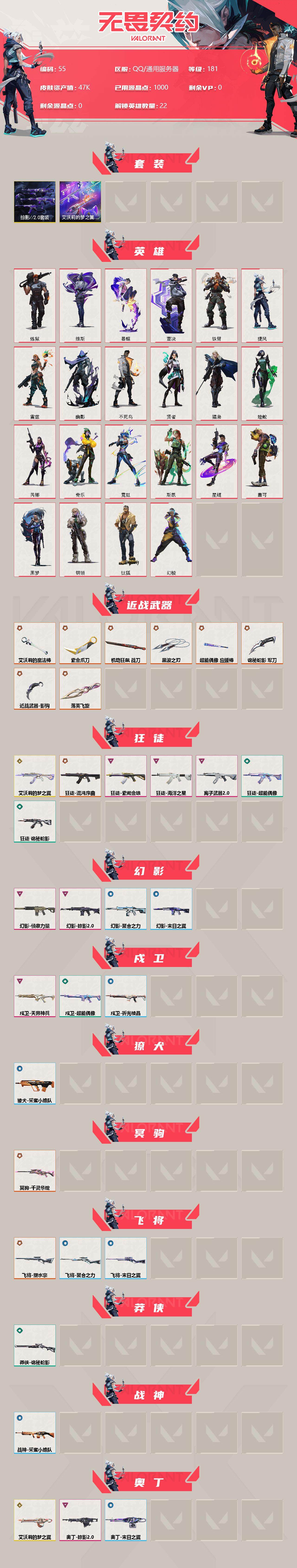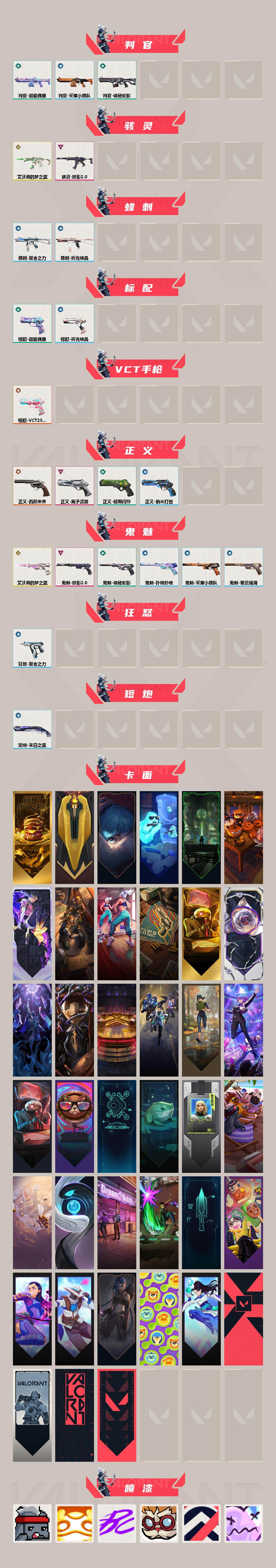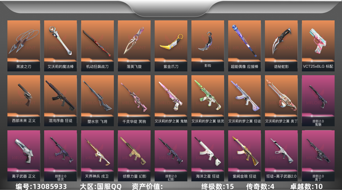 [13085933]【套装】:艾沃莉的梦之翼套装,掠影//2.0套装 【英雄】:幻棱,炼狱,维斯,暮蝶,钛狐,壹决,铁臂,捷风,雷兹,幽影,不死鸟,贤者,猎枭,蝰蛇,芮娜,奇乐,霓虹,斯凯,星礈,盖可,黑梦,钢锁 【近战 武器】:近战武器-影钩,近战武器-紫金爪刀,近战武器-黑波之刃,近战武器-落英飞旋,近战武器-艾沃莉的魔法棒,近战武器-超能偶像 应援棒,近战武器-机动狂飙 战刀,近战武器-诡秘蛇影 军刀 【狂徒】:狂徒-艾沃莉的梦之翼,狂徒-混沌序曲,狂徒-海洋之星,狂徒-紫阙金琅,狂徒-离子武器//2.0,狂徒-超能偶像,狂徒-诡秘蛇影 【幻影】:幻影-侦察力量,幻影-掠影//2.0,幻影-聚合之力,幻影-末日之翼 【戍卫】:戍卫-天界神兵,戍卫-超能偶像,戍卫-折光棱晶 【獠犬】:獠犬-采蜜小蜂队 【冥驹】:冥驹-千灵华绽 【飞将】:飞将-塑水宗,飞将-聚合之力,飞将-末日之翼 【莽侠】:莽侠-诡秘蛇影 【战神】:战神-采蜜小蜂队 【奥丁】:奥丁-艾沃莉的梦之翼,奥丁-掠影//2.0,奥丁-末日之翼 【判官】:判官-超能偶像,判官-诡秘蛇影,判官-采蜜小蜂队 【骇灵】:骇灵-艾沃莉的梦之翼,骇灵-掠影//2.0 【蜂刺】:蜂刺-聚合之力,蜂刺-折光棱晶 【标配】:标配-超能偶像,标配-折光棱晶 【VCT手枪】:标配-VCT25 x BLG 【正义】:正义-西部未来,正义-离子武器,正义-超限闪存,正义-纳米打击 【鬼魅】:鬼魅-艾沃莉的梦之翼,鬼魅-掠影//2.0,鬼魅-诡秘蛇影,鬼魅-采蜜小蜂队,鬼魅-扑棱扑棱,鬼魅-星云暗涌 【狂怒】:狂怒-聚合之力 【短炮】:短炮-末日之翼 【卡面】:终章:激斗汉堡 卡面,进入射程 卡面,《双城之战》拥抱 卡面,精灵大战 卡面,欢迎来到底城 卡面,南瓜盛典 卡面,无畏契约:暮蝶 卡面,修车达人 卡面,热舞环节 卡面,正义的化身 卡面,终章:生意人麦宝 卡面,铁之华 卡面,失而复得 卡面,时间到 卡面,最高舞台 卡面,复活专家 卡面,归乡 // 蝰蛇 卡面,超能偶像 卡面,生意人麦宝 卡面,音熊登场 卡面,声感陷阱设计图 卡面,霓帧牛蛙 卡面,钢锁工牌 卡面,战术小伙伴的夏日 卡面,采蜜小蜂队 卡面,聚合之力 卡面,梦幻奶茶 卡面,源能反应 卡面,零点嗅探设计图 卡面,瓦娃脸雪糕 卡面 ,无畏契约GO!第一卷:芮娜 卡面,无畏契约GO!第