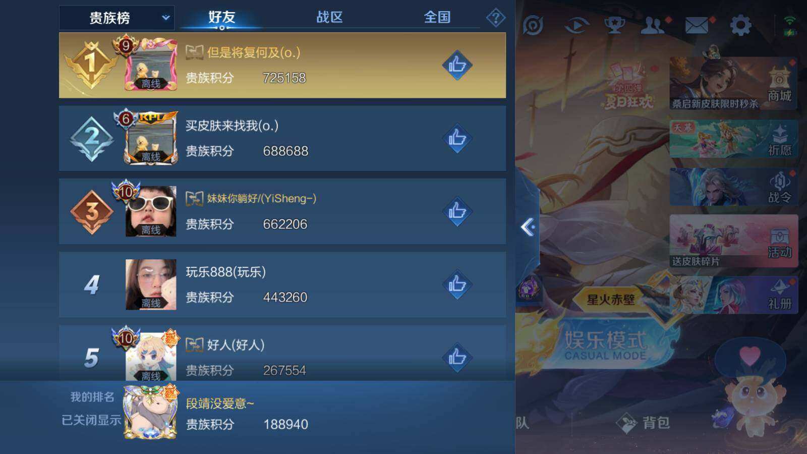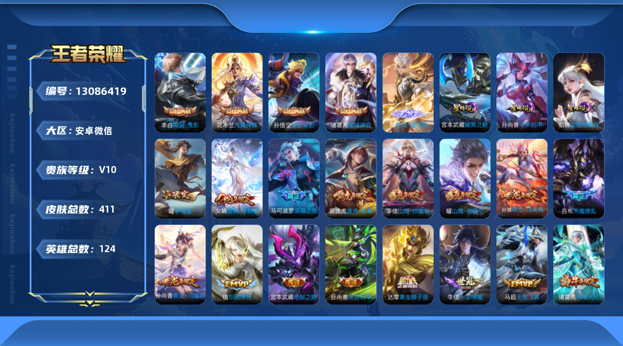 - [11529508]V9 1典藏 34传说 125英雄 344皮肤 可修改实名 优质装备:全息碎影(猴子典藏),黄金狮子座,黄金射手座,云鹰飞将(小将军),黄金白羊座,炽阳神光,一念神魔,仲夏夜之梦(大飞蛾),飞鸢探春,音你心动-周瑜,李逍遥,乞巧织情,时之恋人-刘备(电焊工),游龙清影(小青龙),淬星耀世,末日机甲-孙策,无双飞将,鲁班七号-时之奇旅,大乔-时之奇旅,澜逐花归海,琥珀纪元铠,琥珀纪元马超,金乌负日,黄金天蝎座 传说皮:乘龙·问璇玑(孙尚香年限),乘龙·铭钟鼎(赵云年限),乘龙·淬吴钩(孙策年限),典韦战鼓燎原,落雪白狼,铠冥王哈迪斯 珍宝阁皮:胡桃夹子,蔷薇恋人 限定皮:傲雪梅枪,白晶晶,时雨天司(水龙头),至美·乘鲤谣,至美·化雀舞,影龙天霄,遇见飞天,匿光决锋者,五谷丰年,辉光之辰,孙行者,大圣娶亲,玉兔公主,无尽星芒,山海·玄木吟(马可年限) 史诗皮:化蝶舞,灵蛊蚀心,怒海争锋,埋骨钱,芈月浮光幕影,琥珀纪元伽罗,决胜骁骑,上官婉儿群星魔术团,奇遇星旅,蔬乡物语(鲁班七号),曹操夜都魔契,超元猎域,乘龙·聚宝船(安琪拉年限),乘龙·忆丹青(大乔年限),百相守梦-黄忠,遇见神鹿,紫霞仙子,黄金分割率,特工魅影,千年之狐,永昼,江河有灵,匿光侦查者,鹤归松栖(赵怀真),真我赫兹(百里守约),魅语,百解令(蒙犽),高渐离燃音魔法,无限星赏官,青蛇,偶像歌手,晚萤,电玩·爆裂旋风,龙骑士(小龙虾),末日机甲-吕布,猫狗日记-孙策,猫狗日记-大乔,时之恋人-孙尚香,乱世虎臣,修罗,女仆咖啡,摇滚巨星,水果甜心,绅士熊喵,天才门将,星夜王子,心灵骇客,功夫厨神,德古拉伯爵,暗隐猎兽者,幽灵船长,鬼剑武藏,暗渊魔法,心灵战警,乐园奇幻夜,舞动绿茵,纤云弄巧,拒霜思,缤纷独角兽,乘风破浪,逐浪之夏,水晶猎龙者,曙光守护者,箭羽风息,金属风暴,圣诞狂欢,圣诞恋歌,鹰眼统帅,暗夜贵公子,魅力维加斯,赏金猎手,奇遇舞章,天秀·音浪,千筹问战,顽趣-阿古朵,无心,未来纪元-赵云