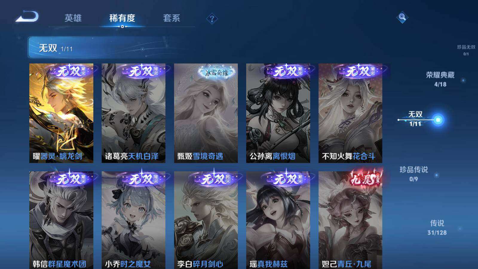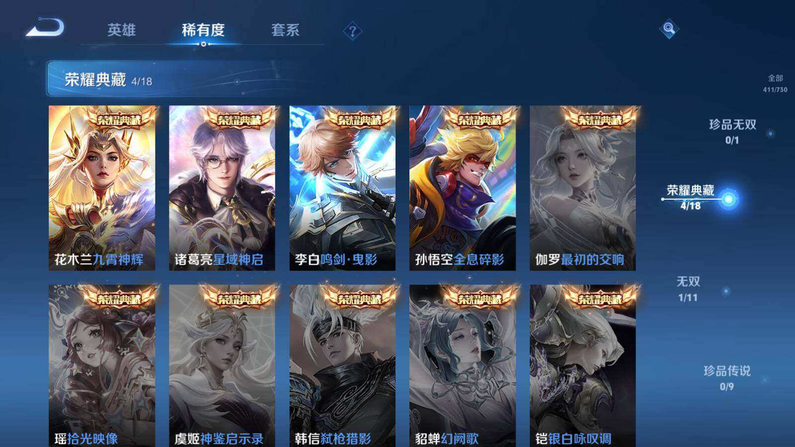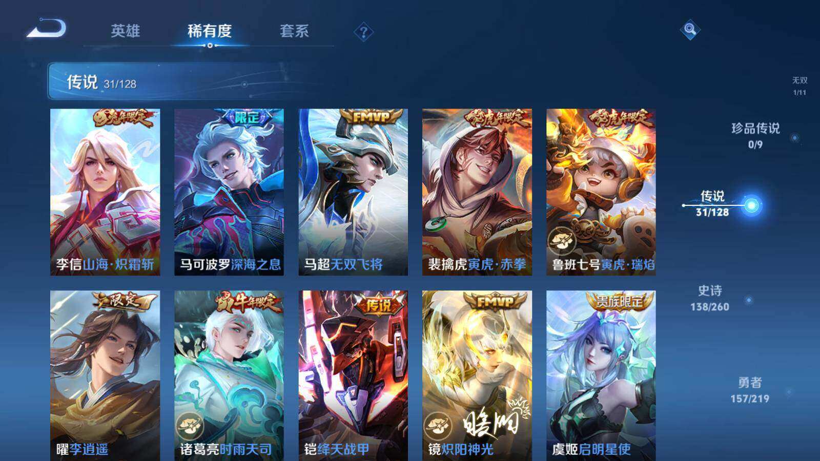 关羽冰锋战神,裴擒虎李小龙,上官婉儿梁祝,吕布御风骁将,诸葛亮时雨天司,赵云龙胆,马超神威,韩信飞衡,上官婉儿天狼绘梦者,韩信逐梦之影,铠青龙志,花木兰瑞麟志,百里守约朱雀志,后羿如梦令,嫦娥如梦令,孙悟空至尊宝,干将莫邪冰霜恋舞曲,妲己时之彼端,猪八戒猪悟能,廉颇寅虎·御盾,孙悟空孙行者,甄姬女儿国国王,镜匿光追影者,韩信傲雪梅枪,鲁班七号寅虎·瑞焰,孙膑寅虎·展翼,杨玉环寅虎·心曲,裴擒虎寅虎·赤拳,赵云百木心枪,公孙离玉兔公主,马可波罗深海之息,金蝉唐三藏,上官婉儿神器·万象笔,马可波罗山海·玄木吟,盘古冰霜神祇,瑶山海·碧波行,桑启鸣野蒿,女娲愿照·千秋盛