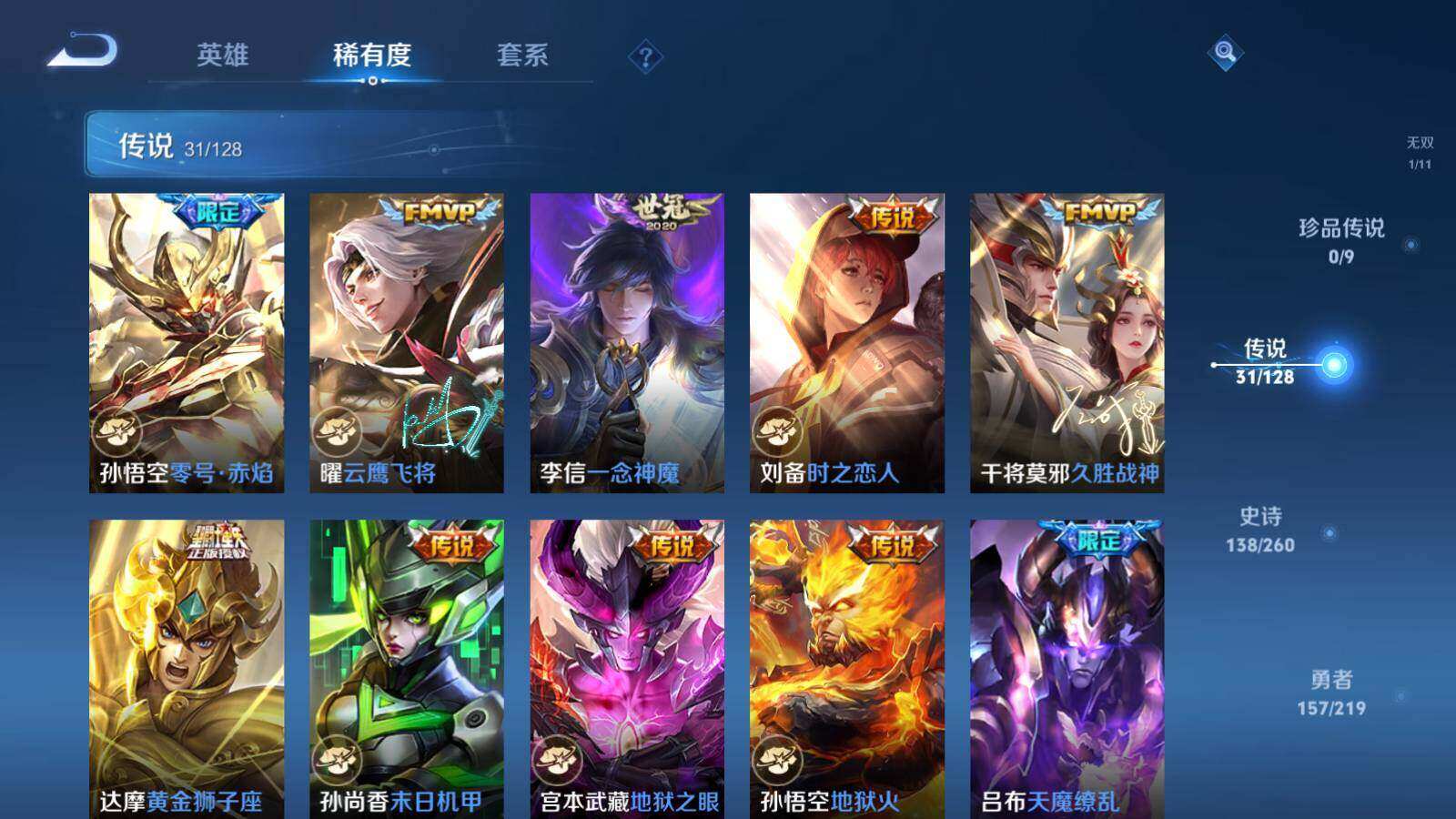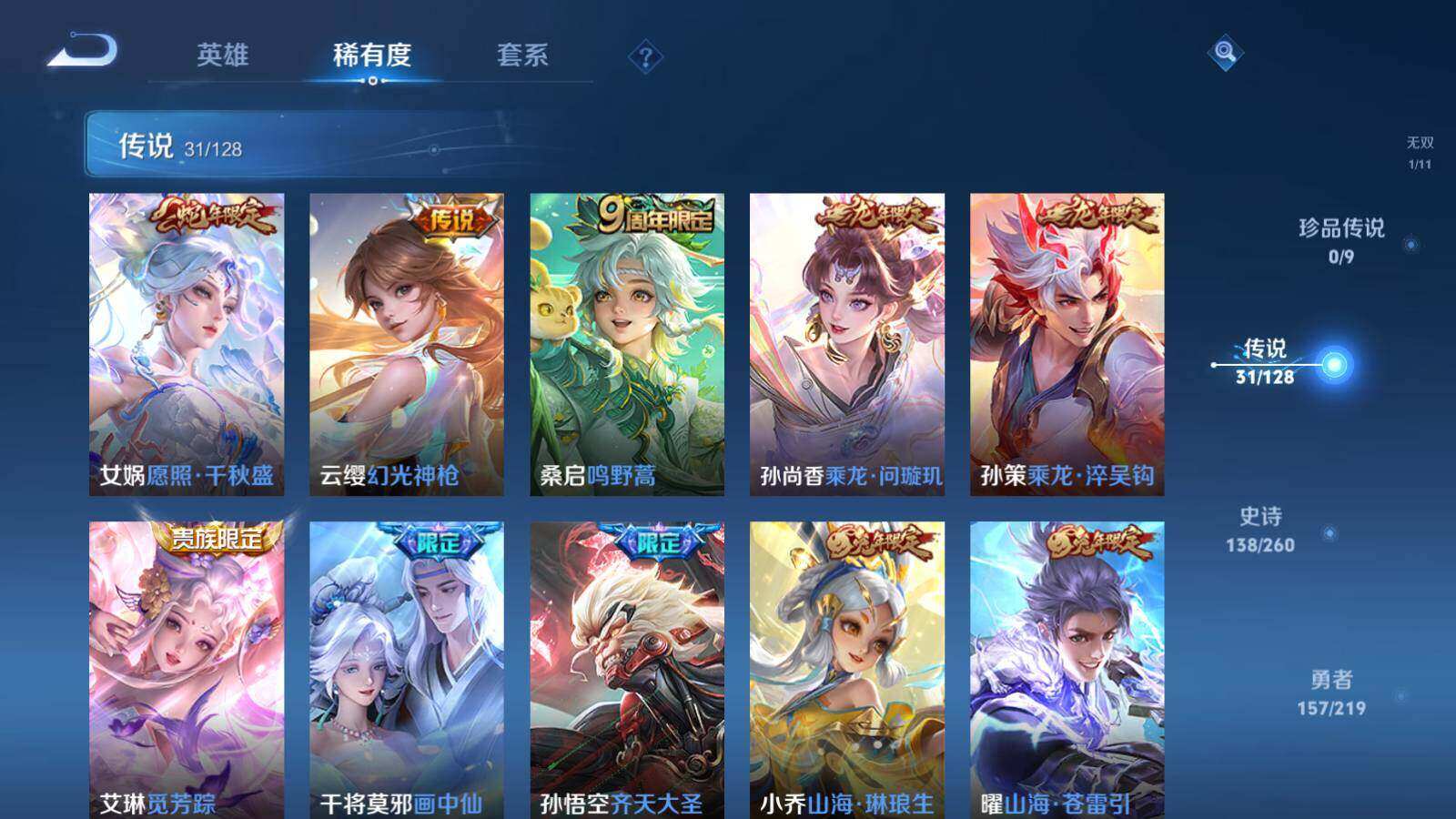 【传说皮肤】:女娲愿照千秋盛,云缨幻光神枪,桑启鸣野蒿,孙尚香乘龙问璇玑,孙策乘龙淬吴钩,艾琳觅芳踪,干将莫邪画中仙,孙悟空齐天大圣,小乔山海琳琅生,曜山海苍雷引,李信山海炽霜斩,马可波罗深海之息,马超无双飞将,裴擒虎寅虎赤拳,鲁班七号寅虎瑞焰,曜李逍遥 ,诸葛亮时雨天司,铠绛天战甲,镜炽阳神光,虞姬启明星使,孙悟空零号赤焰,曜云鹰飞将,李信一念神魔,刘备时之恋人,干将莫邪久胜战神,达摩黄金狮子座,孙尚香末日机甲,宫本武藏地狱之眼,孙悟空地狱火,吕布天魔缭乱,狄仁杰超时空战士