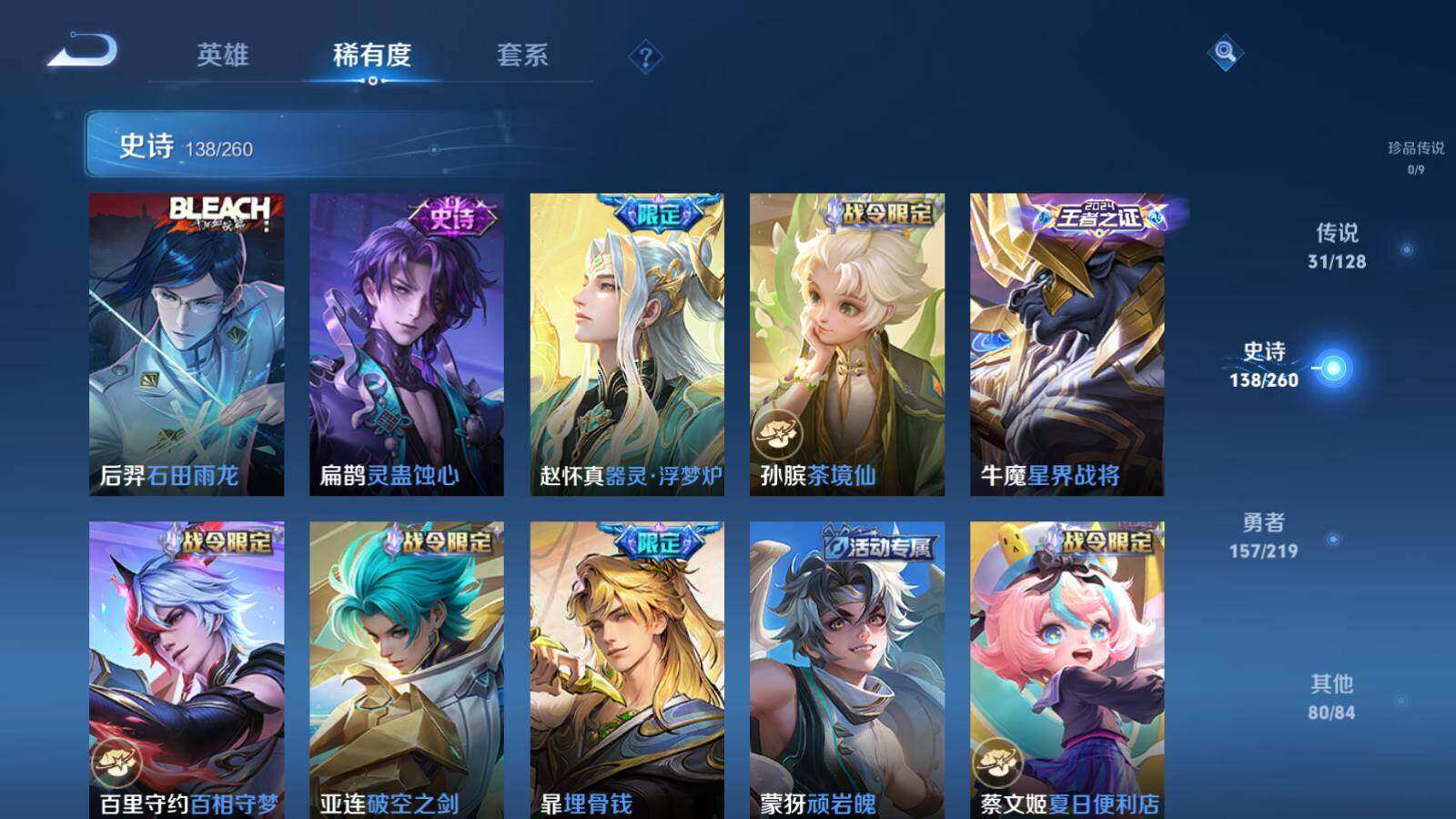【限定皮肤】:暃埋骨钱,蒙犽顽岩魄,蔡文姬夏日便利店,虞姬夏日便利店,姜子牙天穹之誓,杨戬破阵退雄兵,狄仁杰阴阳师,廉颇寅虎御盾,小乔山海琳琅生,赵云皇家上将,赵云龙胆,赵云百木心枪,墨子神迹守卫,妲己时之彼端,嬴政优雅恋人,鲁班七号寅虎瑞焰,庄周高山流水,阿轲迷踪丽影,钟无艳超时空战士,孙膑寅虎展翼,扁鹊奇幻香踪,白起夜都怪侠,芈月幻夜卜梦,吕布天魔缭乱,吕布御风骁将,周瑜赤莲之焰,元歌云间偶戏,元歌无心,夏侯惇朔风刀,甄姬女儿国国王,甄姬落雪兰心,马可波罗深海之息,马可波罗山海玄木吟,狄仁杰魔术师,狄仁杰万华元夜,达摩星际陆战队,达摩沙漠行僧,项羽海滩派对,老夫子醍醐杖,老夫子航海奇遇记,关羽冰锋战神,程咬金演武夺筹,刘邦夺宝奇兵,韩信逐梦之影,韩信飞衡,韩信傲雪梅枪,王昭君午后时光,兰陵王驯魔猎人,兰陵王金庭之子,花木兰瑞麟志,亚瑟潮玩骑士王,孙悟空至尊宝,孙悟空零号赤焰,孙悟空孙行者,孙悟空齐天大圣,后羿如梦令,后羿圣弓游侠,李元芳银河之约,李元芳云中旅人,虞姬启明星使,钟馗驱傩正仪,杨玉环遇见飞天,杨玉环寅虎心曲,杨戬潮玩骑兵,女娲朔望之晖,干将莫邪冰霜恋舞曲,干将莫邪胡桃夹子,干将莫邪真爱魔法,干将莫邪画中仙,雅典娜单词大作战,雅典娜黎明之约,鬼谷子原初探秘者,鬼谷子五谷丰年,诸葛亮时雨天司,黄忠火炮绅士,铠青龙志,苏烈千军破阵,百里玄策原初追逐者,百里守约朱雀志,弈星混沌棋,梦奇顽趣,公孙离玉兔公主