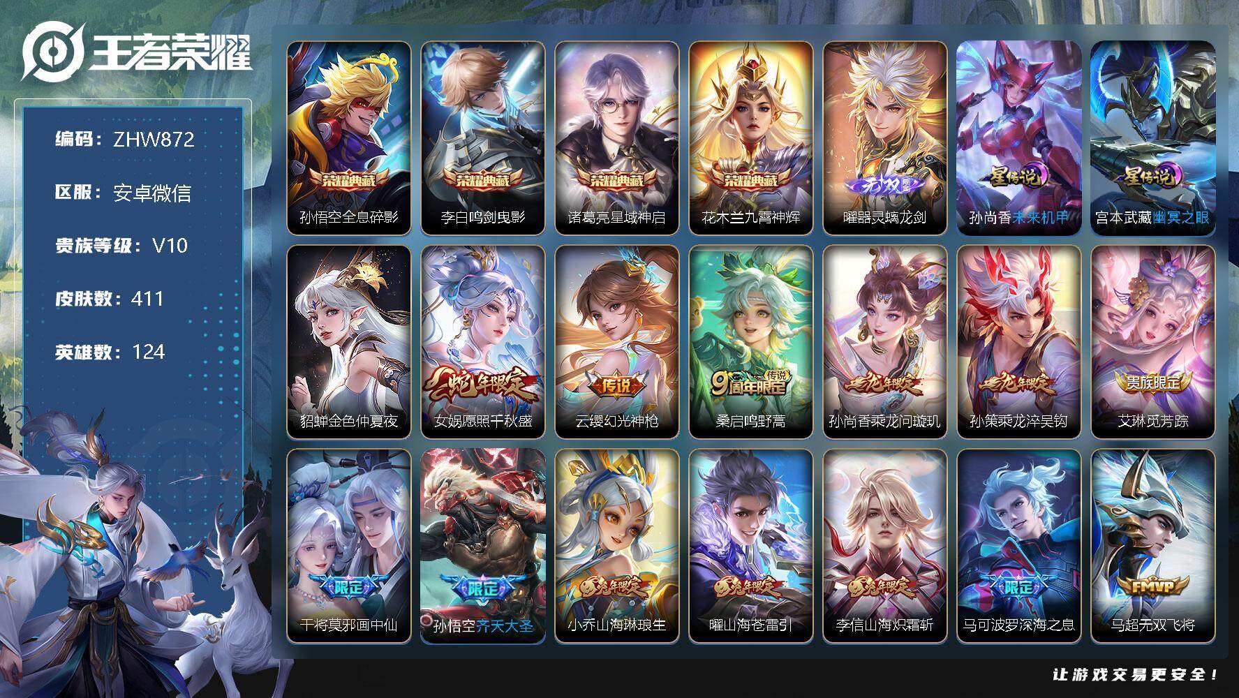 [13086419]安卓WX-V10-124英雄-411皮肤-4典藏-1无双-31传说-138史诗-3星元 【英雄全皮】:达摩全皮,刘邦全皮,李信全皮,曜全皮,蒙恬全皮,金蝉全皮,赵怀真全皮,影全皮 【荣耀典藏】:孙悟空全息碎影,李白鸣剑曳影,诸葛亮星域神启,花木兰九霄神辉 【无双皮肤】:曜器灵螭龙剑 【传说皮肤】:女娲愿照千秋盛,云缨幻光神枪,桑启鸣野蒿,孙尚香乘龙问璇玑,孙策乘龙淬吴钩,艾琳觅芳踪,干将莫邪画中仙,孙悟空齐天大圣,小乔山海琳琅生,曜山海苍雷引,李信山海炽霜斩,马可波罗深海之息,马超无双飞将,裴擒虎寅虎赤拳,鲁班七号寅虎瑞焰,曜李逍遥 ,诸葛亮时雨天司,铠绛天战甲,镜炽阳神光,虞姬启明星使,孙悟空零号赤焰,曜云鹰飞将,李信一念神魔,刘备时之恋人,干将莫邪久胜战神,达摩黄金狮子座,孙尚香末日机甲,宫本武藏地狱之眼,孙悟空地狱火,吕布天魔缭乱,狄仁杰超时空战士 【限定皮肤】:暃埋骨钱,蒙犽顽岩魄,蔡文姬夏日便利店,虞姬夏日便利店,姜子牙天穹之誓,杨戬破阵退雄兵,狄仁杰阴阳师,廉颇寅虎御盾,小乔山海琳琅生,赵云皇家上将,赵云龙胆,赵云百木心枪,墨子神迹守卫,妲己时之彼端,嬴政优雅恋人,鲁班七号寅虎瑞焰,庄周高山流水,阿轲迷踪丽影,钟无艳超时空战士,孙膑寅虎展翼,扁鹊奇幻香踪,白起夜都怪侠,芈月幻夜卜梦,吕布天魔缭乱,吕布御风骁将,周瑜赤莲之焰,元歌云间偶戏,元歌无心,夏侯惇朔风刀,甄姬女儿国国王,甄姬落雪兰心,马可波罗深海之息,马可波罗山海玄木吟,狄仁杰魔术师,狄仁杰万华元夜,达摩星际陆战队,达摩沙漠行僧,项羽海滩派对,老夫子醍醐杖,老夫子航海奇遇记,关羽冰锋战神,程咬金演武夺筹,刘邦夺宝奇兵,韩信逐梦之影,韩信飞衡,韩信傲雪梅枪,王昭君午后时光,兰陵王驯魔猎人,兰陵王金庭之子,花木兰瑞麟志,亚瑟潮玩骑士王,孙悟空至尊宝,孙悟空零号赤焰,孙悟空孙行者,孙悟空齐天大圣,后羿如梦令,后羿圣弓游侠,李元芳银河之约,李元芳云中旅人,虞姬启明星使,钟馗驱傩正仪,杨玉环遇见飞天,杨玉环寅虎心曲,杨戬潮玩骑兵,女娲朔望之晖,干将莫邪冰霜恋舞曲,干将莫邪胡桃夹子,干将莫邪真爱魔法,干将莫邪画中仙,雅典娜单词大作战,雅典娜黎明之约,鬼谷子原初探秘者,鬼谷子五谷丰年,诸葛亮时雨天司,黄忠火炮绅士,铠青龙志,苏烈千军破阵,百里玄策原初追逐者,百里守约朱雀志,弈星混沌棋,梦奇顽趣,公孙离玉兔公主