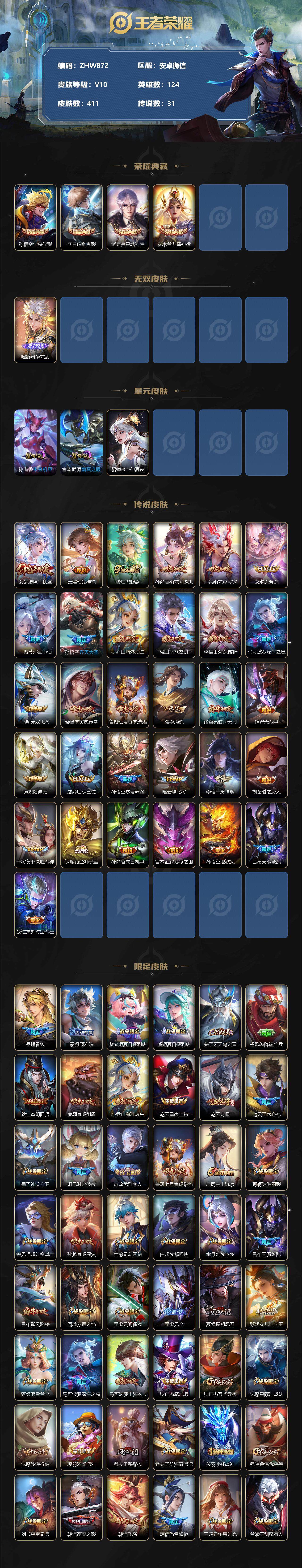 [13086419]安卓WX-V10-124英雄-411皮肤-4典藏-1无双-31传说-138史诗-3星元