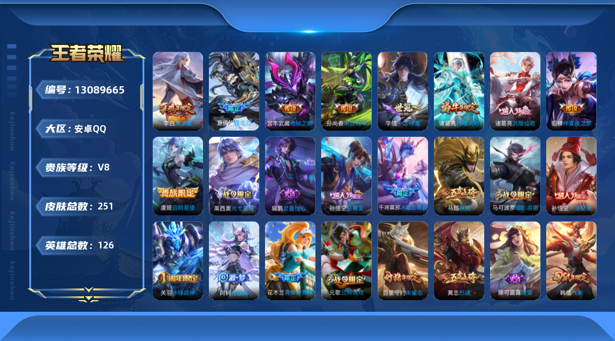 [13089665]安卓Q-V8-最强王者段位-126英雄-251皮肤-0典藏-0珍品无双-0无双-0珍品传说-9传说-73史诗