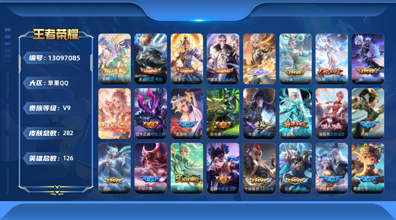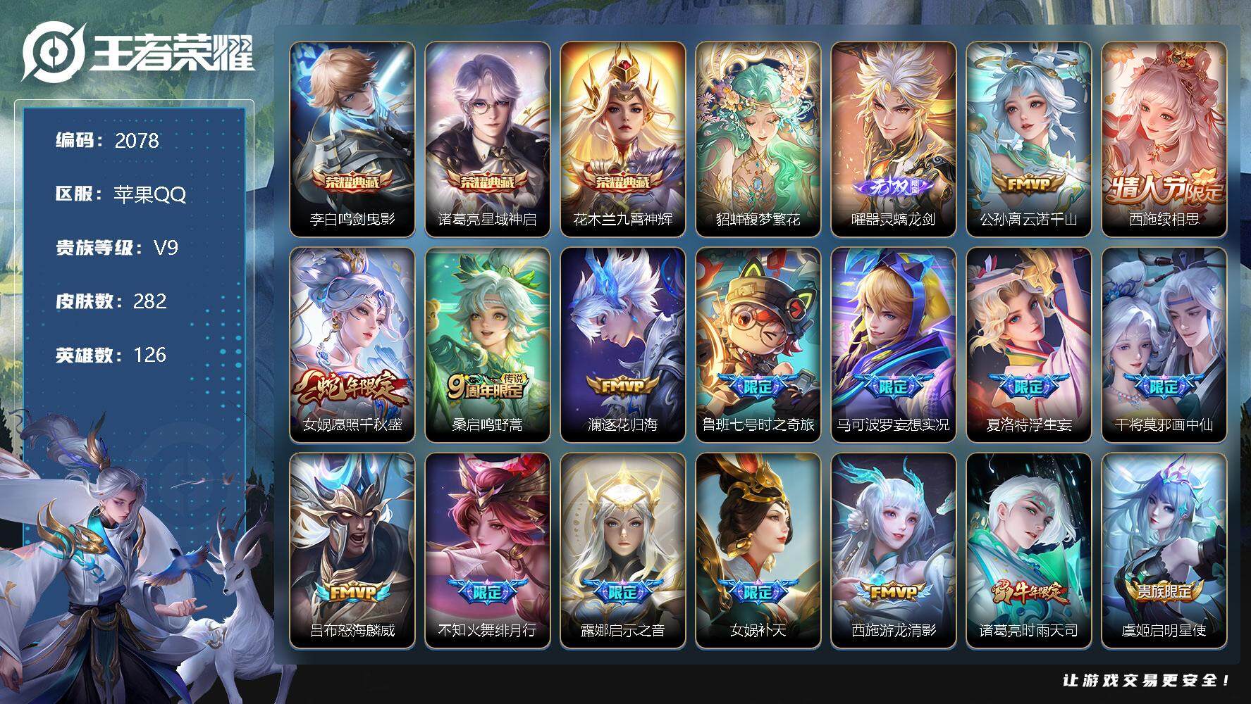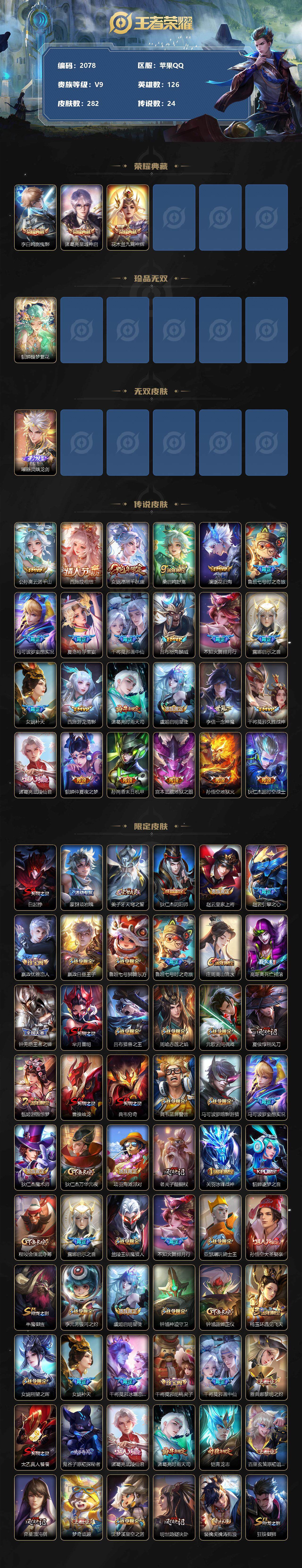 [13097085]苹果Q-V9-永恒钻石III段位-126英雄-282皮肤-3典藏-1珍品无双-1无双-0珍品传说-24传说-80史诗