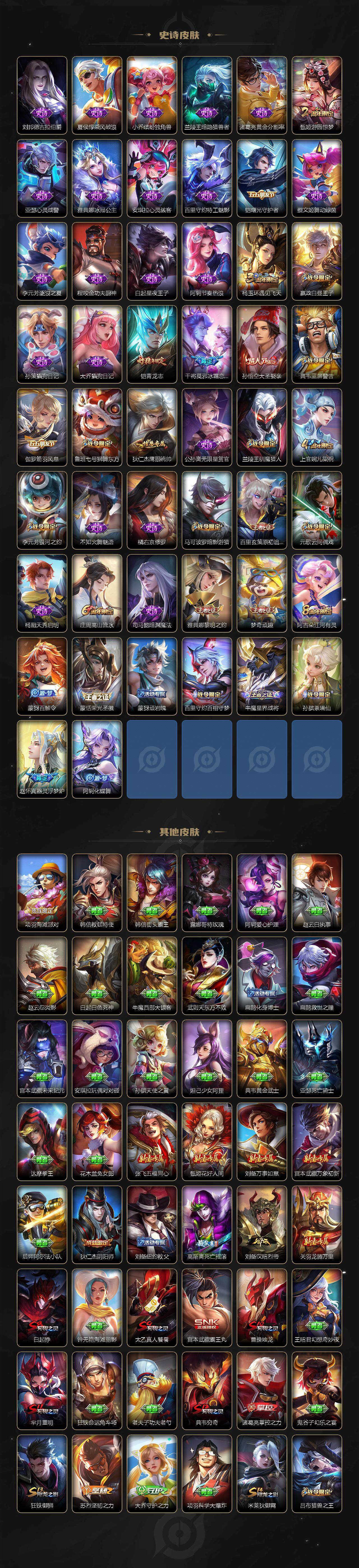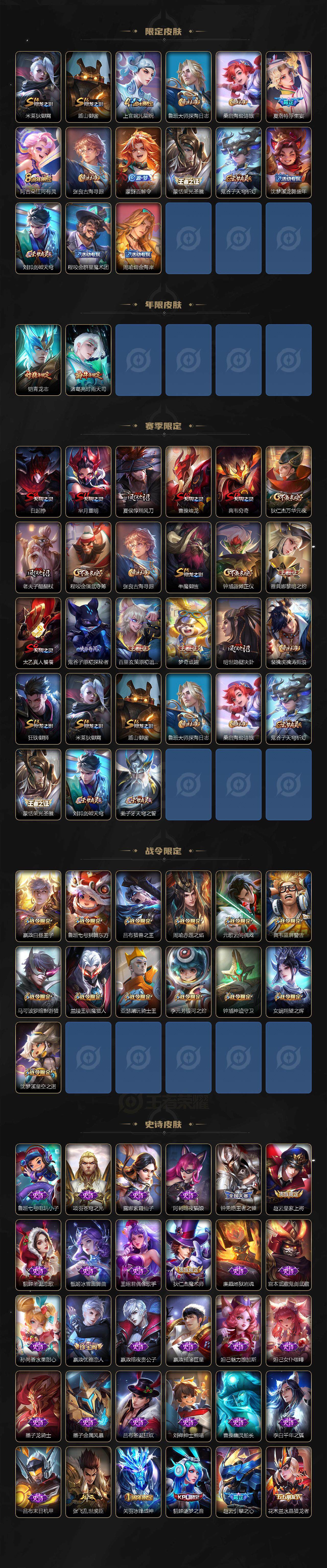 【限定皮肤】:白起狰,蒙犽顽岩魄,姜子牙天穹之誓,狄仁杰阴阳师,赵云皇家上将,赵云引擎之心,嬴政优雅恋人,嬴政白昼王子,鲁班七号狮舞东方,鲁班七号时之奇旅,庄周高山流水,高渐离死亡摇滚,钟无艳王者之锤,芈月重明,吕布猎兽之王,周瑜赤莲之焰,元歌云间偶戏,夏侯惇朔风刀,甄姬游园惊梦,曹操烛龙,典韦穷奇,典韦蓝屏警告,马可波罗暗影游猎,马可波罗妄想实况,狄仁杰魔术师,狄仁杰万华元夜,项羽海滩派对,老夫子醍醐杖,关羽冰锋战神,貂蝉逐梦之音,程咬金演武夺筹,露娜启示之音,兰陵王驯魔猎人,不知火舞绯月行,亚瑟潮玩骑士王,孙悟空大圣娶亲,牛魔御旌,李元芳银河之约,虞姬启明星使,钟馗神迹守卫,钟馗驱傩正仪,杨玉环遇见飞天,女娲朔望之晖,女娲补天,干将莫邪冰霜恋舞曲,干将莫邪胡桃夹子,干将莫邪画中仙,雅典娜黎明之约,太乙真人饕餮,鬼谷子原初探秘者,诸葛亮武陵仙君,诸葛亮时雨天司,铠青龙志,百里玄策原初追逐者,弈星混沌棋,梦奇顽趣,沈梦溪星空之诺,明世隐疑决卦,裴擒虎擒涛扼浪,狂铁御狮,米莱狄御霄,盾山御銮,上官婉儿梁祝,鲁班大师探海日志,桑启海盐诗旅,夏洛特浮生妄,阿古朵江河有灵,张良古海寻踪,蒙犽百解令,蒙恬荣光圣徽,鬼谷子天穹祈灯,沈梦溪龙舞盛年,刘邦剑破天穹,程咬金群星魔术团,周瑜熔金海岸