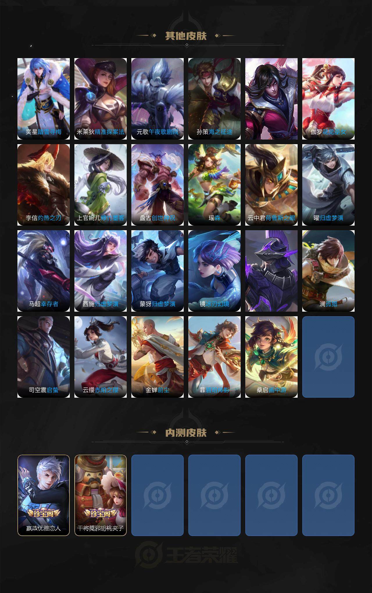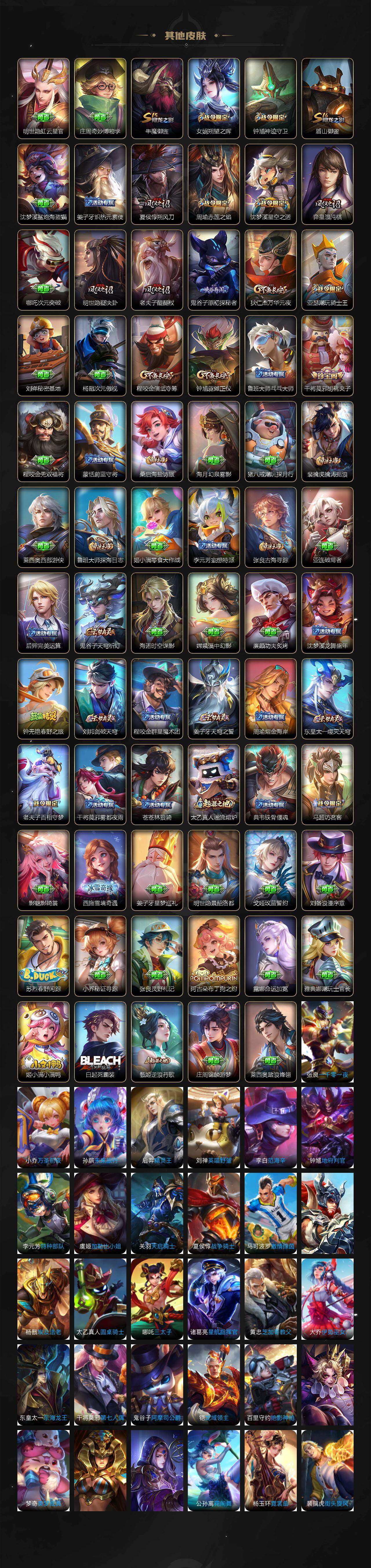 伽罗箭羽风息,李元芳逐浪之夏,不知火舞魅语,公孙离无限星赏官,大乔猫狗日记,孙策猫狗日记,阿轲节奏热浪,露娜紫霞仙子,诸葛亮黄金分割率,王昭君偶像歌手,项羽苍穹之光,阿轲暗夜猫娘,雅典娜冰冠公主,吕布末日机甲,鲁班七号电玩小子,橘右京修罗,墨子龙骑士,嬴政摇滚巨星,刘禅绅士熊喵,白起星夜王子,安琪拉心灵骇客,程咬金功夫厨神,刘邦德古拉伯爵,兰陵王暗隐猎兽者,曹操幽灵船长,宫本武藏鬼剑武藏,司马懿暗渊魔法,亚瑟心灵战警,杨戬天秀·启明,蔡文姬舞动绿茵,廉颇地狱岩魂,小乔缤纷独角兽,夏侯惇乘风破浪,花木兰水晶猎龙者,铠曙光守护者,墨子金属风暴,百里玄策原初追逐者,吕布圣诞狂欢,貂蝉圣诞恋歌,百里守约特工魅影,嬴政暗夜贵公子,雅典娜黎明之约,李白千年之狐,蒙犽百解令,赵怀真器灵·浮梦炉