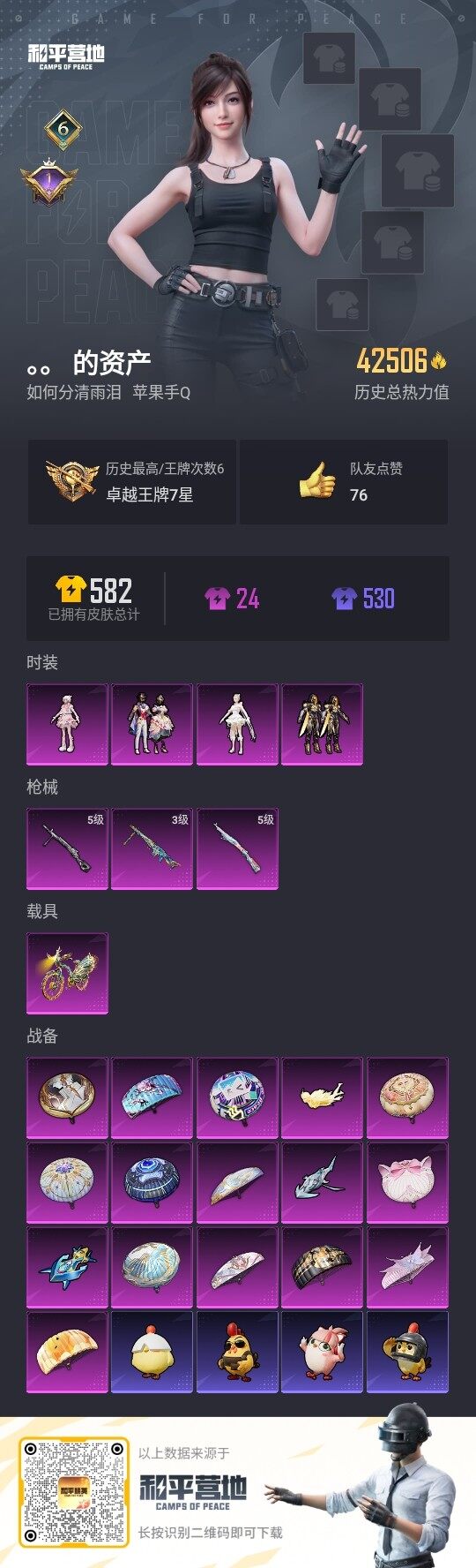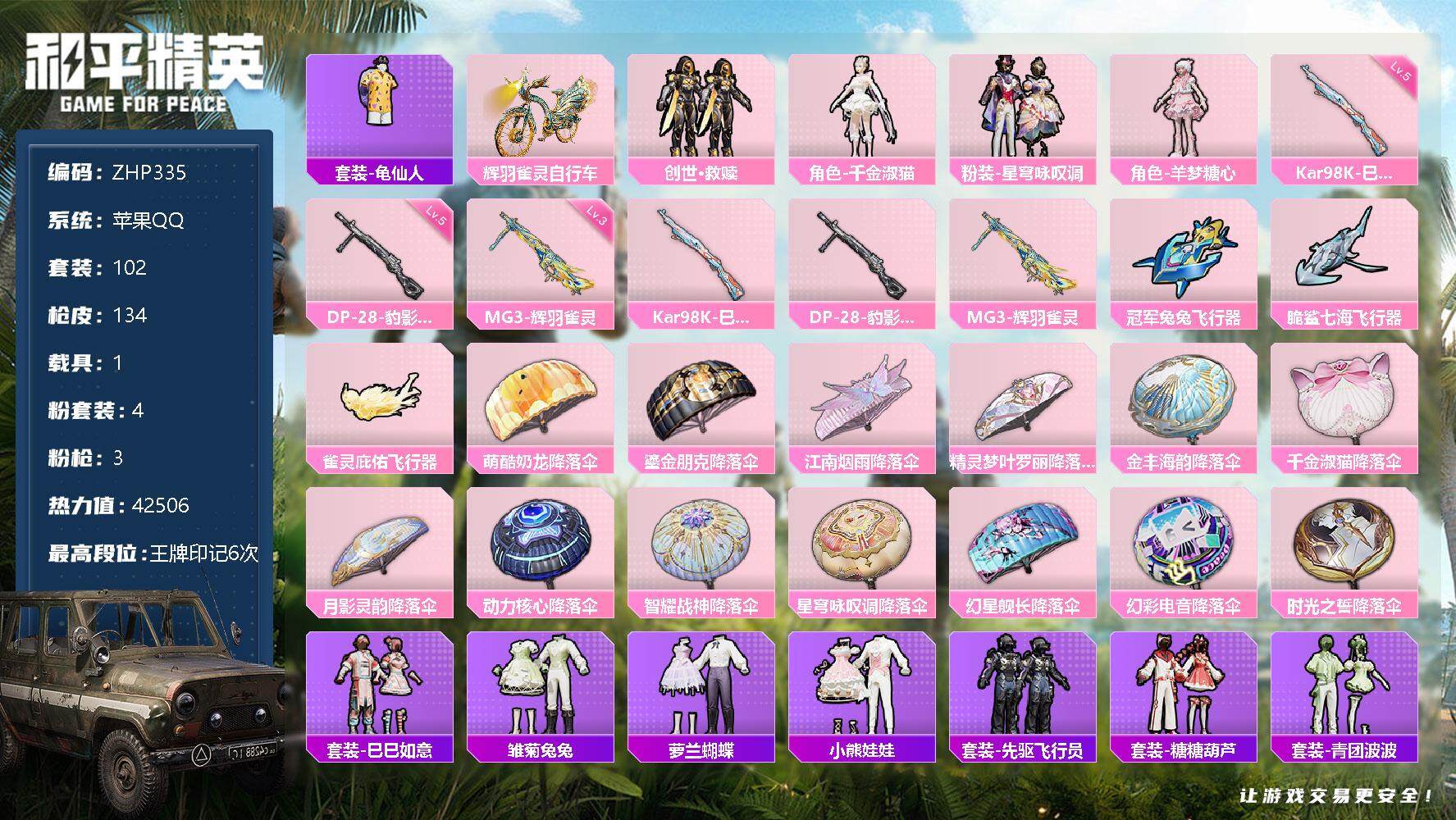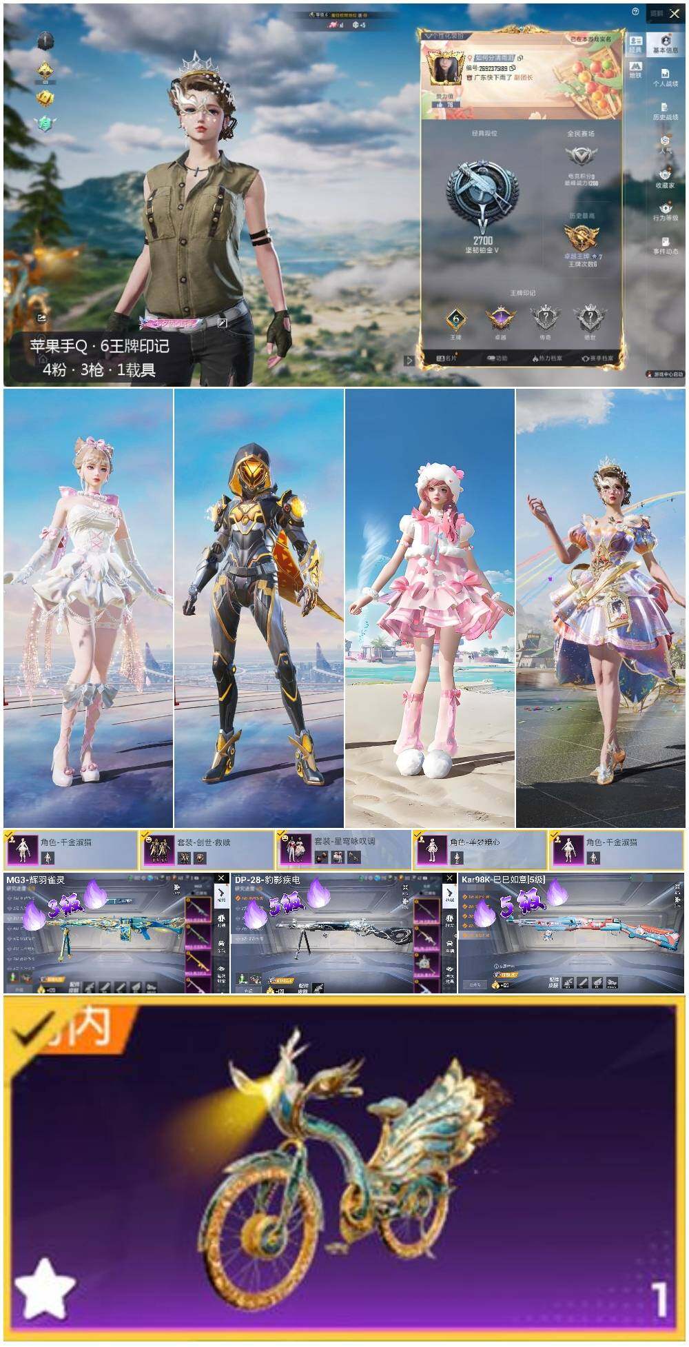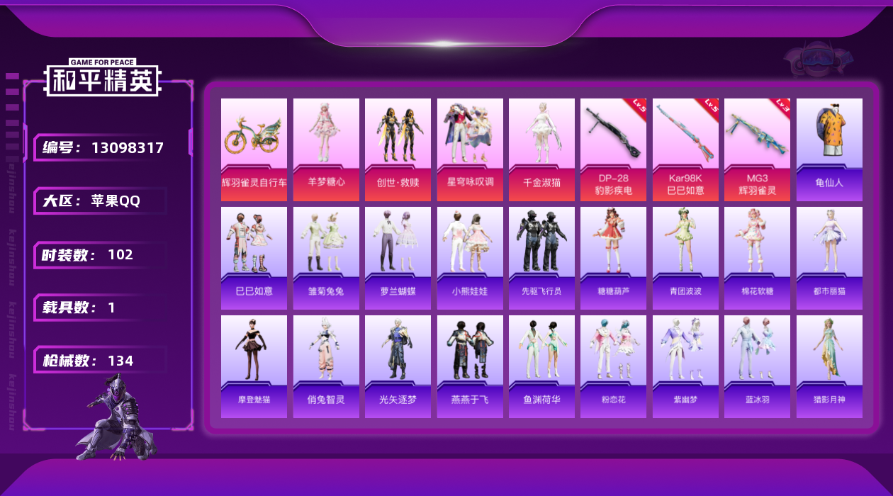 [13098317]地铁满天赋 苹果 手Q-4粉装-3特效枪-1载具-3粉色飞行器-4.2w热力值-6王牌印记-102套装-134枪皮【热门品类】:套装-龟仙人【粉色载具】:辉羽雀灵自行车【粉色套装】:套装-创世·救赎,角色-千金淑猫,粉装-星穹咏叹调,角色-羊梦糖心【粉色枪皮等级】:Kar98K-巳巳如意(五级),DP-28-豹影疾电(五级),MG3-辉羽雀灵(三级)【粉色飞行器】:冠军兔兔飞行器,脆鲨七海飞行器,雀灵庇佑飞行器