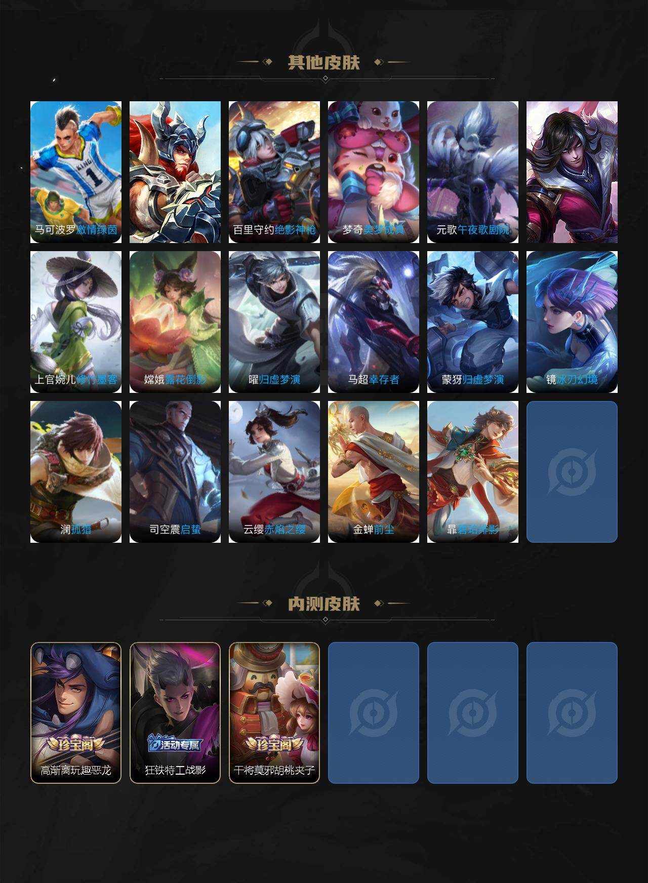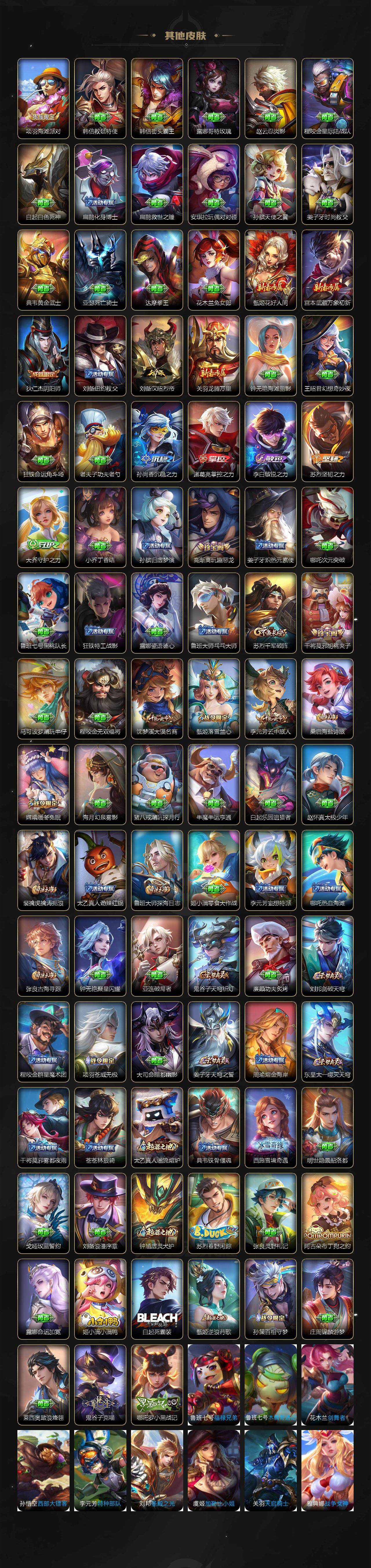 【其他皮肤】:项羽海滩派对,韩信教廷特使,韩信街头霸王,露娜哥特玫瑰,赵云忍炎影,程咬金星际陆战队,白起白色死神,扁鹊化身博士,扁鹊救世之瞳,安琪拉玩偶对对碰,孙膑天使之翼,姜子牙时尚教父,典韦黄金武士,亚瑟死亡骑士,达摩拳王,花木兰兔女郎,甄姬花好人间,宫本武藏万象初新,狄仁杰阴阳师,刘备纽约教父,刘备汉昭烈帝,关羽龙腾万里,钟无艳海滩丽影,王昭君幻想奇妙夜,狂铁命运角斗场,老夫子功夫老勺,孙尚香沉稳之力,诸葛亮掌控