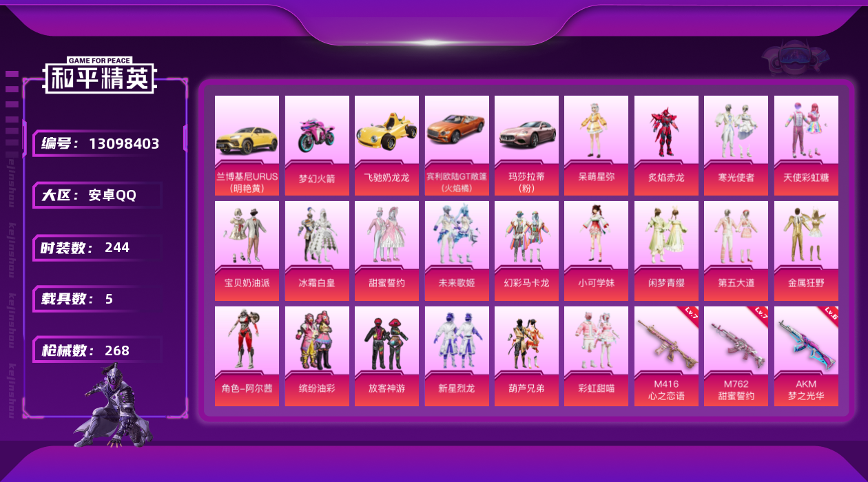 - PX_2097072- 可二次 安卓手Q-11王牌印记-15粉装-7特效枪-2载具-84743热力值-192套装-235枪皮-1卓越印记-0传奇印记 【15粉装】,梦幻火箭,第五大道,极致幻想,炙焰赤龙,土曜战麒,飒粉甜心,碧影闪光,霓裳武神,莲影清波,冰霜白皇,炙焰红王,纯珍童话,心之回忆,星之彼岸,呆萌星弥, 【7特效枪】AKM-梦之光华-7级,SCAR-L-童趣迷兔-7级,M416-心之恋语