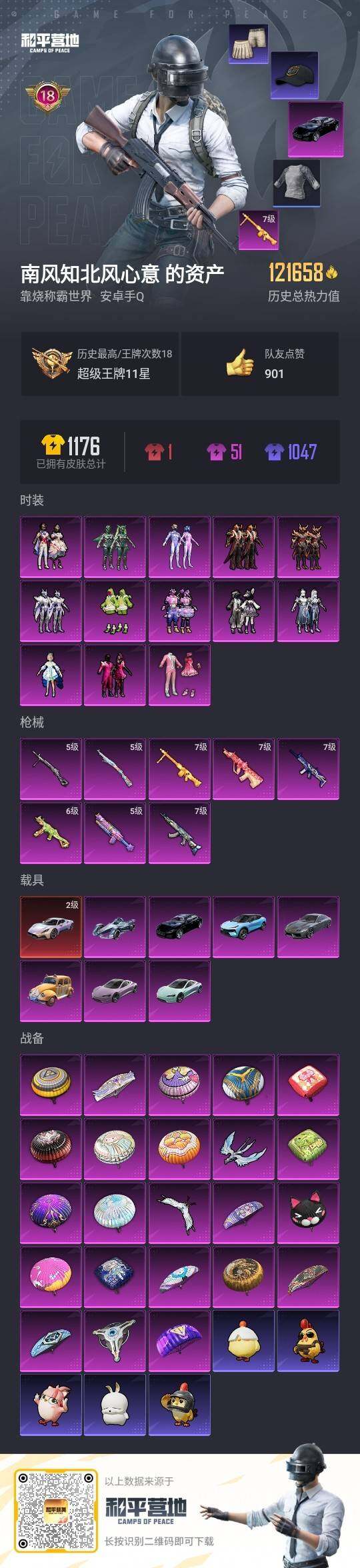 - PX_2090756- 苹果手Q-10王牌印记-有战神框-10粉装-9特效枪-1载具-65420热力值-128套装-204枪皮-6卓越印记-3传奇印记 【10粉装】,放客神游,第五大道,桃粉嫣然,金属狂野,彗云及圣,极限特训,绚金战神,音爆索尼克,未来战士,烟云彩露 【9特效枪】AKM-梦之光华-7级 SCAR-L-锦绣绵绵-5级 M416-电玩时刻-5级 M416-墨龙九天-3级 M416-心之
