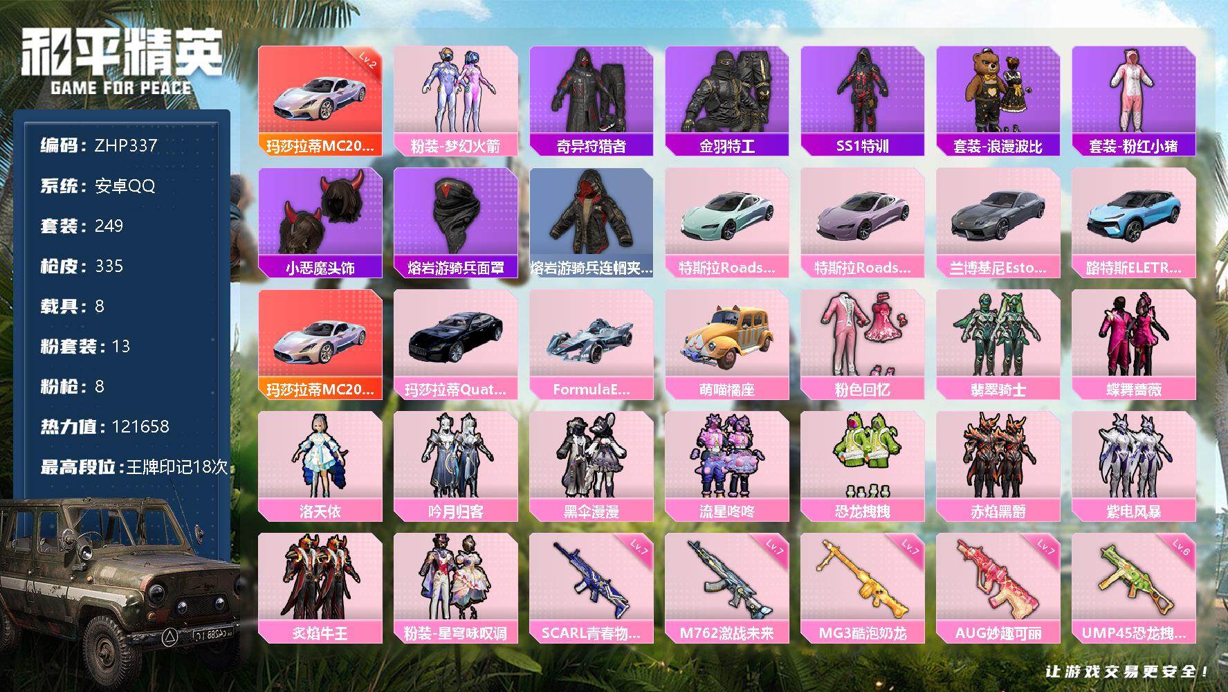 [13098408]素材身法号/扭蛋碎片885/地铁满天赋 安卓 手Q-13粉装-8特效枪-8载具-3粉色飞行器-12.1w热力值-18王牌印记-249套装-335枪皮【红色载具】:玛莎拉蒂MC20(幻星粉)(二级)【热门品类】:粉装-梦幻火箭,套装-奇异狩猎者,套装-金羽特工,套装-SS1特训,套装-浪漫波比,套装-粉红小猪,小恶魔头饰,熔岩游骑兵面罩,熔岩游骑兵连帽夹克【粉色载具】:特斯拉Roadster(水滴蓝),特斯拉Roadster(沁心粉),兰博基尼Estoque(银翼灰),路特斯ELETRE(冰川蓝),玛莎拉蒂MC20(幻星粉),玛莎拉蒂Quattroporte(夜幕蓝),Formula E Gen2(巅峰兰),萌喵橘座【粉色套装】:粉装-粉色回忆,粉装-梦幻火箭,粉装-翡翠骑士,粉装-蝶舞蔷薇,角色-洛天依,粉装-吟月归客,粉装-黑伞漫漫,粉装-流星咚咚,粉装-恐龙拽拽,粉装-赤焰黑爵,粉装-紫电风暴,粉装-炙焰牛王,粉装-星穹咏叹调【粉色枪皮等级】:SCAR-L-青春物语(七级),AUG-妙趣可丽(七级),M762-激战未来(七级),UMP45-恐龙拽拽(六级),野牛-流星咚咚(五级),Kar98K-巳巳如意(五级),DP-28-豹影疾电(五级),MG3-酷泡奶龙(七级)【粉色飞行器】:激战未来飞行器,天之羽翼飞行器,冷魅冰骑飞行器