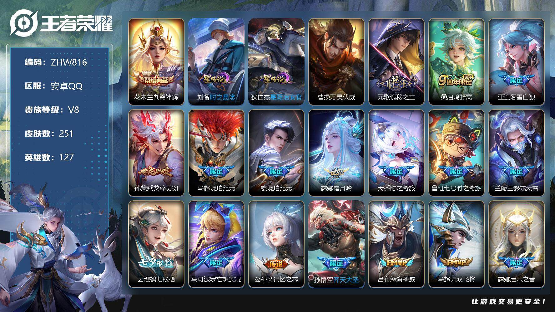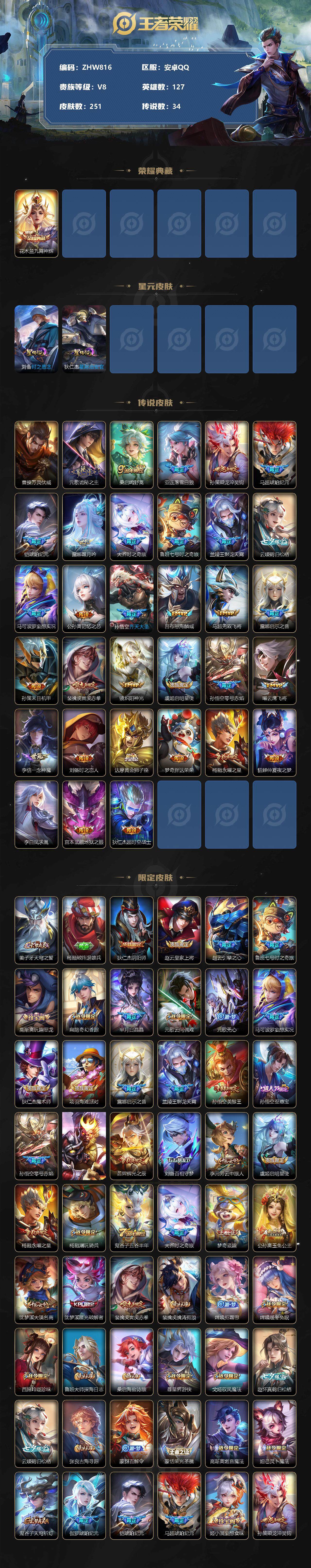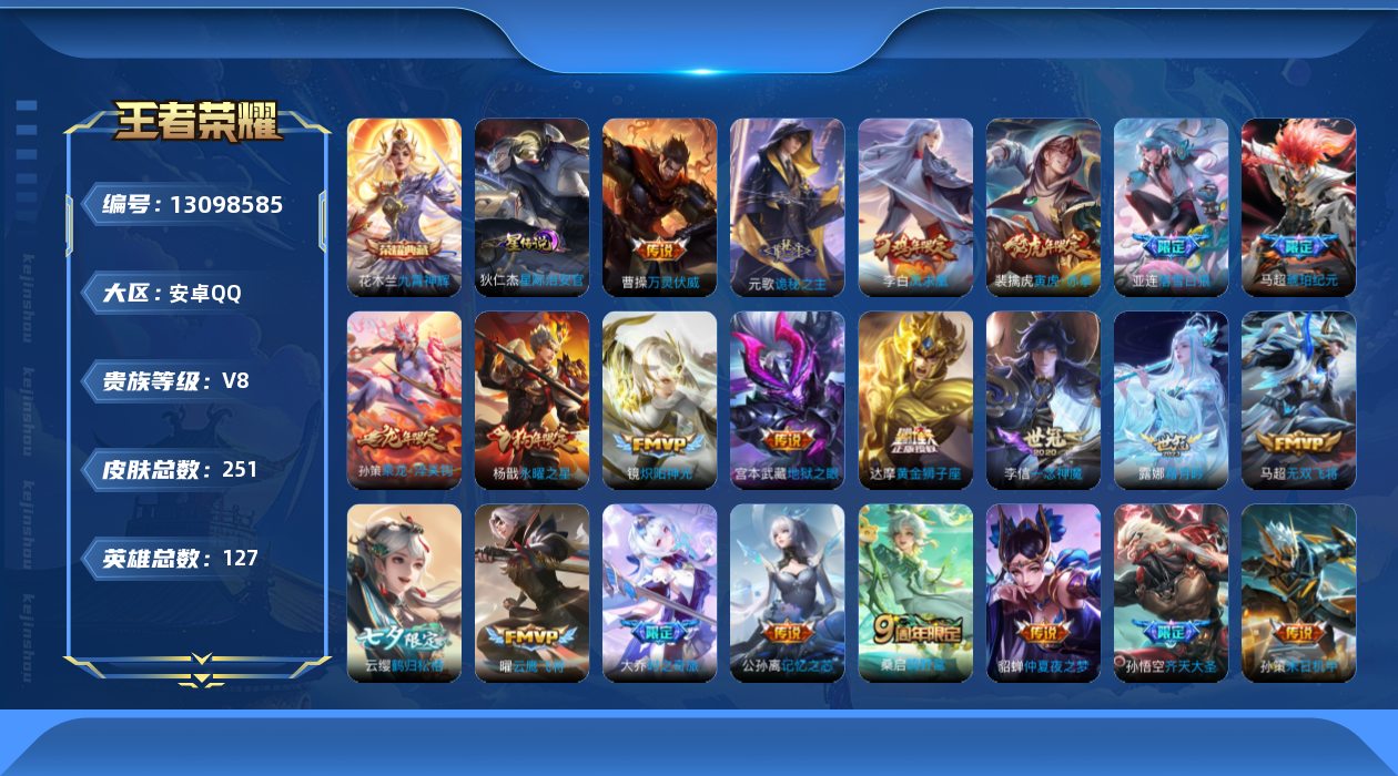 [13098585]【特价急出/详情看图】:安卓Q-V8-最强王者段位-127英雄-251皮肤-1典藏-2星元-34传说-76史诗