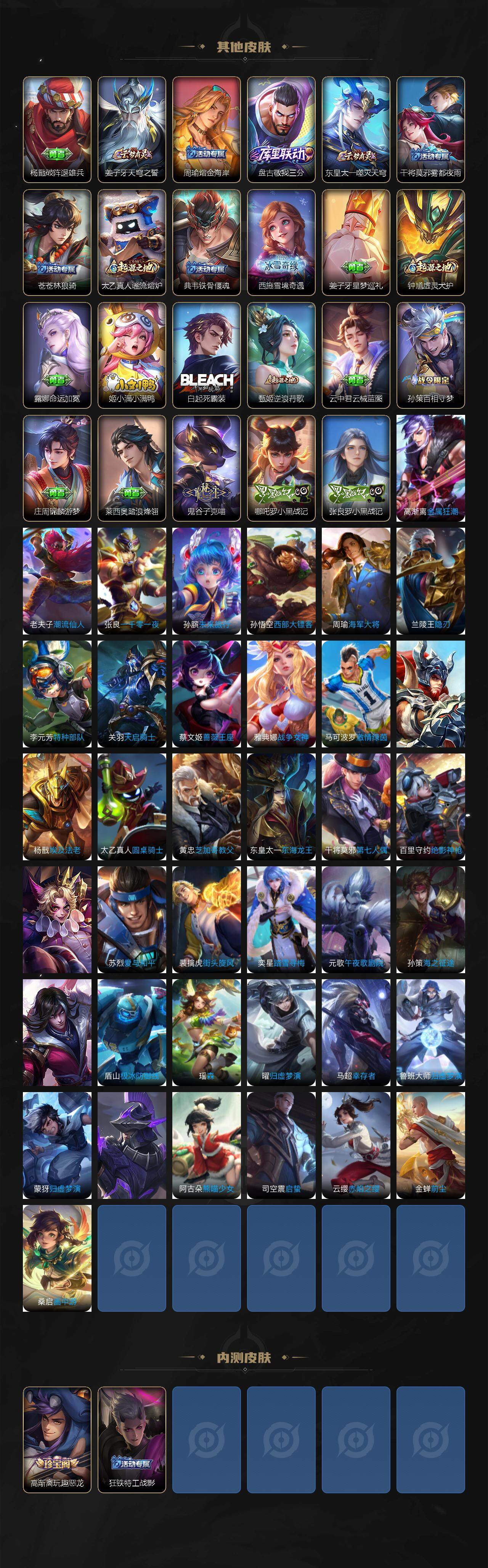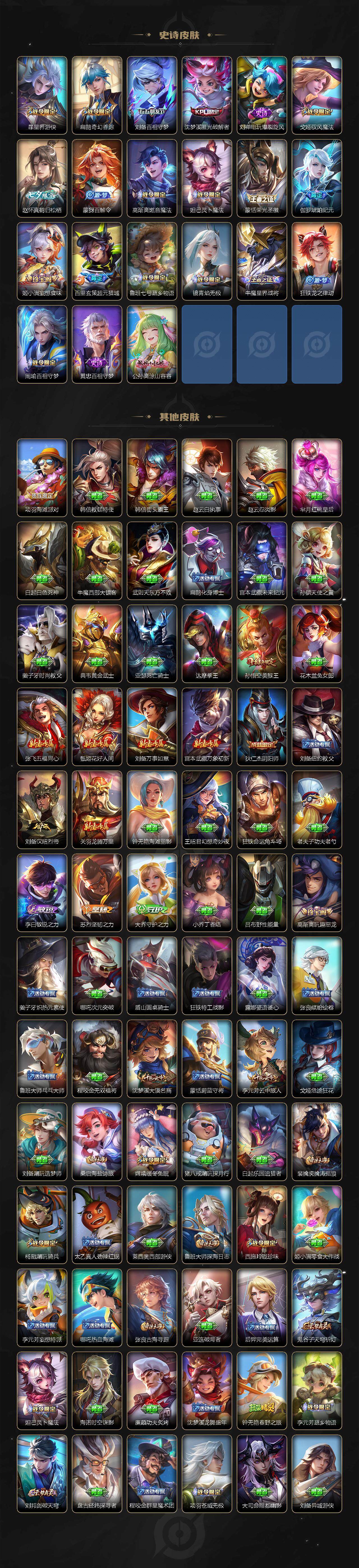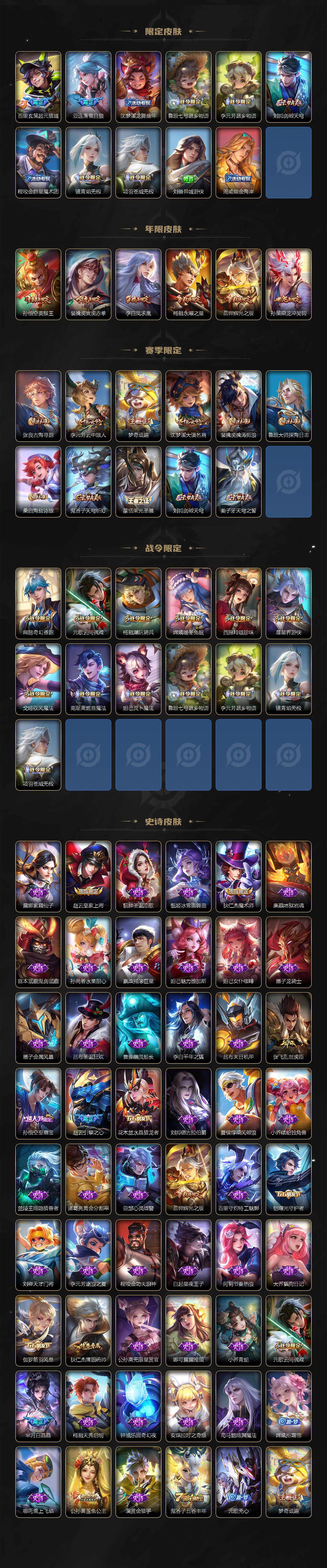 【限定皮肤】:姜子牙天穹之誓,杨戬破阵退雄兵,狄仁杰阴阳师,赵云皇家上将,赵云引擎之心,鲁班七号时之奇旅,高渐离玩趣恶龙,扁鹊奇幻香踪,芈月白晶晶,元歌云间偶戏,元歌无心,马可波罗妄想实况,狄仁杰魔术师,项羽海滩派对,露娜启示之音,兰陵王影龙天霄,孙悟空美猴王,孙悟空至尊宝,孙悟空零号赤焰,孙悟空齐天大圣,后羿辉光之辰,刘备百相守梦,李元芳云中旅人,虞姬启明星使,杨戬永曜之星,杨戬潮玩骑兵,鬼谷子五谷丰年,大乔时之奇旅,梦奇顽趣,公孙离玉兔公主,沈梦溪大漠名商,沈梦溪匿光破解者,裴擒虎寅虎赤拳,裴擒虎擒涛扼浪,嫦娥拒霜思,嫦娥暖冬兔眠,西施玲珑珍味,鲁班大师探海日志,桑启海盐诗旅,暃星界游侠,戈娅驭风魔法,赵怀真鹤归松栖,云缨鹤归松栖,张良古海寻踪,蒙犽百解令,蒙恬荣光圣徽,高渐离燃音魔法,妲己灵卜魔法,鬼谷子天穹祈灯,伽罗琥珀纪元,铠琥珀纪元,马超琥珀纪元,姬小满妄想食味,孙策乘龙淬吴钩,百里玄策超元猎域,亚连落雪白狼,沈梦溪龙舞盛年,鲁班七号蔬乡物语,李元芳蔬乡物语,刘邦剑破天穹,程咬金群星魔术团,镜青焰无极,项羽苍威无极,刘备异域游侠,周瑜熔金海岸