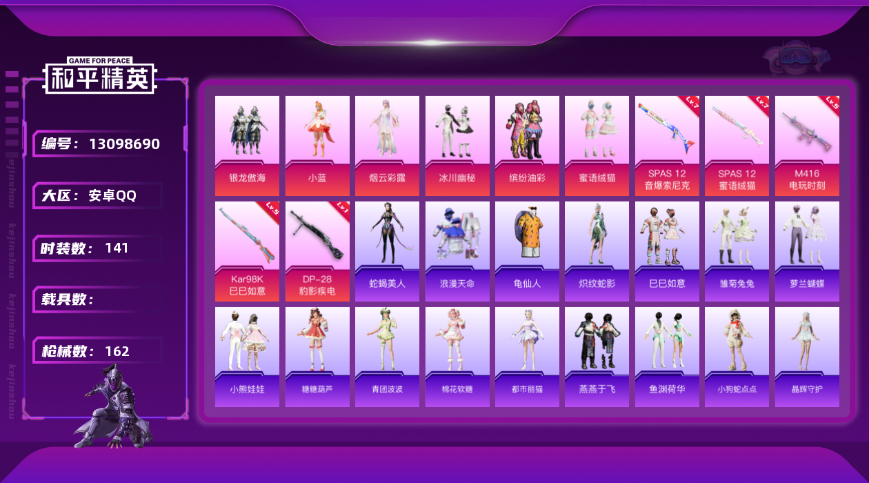 - PX_2004176-2级幽焰骑士-维塔 粉装-金曜白虎,粉装-草莓生巧,粉装-蓝莓炮弹,粉装-岚岚物语 角色-瑰梦爱神 枪械 : M416-五爪金龙,AUG-暖羊咩咩,Kar98K-巳巳如意 【稀有武器皮肤】:AKM-彩虹符号,AKM-恐龙拽拽,AKM-环太平洋,AKM-虎虎生威,M16A4-凝视深渊,M16A4-幻世战舞者,M16A4-甜心亚梦,SCAR-L-炫彩节奏,SCAR-L-玉兔迎