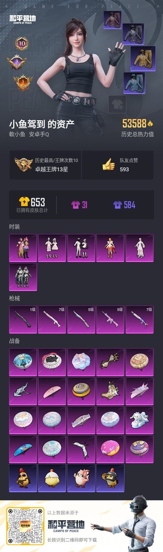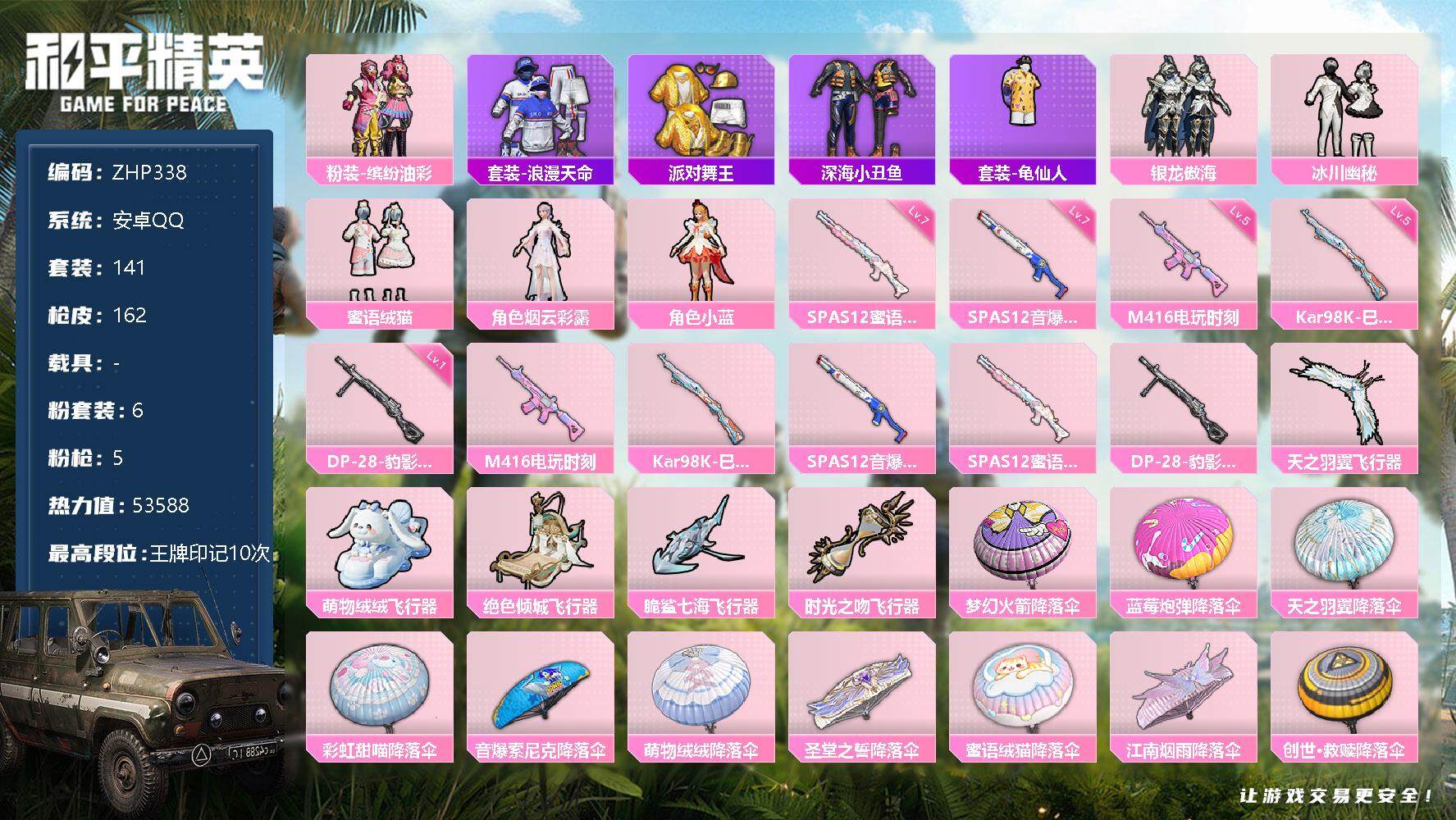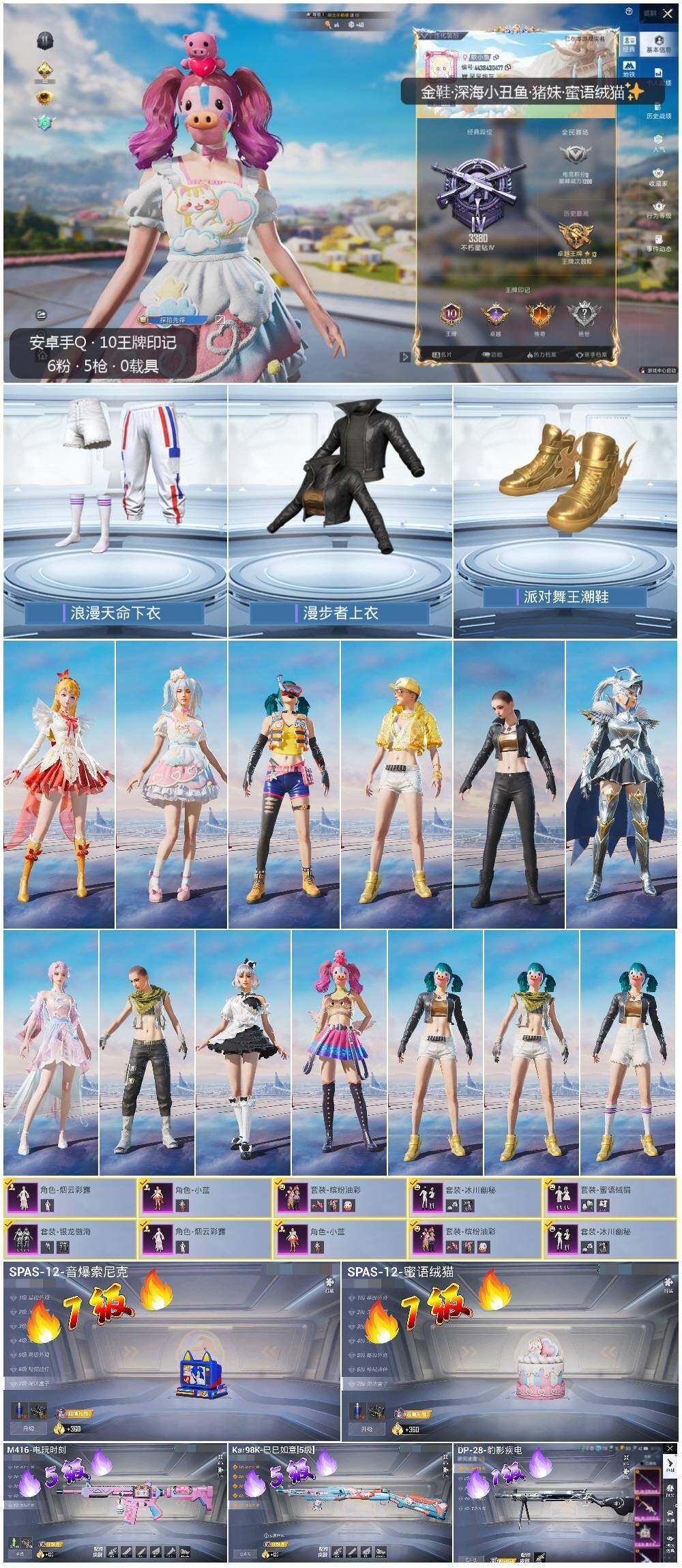 [13098690]安卓 手Q-6粉装-5特效枪-5粉色飞行器-5.3w热力值-10王牌印记-141套装-162枪皮【热门品类】:粉装-缤纷油彩,套装-浪漫天命,套装-派对舞王,套装-深海小丑鱼,套装-龟仙人【粉色套装】:粉装-缤纷油彩,粉装-银龙傲海,粉装-冰川幽秘,粉装-蜜语绒猫,角色-烟云彩露,角色-小蓝【粉色枪皮等级】:M416-电玩时刻(五级),Kar98K-巳巳如意(五级),SPAS-12-音爆索尼克(七级),SPAS-12-蜜语绒猫(七级),DP-28-豹影疾电(一级)【粉色飞行器】:天之羽翼飞行器,萌物绒绒飞行器,绝色倾城飞行器,脆鲨七海飞行器,时光之吻飞行器