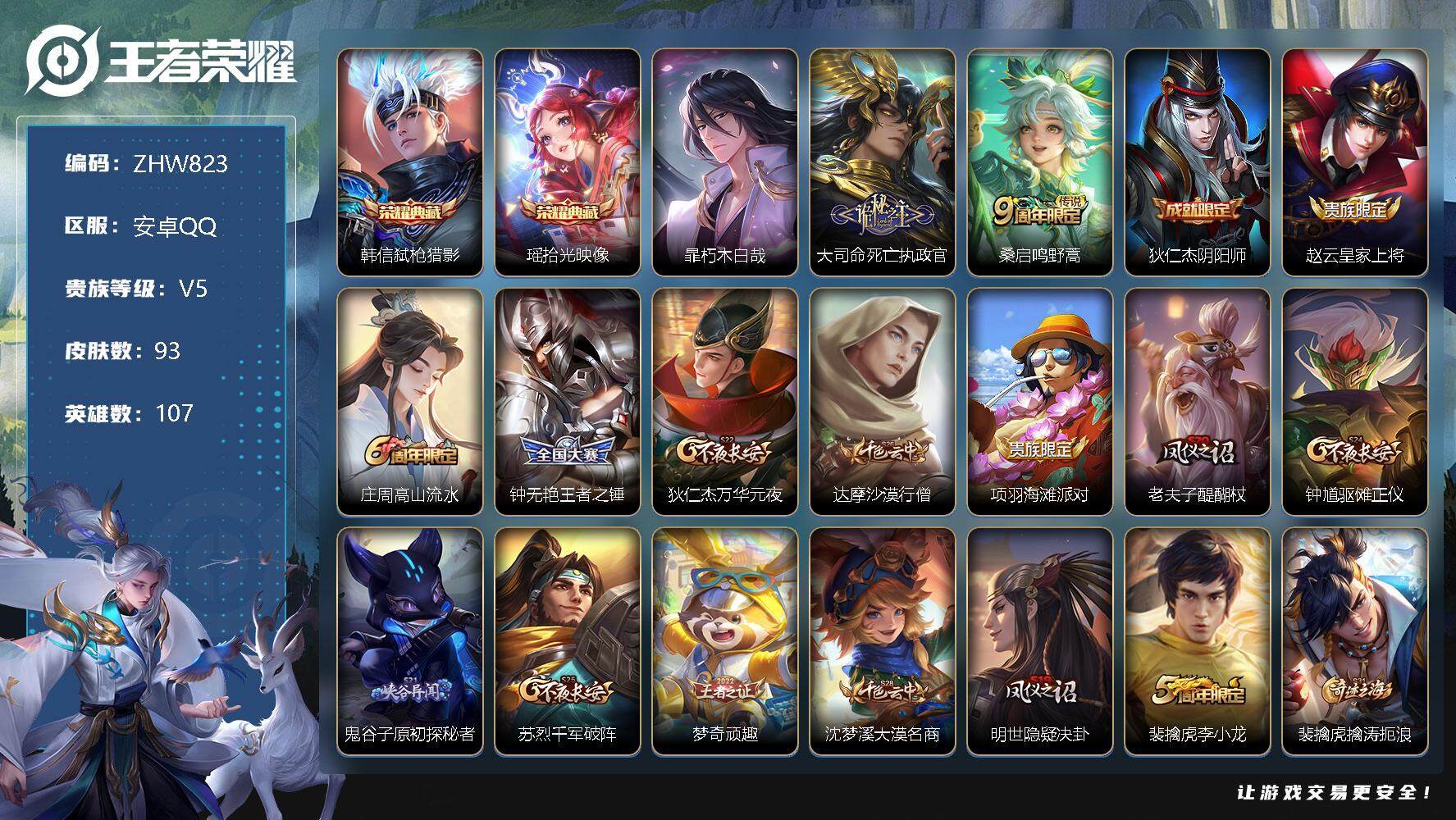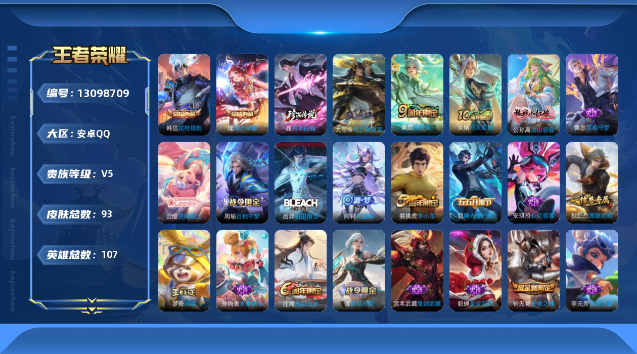 [13098709]【特价急出/详情看图】安卓Q-V5-最强王者段位-107英雄-93皮肤-2典藏-1珍品传说-3传说-22史诗