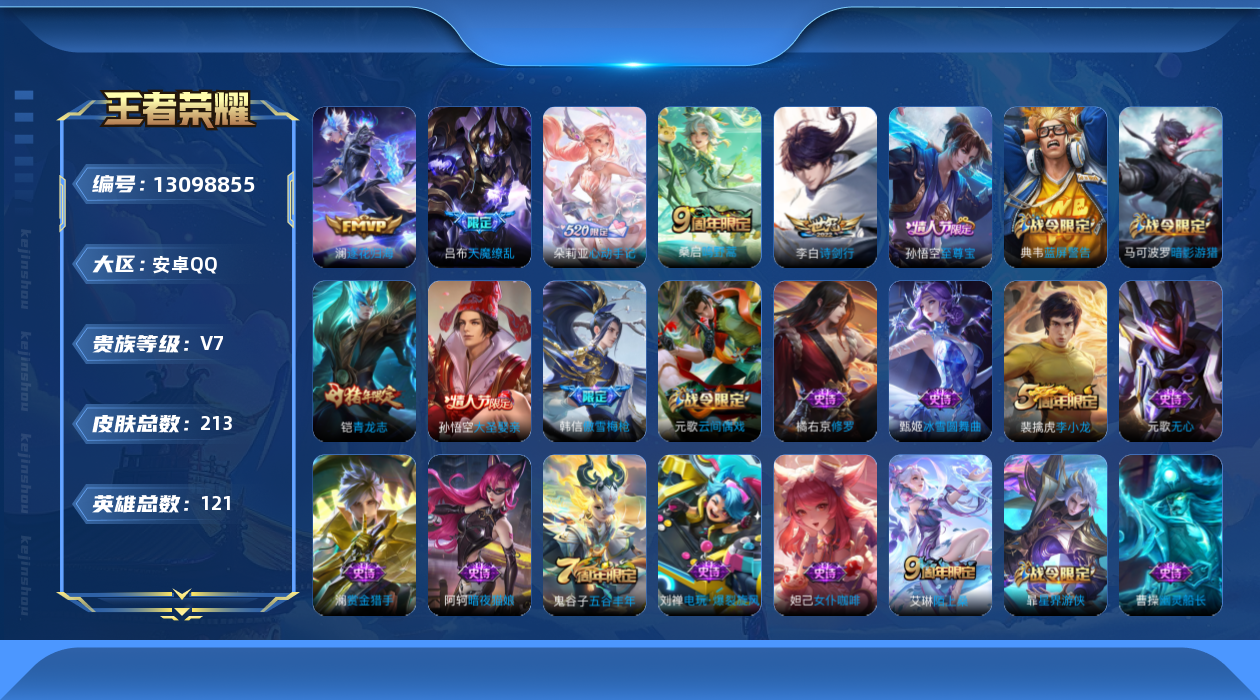 - [11595390]V8 2典藏 7传说 123英雄 271皮肤 可修改实名 优质装备:星域神启(倪克斯贼亮),幻阙歌(貂蝉典藏),久胜战神,仲夏夜之梦(大飞蛾),零号·赤焰,山海·炽霜斩(李信年限) 珍宝阁皮:优雅恋人,女武神 限定皮:梅西,异界灵契(白毛香),绯月行,神威(电光马子),瑞麟志(木兰年限),遇见飞天,高山流水,五谷丰年,游园惊梦,梁祝,天狼溯光者,李小龙,大圣娶亲,神奇女侠,山海·玄木吟(马可年限) 史诗皮:龙之律动,紫霞仙子,苍穹之光,电玩小子(小书包),白龙吟,黄金分割率,特工魅影,江河有灵,高渐离燃音魔法,无限星赏官,偶像歌手,晚萤,电玩·爆裂旋风,暗夜猫娘,猫狗日记-孙策,猫狗日记-大乔,节奏热浪,修罗,女仆咖啡,水果甜心,天才门将,星夜王子,心灵骇客,功夫厨神,德古拉伯爵,暗隐猎兽者,幽灵船长,鬼剑武藏,心灵战警,天秀·启明,舞动绿茵,地狱岩魂,纤云弄巧,繁星吟游(呼啦呼啦),拒霜思,缤纷独角兽,乘风破浪,逐浪之夏,水晶猎龙者,曙光守护者,箭羽风息,金属风暴,圣诞狂欢,圣诞恋歌,鹰眼统帅,暗夜贵公子,魅力维加斯,黎明之约,无心,未来纪元-赵云