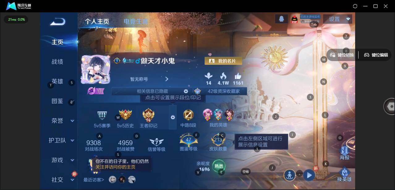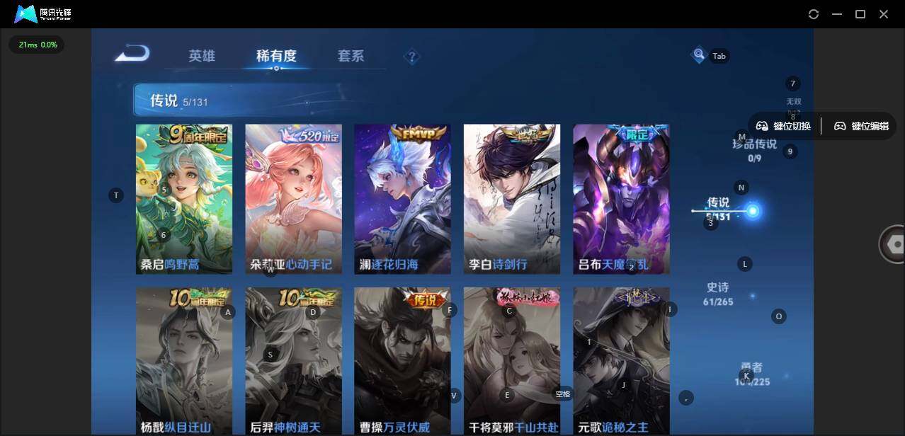 - [11294919]实名: 可修改 贵族等级: V9 英雄数: 125 皮肤数: 261 荣耀水晶: 鸣剑·曳影 无双皮: 器灵·螭龙剑 传说皮: 绛天战甲,炽阳神光,一念神魔,云霓雀翎,末日机甲-孙尚香,地狱火,零号·赤焰,地狱之眼,时之恋人-刘备,无双飞将,山海·炽霜斩,山海·苍雷引,妄想实况,鹤归松栖(云缨),幻光神枪,祥瑞亨通 限定皮: 李小龙,祈雪灵祝,梁祝,御风骁将,时雨天司,龙胆,烈魂,白晶晶,飞衡,凤求凰,至尊宝,默契交锋-兰陵王,默契交锋-花木兰,深海之息,枫霜尽,五谷丰年,诗剑行,山海·玄木吟,鸣野蒿,愿照·九州拓