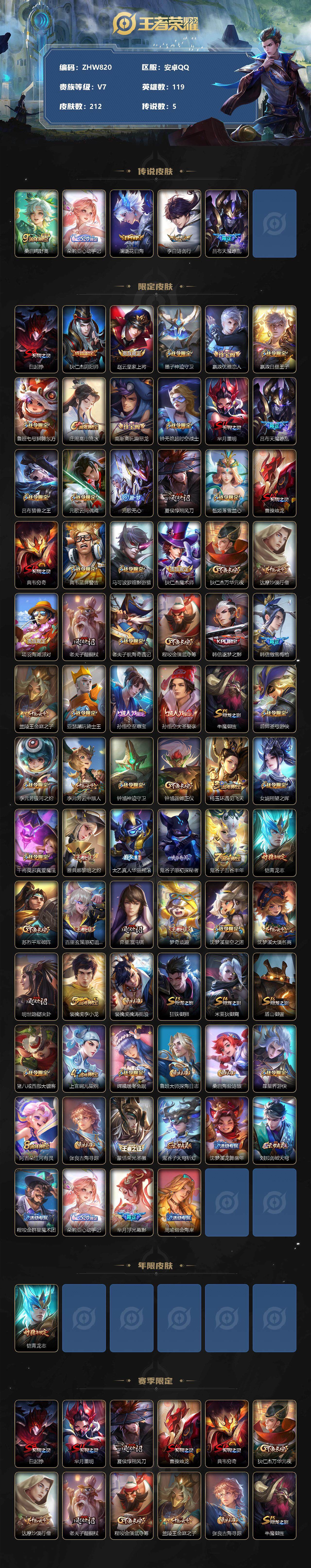 - [13056038]安卓Q-V8-永恒钻石IV段位-124英雄-285皮肤-1典藏-0珍品无双-0无双-0珍品传说-26传说-78史诗 【荣耀典藏】:韩信弑枪猎影 【内测皮肤】:高渐离玩趣恶龙,狂铁特工战影,干将莫邪胡桃夹子 【传说皮肤】:孙悟空地狱火,宫本武藏地狱之眼,孙尚香末日机甲,貂蝉仲夏夜之梦,后羿黄金射手座,干将莫邪久胜战神,张良黄金白羊座,刘备时之恋人,李信一念神魔,曜云鹰飞将,虞姬启明星使,镜炽阳神光,西施游龙清影,王昭君乞巧织情,赵云淬星耀世,马超无双飞将,百里守约碎云,吕布怒海麟威,孙悟空齐天大圣,项羽无限倾心,典韦战鼓燎原,桑启鸣野蒿,云缨幻光神枪,澜愿照九州拓,女娲愿照千秋盛,司空震愿照山河定 【限定皮肤】:白起狰,蔡文姬夏日便利店,大乔绒语心约,虞姬夏日便利店,姜子牙天穹之誓,狄仁杰阴阳师,赵云皇家上将,赵云龙胆,庄周高山流水,高渐离玩趣恶龙,元歌无心,夏侯惇朔风刀,夏侯惇匿光决锋者,甄姬游园惊梦,典韦穷奇,马可波罗山海玄木吟,狄仁杰魔术师,狄仁杰万华元夜,达摩沙漠行僧,项羽海滩派对,项羽无限倾心,老夫子醍醐杖,韩信飞衡,兰陵王金庭之子,孙悟空至尊宝,孙悟空齐天大圣,牛魔御旌,李元芳云中旅人,虞姬启明星使,干将莫邪胡桃夹子,太乙真人饕餮,太乙真人华丽摇滚,鬼谷子五谷丰年,苏烈千军破阵,百里玄策原初追逐者,弈星混沌棋,梦奇顽趣,沈梦溪大漠名商,明世隐疑决卦,裴擒虎李小龙,裴擒虎擒涛扼浪,狂铁御狮,云中君纤云弄巧,盾山御銮,上官婉儿梁祝,嫦娥拒霜思,嫦娥暖冬兔眠,鲁班大师探海日志,桑启海盐诗旅,暃星界游侠,阿古朵江河有灵,张良古海寻踪,蒙犽百解令,鬼谷子天穹祈灯,沈梦溪龙舞盛年,刘邦剑破天穹,刘备异域游侠 【年限皮肤】:韩信飞衡,赵云龙胆,马可波罗山海玄木吟 【赛季限定】:白起狰,夏侯惇朔风刀,典韦穷奇,狄仁杰万华元夜,达摩沙漠行僧,老夫子醍醐杖,兰陵王金庭之子,张良古海寻踪,牛魔御旌,李元芳云中旅人,太乙真人饕餮,苏烈千军破阵,百里玄策原初追逐者,弈星混沌棋,梦奇顽趣,沈梦溪大漠名商,明世隐疑决卦,裴擒虎擒涛扼浪,狂铁御狮,盾山御銮,鲁班大师探海日志,桑启海盐诗旅,鬼谷子天穹祈灯,刘邦剑破天穹,姜子牙天穹之誓 【战令限定】:蔡文姬夏日便利店,虞姬夏日便利店,嫦娥暖冬兔眠,暃星界游侠 【史诗皮肤】:鲁班七号电玩小子,露娜紫霞仙子,赵云皇家上将,赵云未来纪元,貂蝉圣