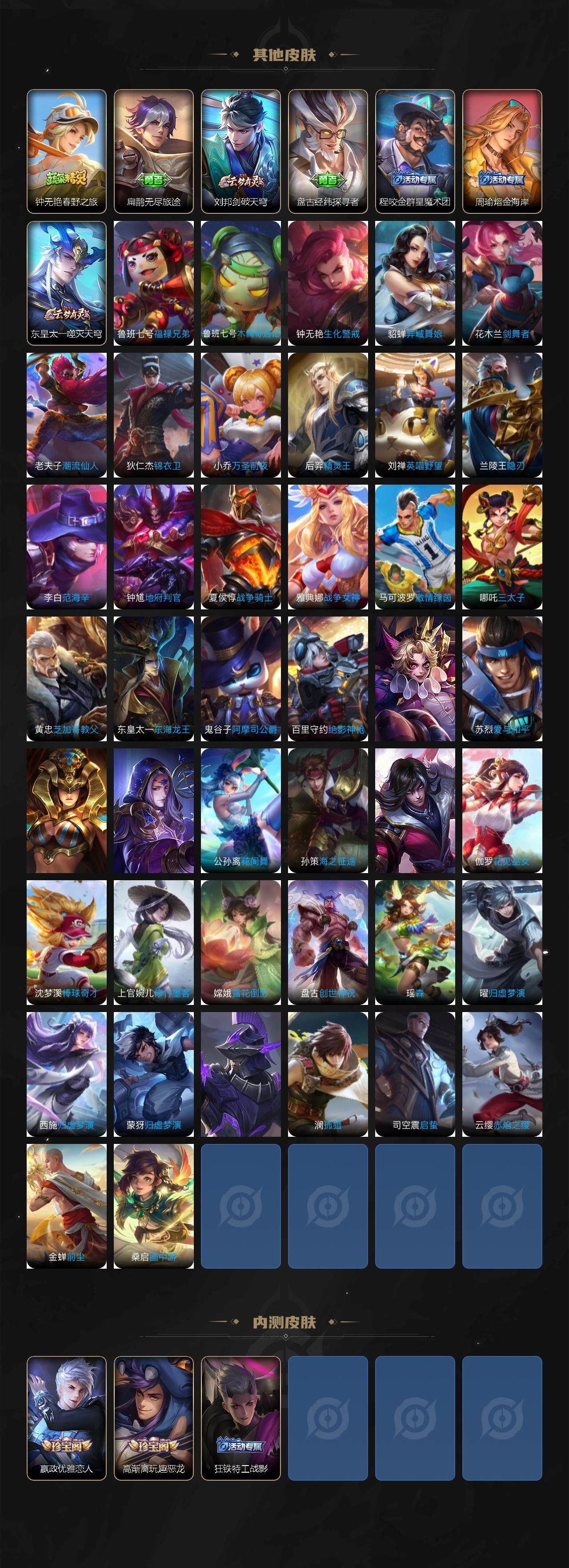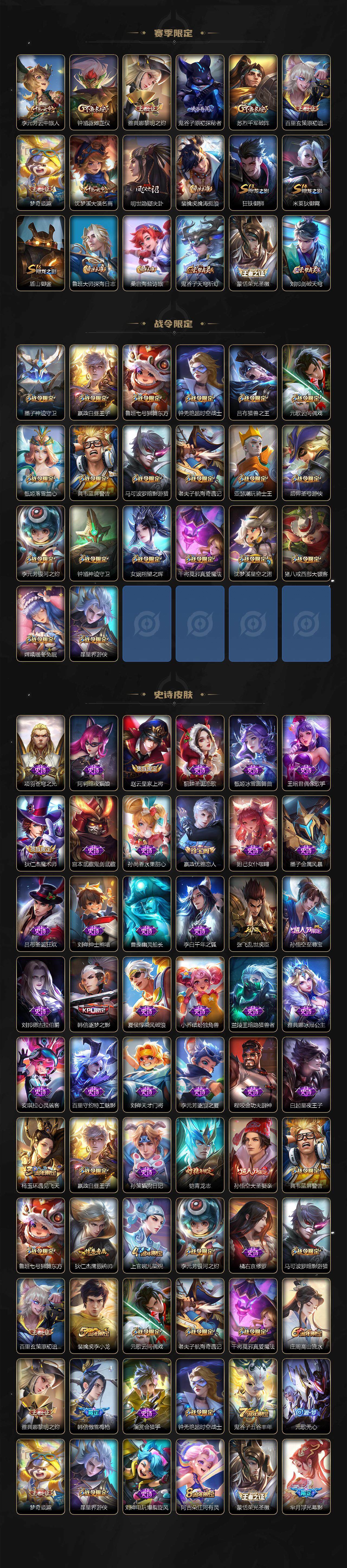 【限定皮肤】:白起狰,狄仁杰阴阳师,赵云皇家上将,墨子神迹守卫,嬴政优雅恋人,嬴政白昼王子,鲁班七号狮舞东方,庄周高山流水,高渐离玩趣恶龙,钟无艳超时空战士,芈月重明,吕布天魔缭乱,吕布猎兽之王,元歌云间偶戏,元歌无心,夏侯惇朔风刀,甄姬落雪兰心,曹操烛龙,典韦穷奇,典韦蓝屏警告,马可波罗暗影游猎,狄仁杰魔术师,狄仁杰万华元夜,达摩沙漠行僧,项羽海滩派对,老夫子醍醐杖,老夫子航海奇遇记,程咬金演武夺筹,韩信逐梦之影,韩信傲雪梅枪,兰陵王金庭之子,亚瑟潮玩骑士王,孙悟空至尊宝,孙悟空大圣娶亲,牛魔御旌,后羿圣弓游侠,李元芳银河之约,李元芳云中旅人,钟馗神迹守卫,钟馗驱傩正仪,杨玉环遇见飞天,女娲朔望之晖,干将莫邪真爱魔法,雅典娜黎明之约,太乙真人华丽摇滚,鬼谷子原初探秘者,鬼谷子五谷丰年,铠青龙志,苏烈千军破阵,百里玄策原初追逐者,弈星混沌棋,梦奇顽趣,沈梦溪星空之诺,沈梦溪大漠名商,明世隐疑决卦,裴擒虎李小龙,裴擒虎擒涛扼浪,狂铁御狮,米莱狄御霄,盾山御銮,猪八戒西部大镖客,上官婉儿梁祝,嫦娥暖冬兔眠,鲁班大师探海日志,桑启海盐诗旅,暃星界游侠,阿古朵江河有灵,张良古海寻踪,蒙恬荣光圣徽,鬼谷子天穹祈灯,沈梦溪龙舞盛年,刘邦剑破天穹,程咬金群星魔术团,朵莉亚心动手记,芈月浮光幕影,周瑜熔金海岸