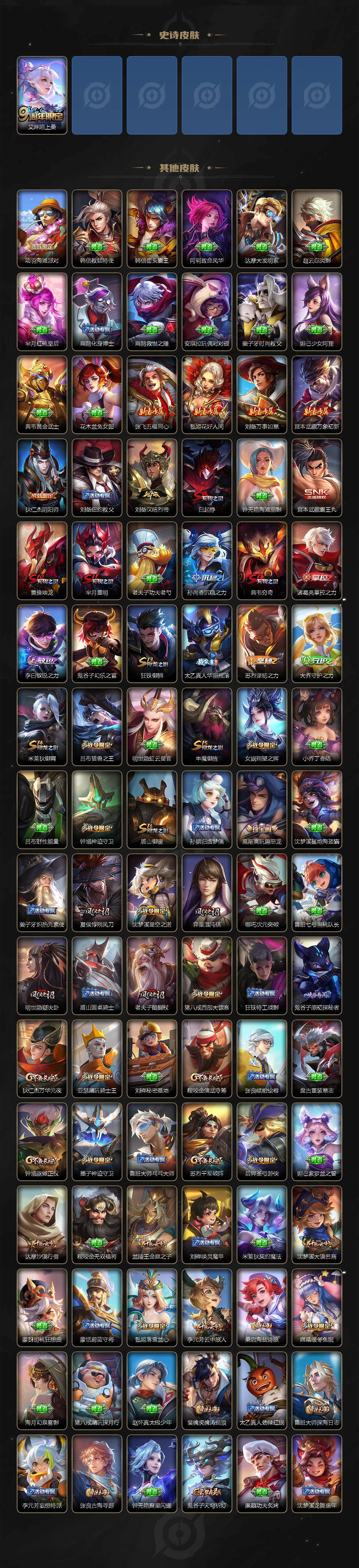 白起狰,曹操烛龙,芈月重明,典韦穷奇,狂铁御狮,米莱狄御霄,牛魔御旌,盾山御銮,夏侯惇朔风刀,明世隐疑决卦,老夫子醍醐杖,鬼谷子原初探秘者,狄仁杰万华元夜,程咬金演武夺筹,钟馗驱傩正仪,苏烈千军破阵,吕布猎兽之王,嬴政白昼王子,女娲朔望之晖,典韦蓝屏警告,钟馗神迹守卫,鲁班七号狮舞东方,沈梦溪星空之诺,李元芳银河之约,马可波罗暗影游猎,元歌云间偶戏,弈星混沌棋,达摩沙漠行僧,兰陵王金庭之子,沈梦溪大漠名商,李元芳云中旅人,桑启海盐诗旅,裴擒虎擒涛扼浪,鲁班大师探海日志,张良古海寻踪