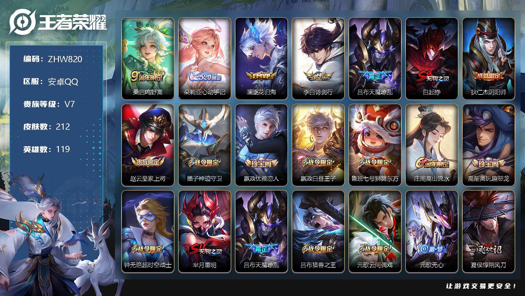 [13098855]【特价急出/详情看图】安卓Q-V7-秩序白银III段位-119英雄-212皮肤-5传说-61史诗 【英雄全皮】:蒙恬全皮 【传说皮肤】:桑启鸣野蒿,朵莉亚心动手记,澜逐花归海,李白诗剑行,吕布天魔缭乱 【限定皮肤】:白起狰,狄仁杰阴阳师,赵云皇家上将,墨子神迹守卫,嬴政优雅恋人,嬴政白昼王子,鲁班七号狮舞东方,庄周高山流水,高渐离玩趣恶龙,钟无艳超时空战士,芈月重明,吕布天魔缭乱,吕布猎兽之王,元歌云间偶戏,元歌无心,夏侯惇朔风刀,甄姬落雪兰心,曹操烛龙,典韦穷奇,典韦蓝屏警告,马可波罗暗影游猎,狄仁杰魔术师,狄仁杰万华元夜,达摩沙漠行僧,项羽海滩派对,老夫子醍醐杖,老夫子航海奇遇记,程咬金演武夺筹,韩信逐梦之影,韩信傲雪梅枪,兰陵王金庭之子,亚瑟潮玩骑士王,孙悟空至尊宝,孙悟空大圣娶亲,牛魔御旌,后羿圣弓游侠,李元芳银河之约,李元芳云中旅人,钟馗神迹守卫,钟馗驱傩正仪,杨玉环遇见飞天,女娲朔望之晖,干将莫邪真爱魔法,雅典娜黎明之约,太乙真人华丽摇滚,鬼谷子原初探秘者,鬼谷子五谷丰年,铠青龙志,苏烈千军破阵,百里玄策原初追逐者,弈星混沌棋,梦奇顽趣,沈梦溪星空之诺,沈梦溪大漠名商,明世隐疑决卦,裴擒虎李小龙,裴擒虎擒涛扼浪,狂铁御狮,米莱狄御霄,盾山御銮,猪八戒西部大镖客,上官婉儿梁祝,嫦娥暖冬兔眠,鲁班大师探海日志,桑启海盐诗旅,暃星界游侠,阿古朵江河有灵,张良古海寻踪,蒙恬荣光圣徽,鬼谷子天穹祈灯,沈梦溪龙舞盛年,刘邦剑破天穹,程咬金群星魔术团,朵莉亚心动手记,芈月浮光幕影,周瑜熔金海岸 【年限皮肤】:铠青龙志 【赛季限定】:白起狰,芈月重明,夏侯惇朔风刀,曹操烛龙,典韦穷奇,狄仁杰万华元夜,达摩沙漠行僧,老夫子醍醐杖,程咬金演武夺筹,兰陵王金庭之子,张良古海寻踪,牛魔御旌,李元芳云中旅人,钟馗驱傩正仪,雅典娜黎明之约,鬼谷子原初探秘者,苏烈千军破阵,百里玄策原初追逐者,弈星混沌棋,梦奇顽趣,沈梦溪大漠名商,明世隐疑决卦,裴擒虎擒涛扼浪,狂铁御狮,米莱狄御霄,盾山御銮,鲁班大师探海日志,桑启海盐诗旅,鬼谷子天穹祈灯,蒙恬荣光圣徽,刘邦剑破天穹 【战令限定】:墨子神迹守卫,嬴政白昼王子,鲁班七号狮舞东方,钟无艳超时空战士,吕布猎兽之王,元歌云间偶戏,甄姬落雪兰心,典韦蓝屏警告,马可波罗暗影游猎,老夫子航海奇遇记,亚瑟潮玩骑士王,后羿圣弓游侠,李元芳银河之约,钟馗
