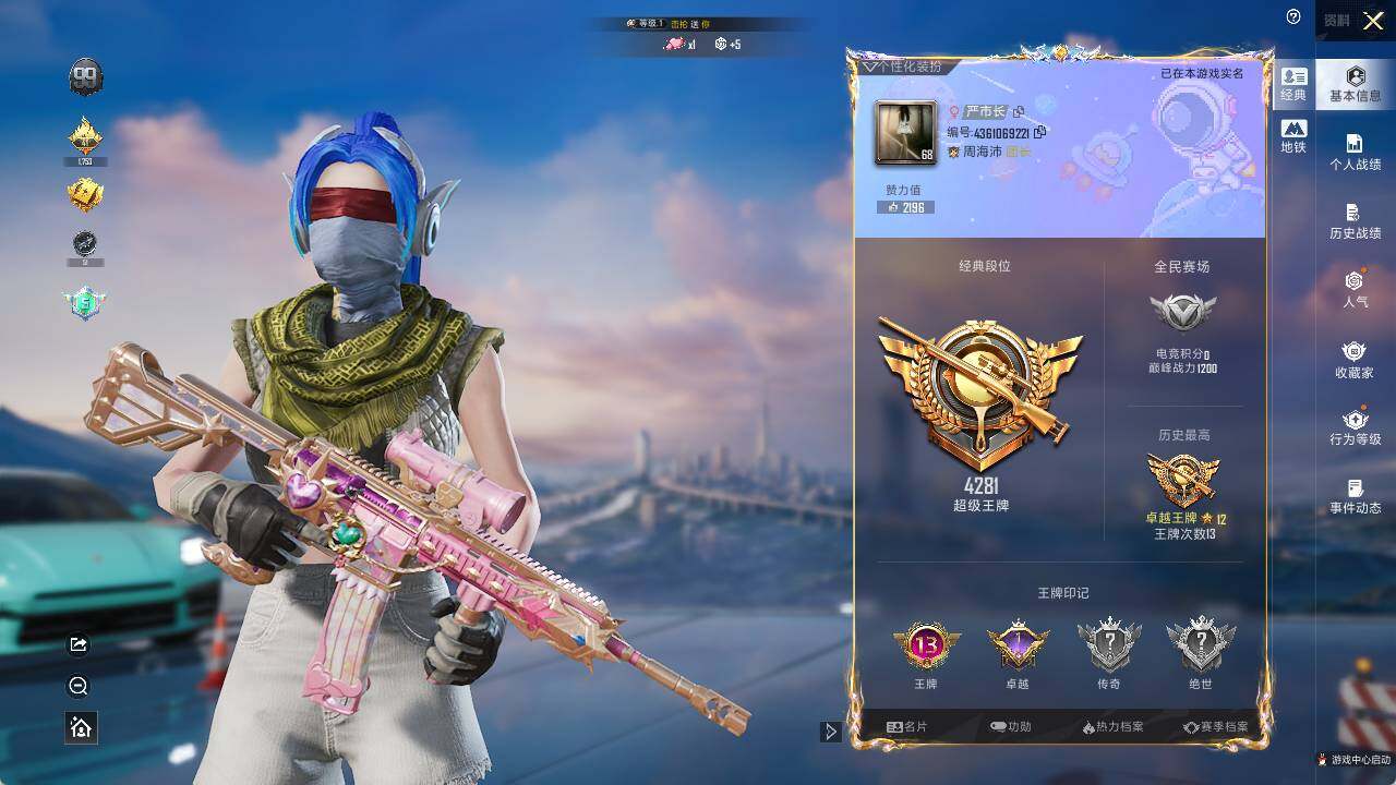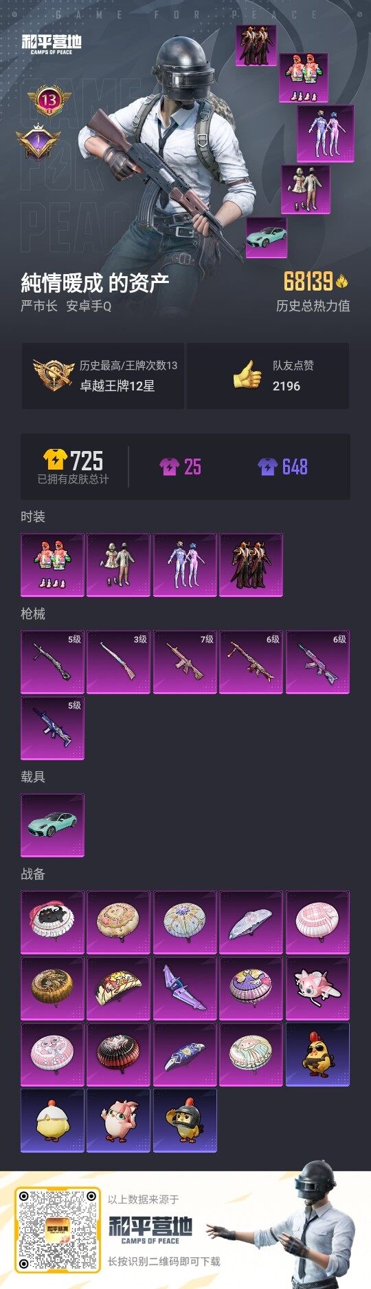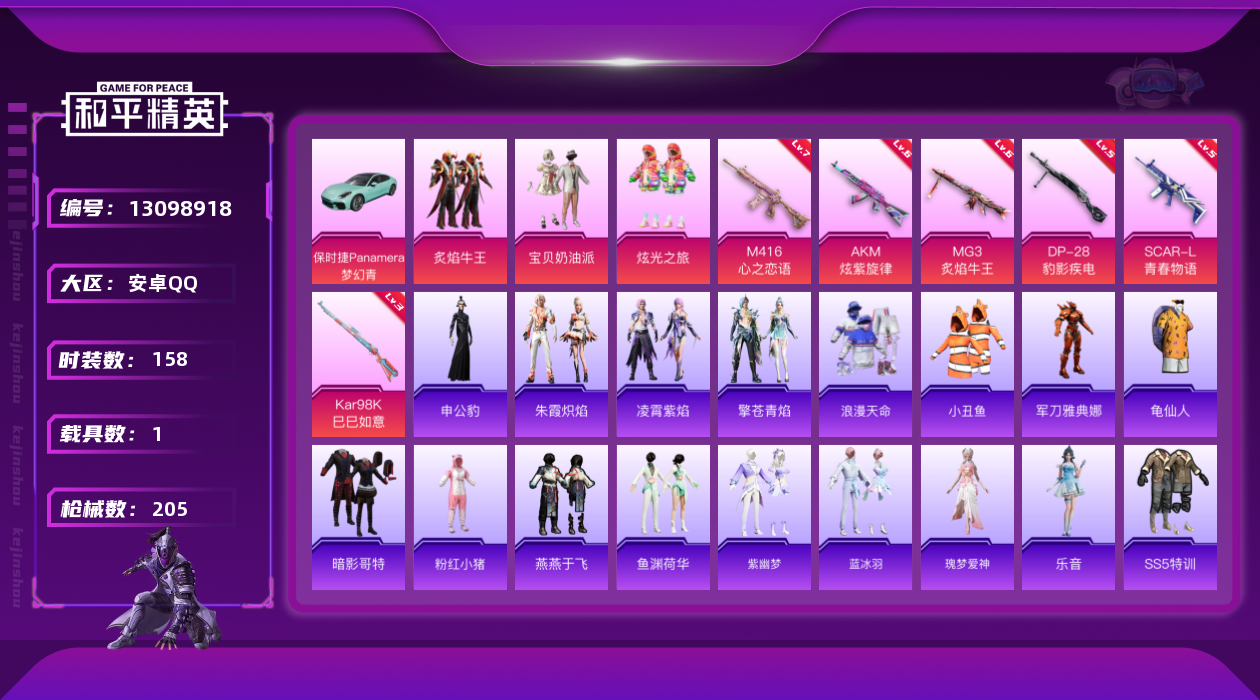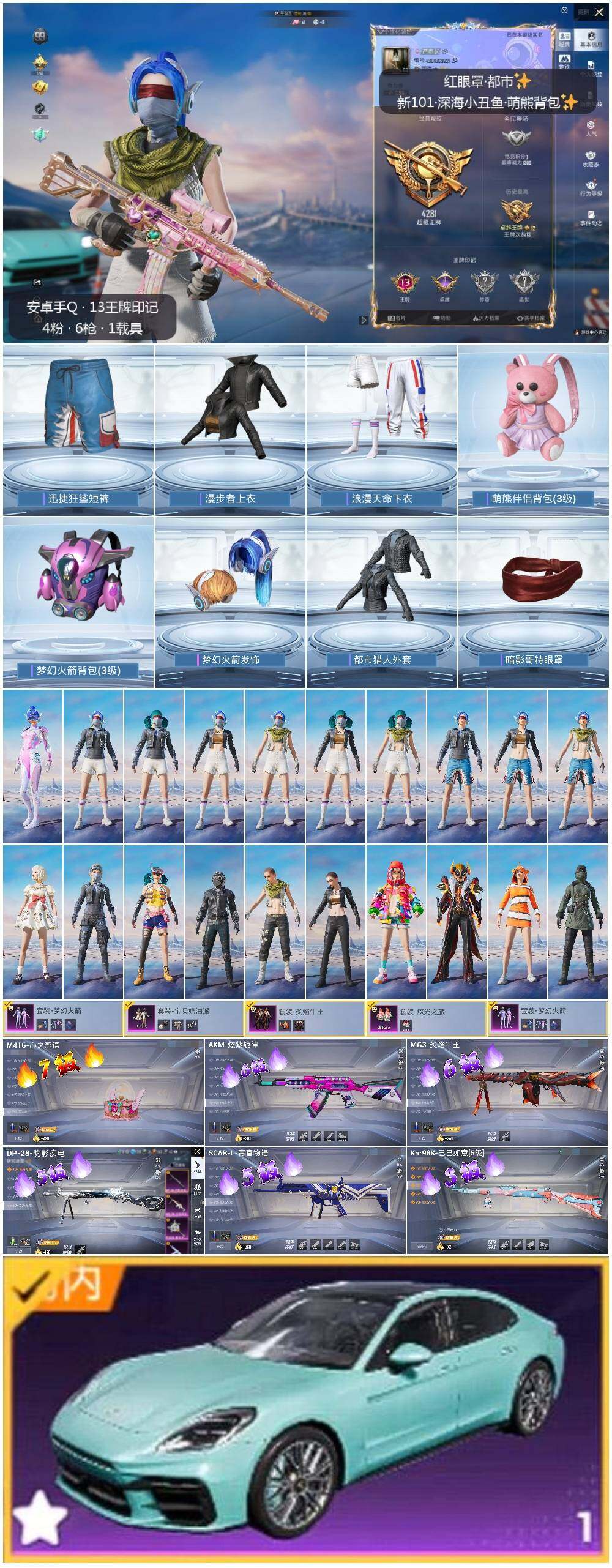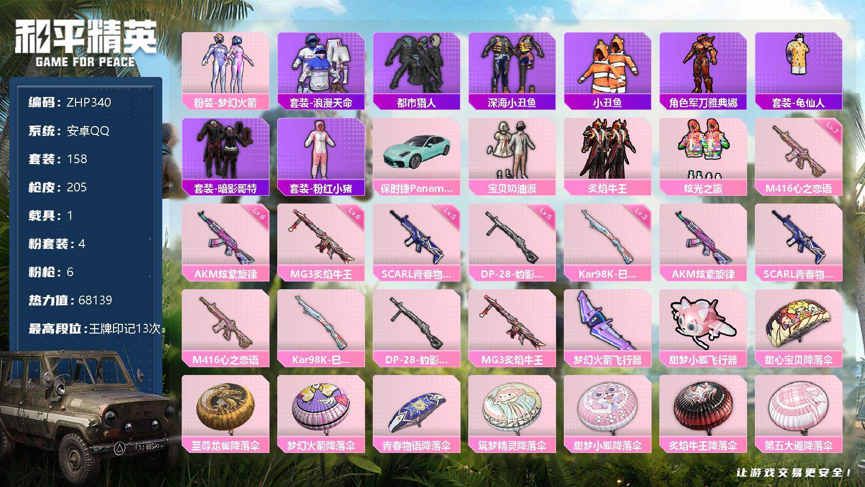 [13098918]素材身法号 安卓 手Q-4粉装-6特效枪-1载具-2粉色飞行器-6.8w热力值-13王牌印记-158套装-205枪皮【热门品类】:粉装-梦幻火箭,套装-浪漫天命,套装-都市猎人,套装-深海小丑鱼,套装-小丑鱼,角色-军刀雅典娜,套装-龟仙人,套装-暗影哥特,套装-粉红小猪【粉色载具】:保时捷Panamera(梦幻青)【粉色套装】:粉装-宝贝奶油派,粉装-梦幻火箭,粉装-炙焰牛王,粉装-炫光之旅【粉色枪皮等级】:AKM-炫紫旋律(六级),SCAR-L-青春物语(五级),M416-心之恋语(七级),Kar98K-巳巳如意(三级),DP-28-豹影疾电(五级),MG3-炙焰牛王(六级)【粉色飞行器】:梦幻火箭飞行器,甜梦小狐飞行器