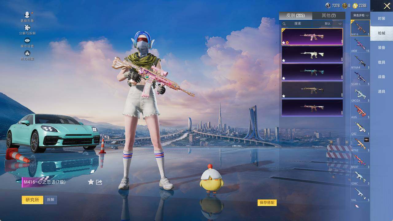 AKM-炫紫旋律,SCAR-L-青春物语,M416-心之恋语,Kar98K-巳巳如意,MG3-炙焰牛王