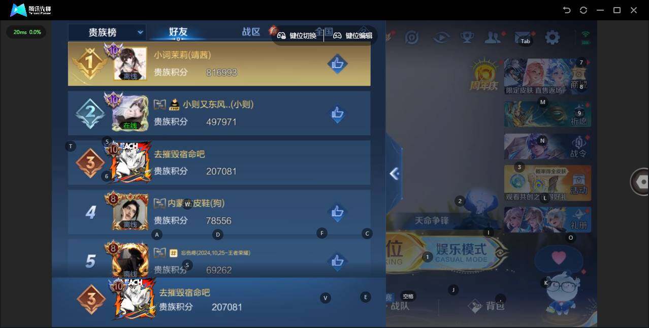 - [11626625]V6 6传说 123英雄 190皮肤 可修改实名 优质装备:一念神魔,零号·赤焰,山海·苍雷引(电光曜子) 传说皮:幻光神枪 珍宝阁皮:蔷薇恋人,玩趣恶龙 限定皮:愿照·九州拓(澜年限),鸣野蒿,至尊宝,五谷丰年,天狼绘梦者,李小龙,霸王别姬-虞姬,猪悟能 史诗皮:鸭鸭历险记-刘禅,器灵·浮梦炉,化蝶舞,龙之律动,石田雨龙,百相守梦-百里守约,电玩小子(小书包),白龙吟,黄金分割率,千年之狐,偶像歌手,冰冠公主,青蛇,猫狗日记-孙策,女仆咖啡,水果甜心,绅士熊喵,星夜王子,功夫厨神,德古拉伯爵,幽灵船长,鬼剑武藏,纤云弄巧,繁星吟游(呼啦呼啦),缤纷独角兽,乘风破浪,水晶猎龙者,曙光守护者,金属风暴,圣诞狂欢,圣诞恋歌,鹰眼统帅,魅力维加斯