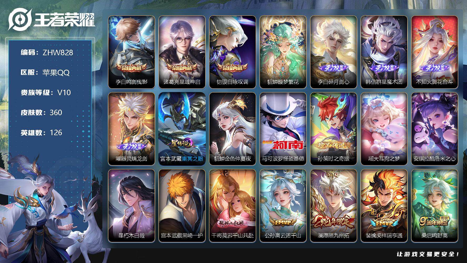 - [12146112]V10 4典藏 1珍品无双 2无双 6珍品传说 53传说 125英雄 394皮肤 可修改实名 优质装备:馥梦繁花,天鹅之梦(小乔典藏),无限飓风号(高达),鸣剑·曳影,碎月剑心(李白无双),器灵·螭龙剑,最初的交响(伽罗典藏),器灵·落星盏,酷洛米之心,大耳狗之梦,朽木白哉,黑崎一护,黄金狮子座,黄金射手座,冠军飞将,绛天战甲(鸡嘴战神),黄金白羊座,猫影幻舞,久胜战神,炽阳神光,一念神魔,末日机甲-孙尚香(绿蚂蚱),地狱火,仲夏夜之梦(大飞蛾),音你心动-小乔,零号·赤焰,地狱之眼,飞鸢探春,胖达荣荣,乞巧织情,游龙清影(小青龙),超时空战士-狄仁杰,无双飞将,浮生妄,鹤羽星尊,灼幽烈阳,惊梅引,霜月吟,澜逐花归海,艾琳觅芳踪,黄金天蝎座 珍品传说:兔狲·蓬尾 传说皮:乘龙·铭钟鼎(赵云年限),貂蝉曦玄引,典韦战鼓燎原,落雪白狼,云诺千山,续相思,星之鸣奏,祥瑞亨通,幻光神枪 珍宝阁皮:万物之道,优雅恋人 限定皮:愿照·九州拓(澜年限),愿照·福禄聚(蔡文姬年限),愿照·岁时盈(虞姬年限),愿照·山河定(司空震年限),愿照·众生和(妲己年限),愿照·千秋盛(女娲年限),鸣野蒿,白虎志(电光耗子),凤求凰(白切鸡),凤凰于飞,梅西,傲雪梅枪,魔法小厨娘,时雨天司(水龙头),神威(电光马子),至美·乘鲤谣,至美·化雀舞,遇见飞天,诗剑行,怒海麟威,冰锋战神,梁祝,天狼狩猎者,祈雪灵祝(雪兔子),李小龙,逐梦之影,圣诞老人,引擎之心,冰霜恋舞曲,女儿国国王,神器·万象笔 史诗皮:赞萌露比,鸭鸭历险记-刘禅,苍鳞隐世,器灵·浮梦炉,狼魂孤将,化蝶舞,龙之律动,灵蛊蚀心,琥珀纪元伽罗,雪豹·霜爪,星界战将,藏狐·褐绒,布丁狗之誓,小牛鸭,石田雨龙,百相守梦-周瑜,戍鼓铭心,茶境仙,星界特工,战舞者,芈月浮光幕影,海诺心动手记,蔬乡物语(鲁班七号),遇见神鹿,紫霞仙子,苍穹之光,电玩小子(小书包),白龙吟,黄金分割率,特工魅影,千年之狐,白蛇,浮梦罗烟,末日机甲-莱西奥,高渐离燃音魔法,蒙恬荣光圣徽,魅语,无限星赏官,晚萤,偶像歌手,完美假期,龙骑士(小龙虾),暗夜猫娘,末日机甲-吕布,猫狗日记-孙策,时之恋人-孙尚香,乱世虎臣,节奏热浪,修罗,女仆咖啡,摇滚巨星,水果甜心,绅士熊喵,天才门将,星夜王子,心灵骇客,功夫厨神,德古拉伯爵,暗隐猎兽者,幽灵船长,鬼剑武藏,暗渊