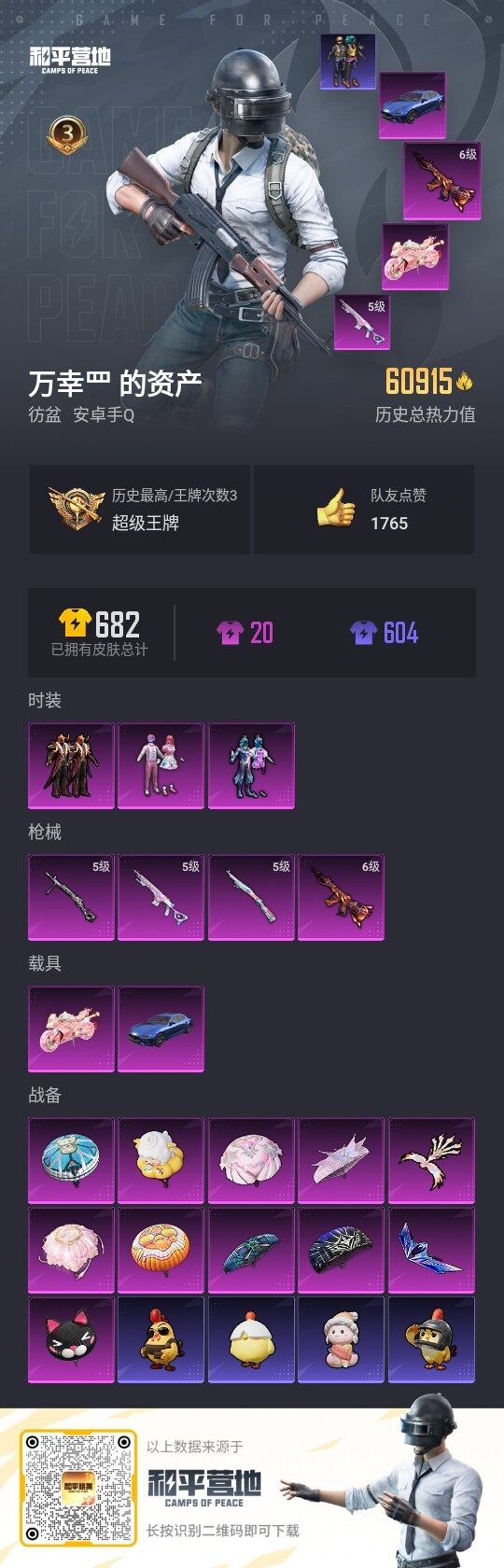 - [12945244]【暑期末清货/特价急出/永久包赔】:安卓 手Q-1粉装-1特效枪-1载具-2w热力值-1印记-69套装-63枪皮【稀有载具】:玛莎拉蒂Ghibli(蓝)【特效枪等级】:AKM-绿萝繁花(四级)【优质套装】:角色-猩猩队长