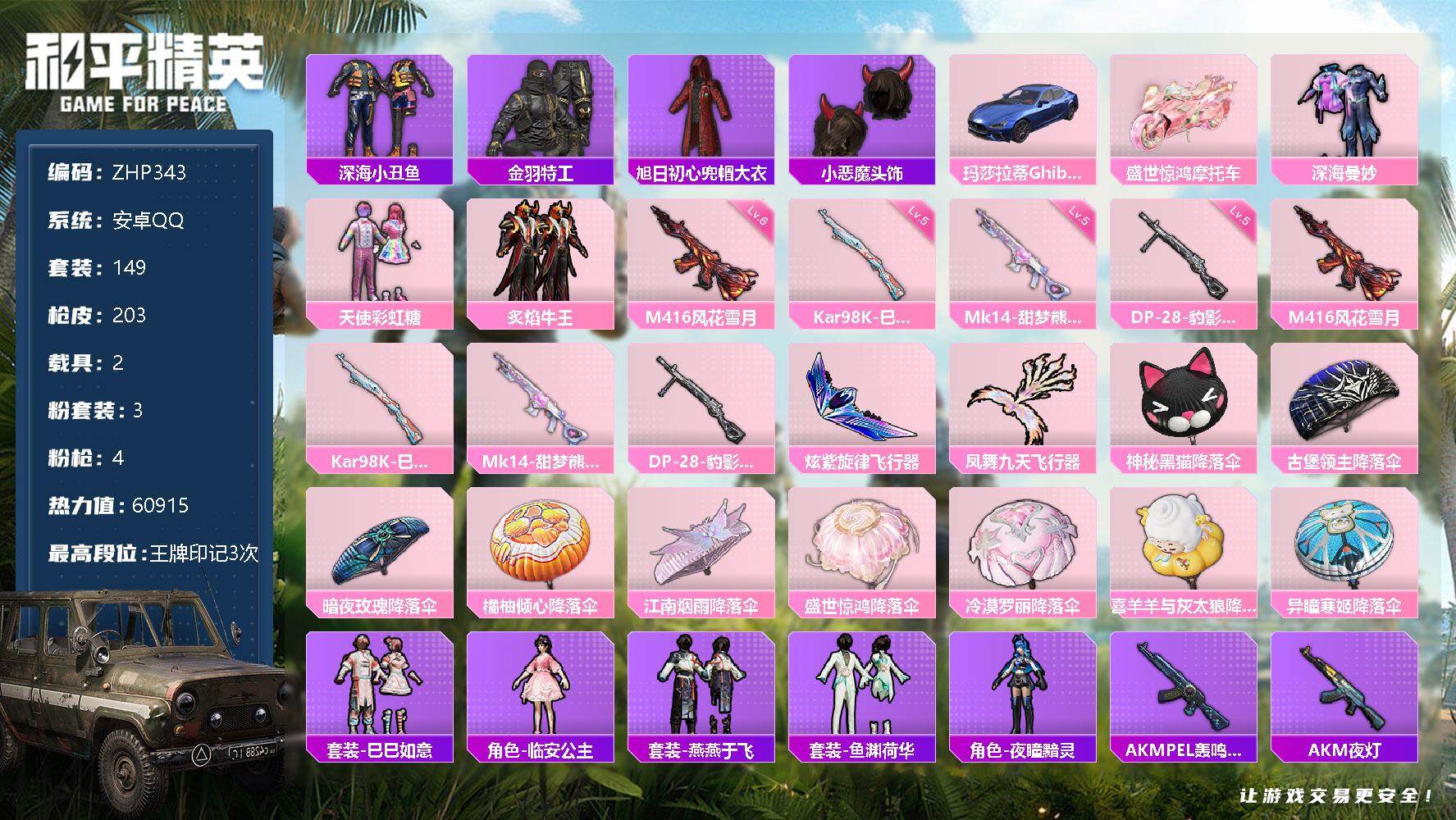 [13099008]地铁满天赋 安卓 手Q-3粉装-4特效枪-2载具-2粉色飞行器-6w热力值-3王牌印记-149套装-203枪皮【热门品类】:套装-深海小丑鱼,套装-金羽特工,旭日初心兜帽大衣,小恶魔头饰【粉色载具】:玛莎拉蒂Ghibli(蓝),盛世惊鸿摩托车【粉色套装】:粉装-深海曼妙,粉装-天使彩虹糖,粉装-炙焰牛王【粉色枪皮等级】:M416-风花雪月(六级),Kar98K-巳巳如意(五级),Mk14-甜梦熊击(五级),DP-28-豹影疾电(五级)【粉色飞行器】:炫紫旋律飞行器,凤舞九天飞行器