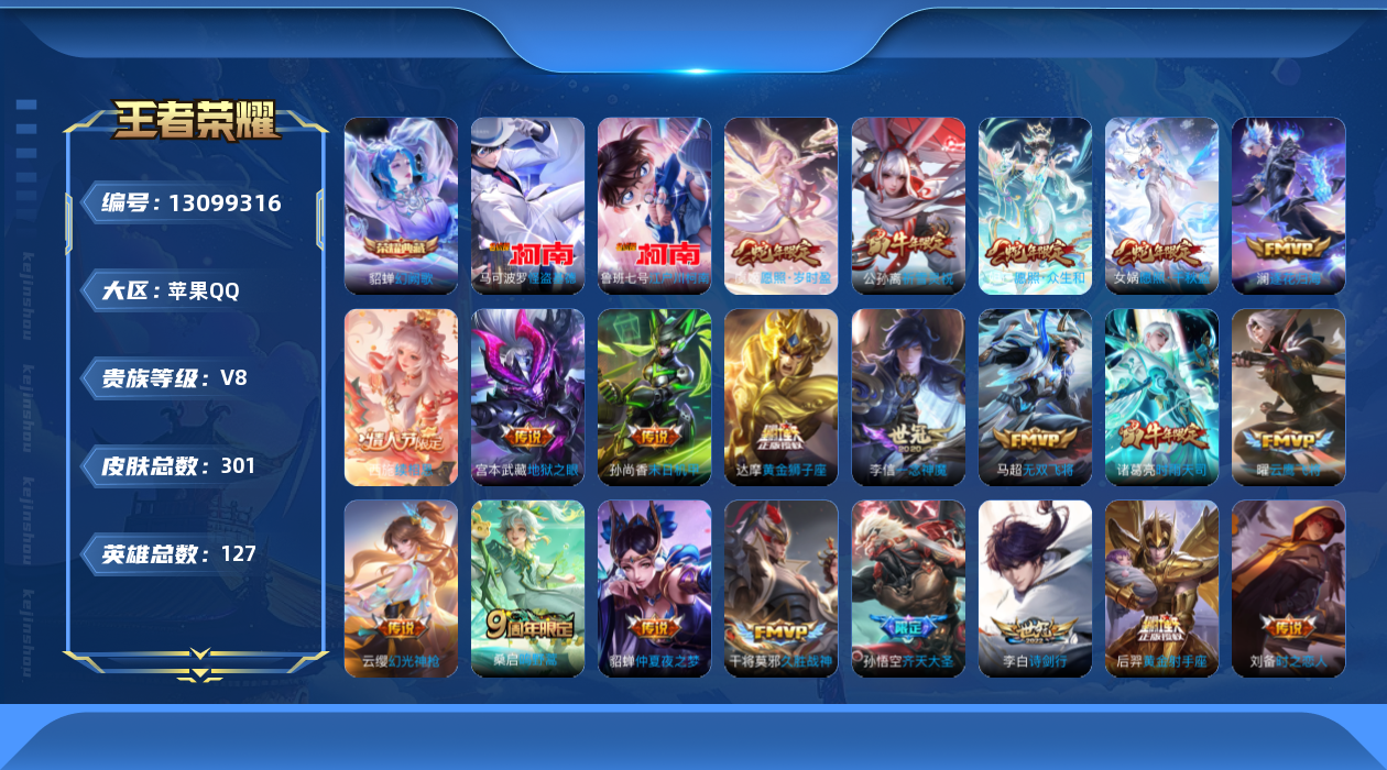 [13099316]苹果Q-V8-最强王者段位-125英雄-293皮肤-1典藏-0珍品无双-0无双-2珍品传说-30传说-91史诗