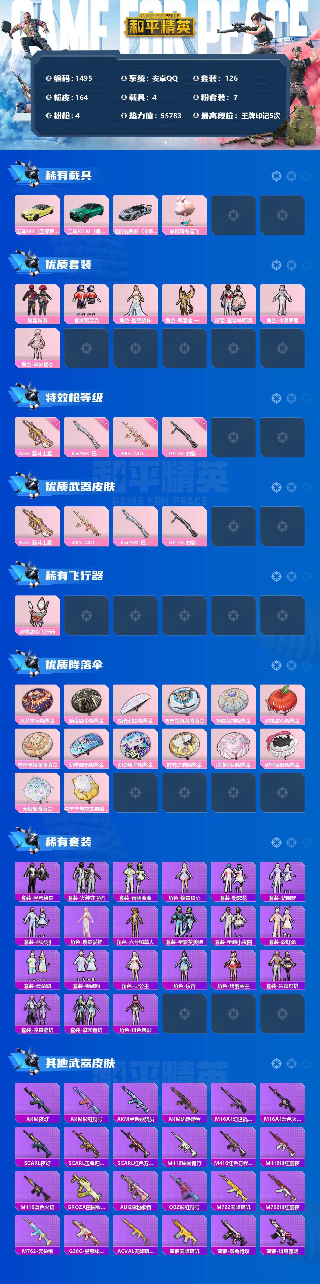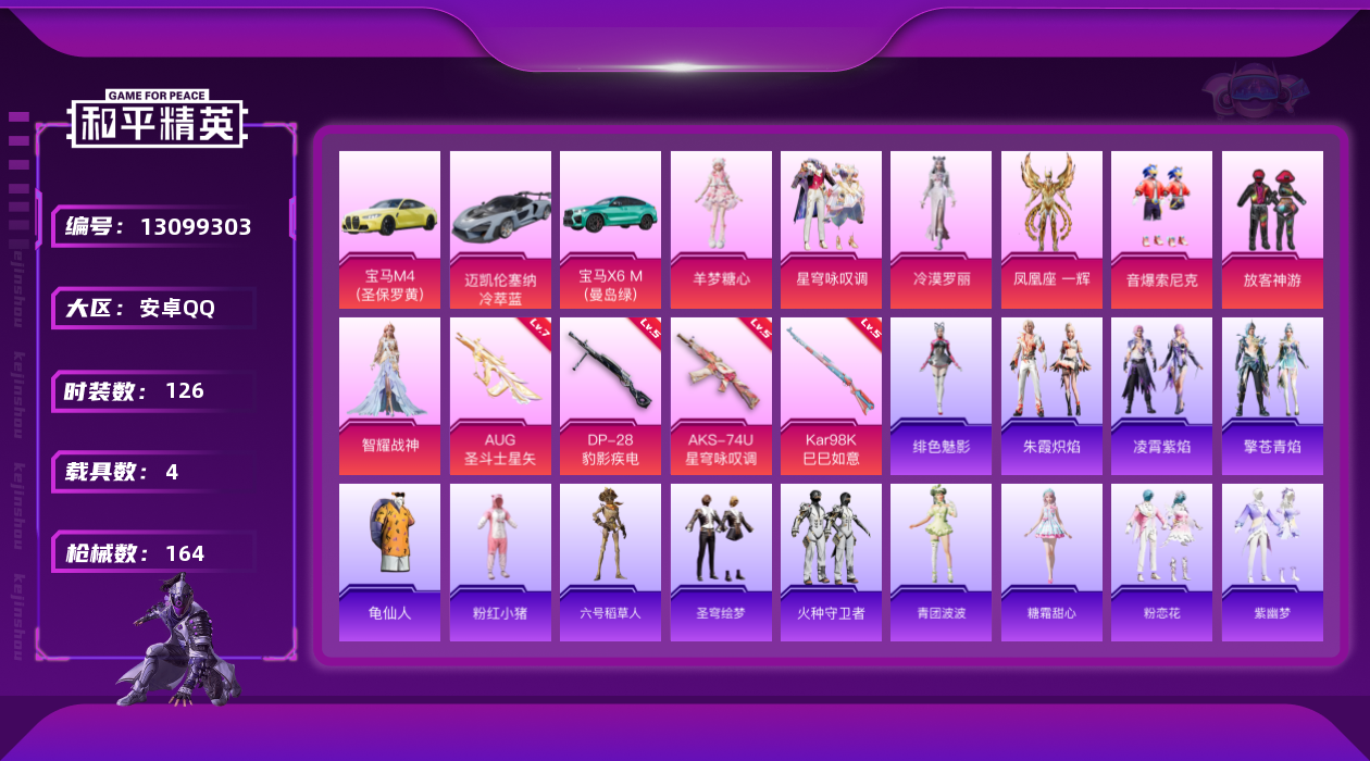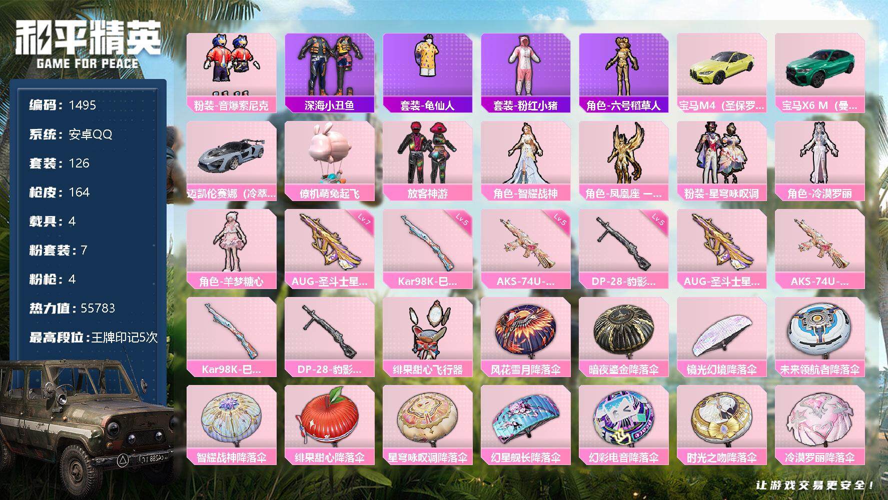 [13099303]安卓 手Q-7粉装-4特效枪-4载具-1粉色飞行器-55783热力值-5王牌印记-126套装-164枪皮 【热门品类】:粉装-音爆索尼克,套装-深海小丑鱼,套装-龟仙人,套装-粉红小猪,角色-六号稻草人 【粉色载具】:宝马M4(圣保罗黄),宝马X6 M(曼岛绿),迈凯伦塞纳(冷萃蓝),僚机-萌兔起飞 【粉色套装】:粉装-放客神游,粉装-音爆索尼克,角色-智耀战神,角色-凤凰座 一辉,粉装-星穹咏叹调,角色-冷漠罗丽,角色-羊梦糖心 【粉色枪皮等级】:AUG-圣斗士星矢(七级),AKS-74U-星穹咏叹调(五级),Kar98K-巳巳如意(五级),DP-28-豹影疾电(五级) 【粉色枪皮】:AUG-圣斗士星矢,AKS-74U-星穹咏叹调,Kar98K-巳巳如意,DP-28-豹影疾电 【粉色飞行器】:绯果甜心飞行器 【粉色降落伞】:风花雪月降落伞,暗夜鎏金降落伞,镜光幻境降落伞,未来领航者降落伞,智耀战神降落伞,绯果甜心降落伞,星穹咏叹调降落伞,幻星舰长降落伞,幻彩电音降落伞,时光之吻降落伞,冷漠罗丽降落伞,绯穹魔姬降落伞,无垠阁降落伞,喜羊羊与灰太狼降落伞 【稀有套装】:套装-龟仙人,套装-圣穹绘梦,套装-火种守卫者,套装-青团波波,角色-糖霜甜心,套装-粉恋花,套装-紫幽梦,套装-蓝冰羽,角色-瑰梦爱神,角色-六号稻草人,套装-星影赞美诗,套装-星渊小夜曲,套装-彩虹兔,套装-云朵鹅,套装-雪绒豹,角色-灵公主,角色-乐音,角色-绛羽幽主,套装-朱霞炽焰,套装-凌霄紫焰,套装-擎苍青焰,角色-绯色魅影 【稀有枪皮】:AKM-夜灯,AKM-彩虹符号,AKM-星兔领航员,AKM-灼热熔岩,M16A4-幻世战舞者,M16A4-蓝色火焰,SCAR-L-夜灯,SCAR-L-玉兔迎春,SCAR-L-红色方程式,M416-糯团青竹,M416-红色方程式,M416-绯红前夜,M416-蓝色火焰,GROZA-田园牧歌,AUG-耀粉歌者,QBZ-彩虹符号,M762-天降萌叽,M762-绯红前夜,M762-云朵鹅,G36C-星穹咏叹调,AC-VAL-天降萌叽,蜜獾-天降萌叽,蜜獾-绯穹魔姬,蜜獾-御兔特攻,ARX-凌霄紫焰,UZI-啾咪啾咪,UZI-天降萌叽,UZI-影袭,UZI-红色方程式,UMP45-夜灯,UMP45-涂山之恋,UMP45-蓝色火焰,UMP45-圣穹绘梦,Vector